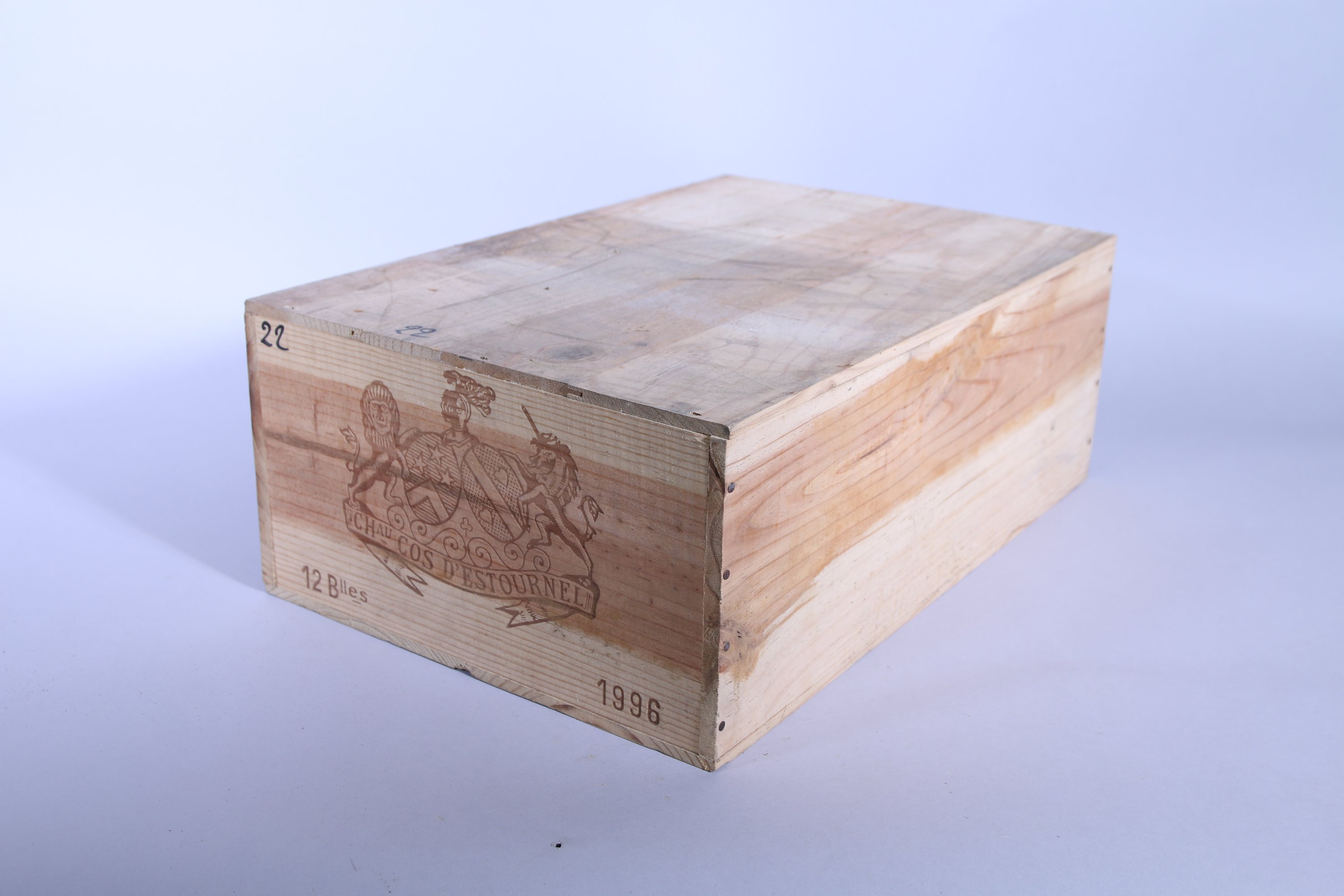 Saint-Estèphe, Château Cos d'Estournel, 2ème Grand Cru classé, 1996, 12 bouteilles. Caisse en bois d'origine (numérotation au feutre).