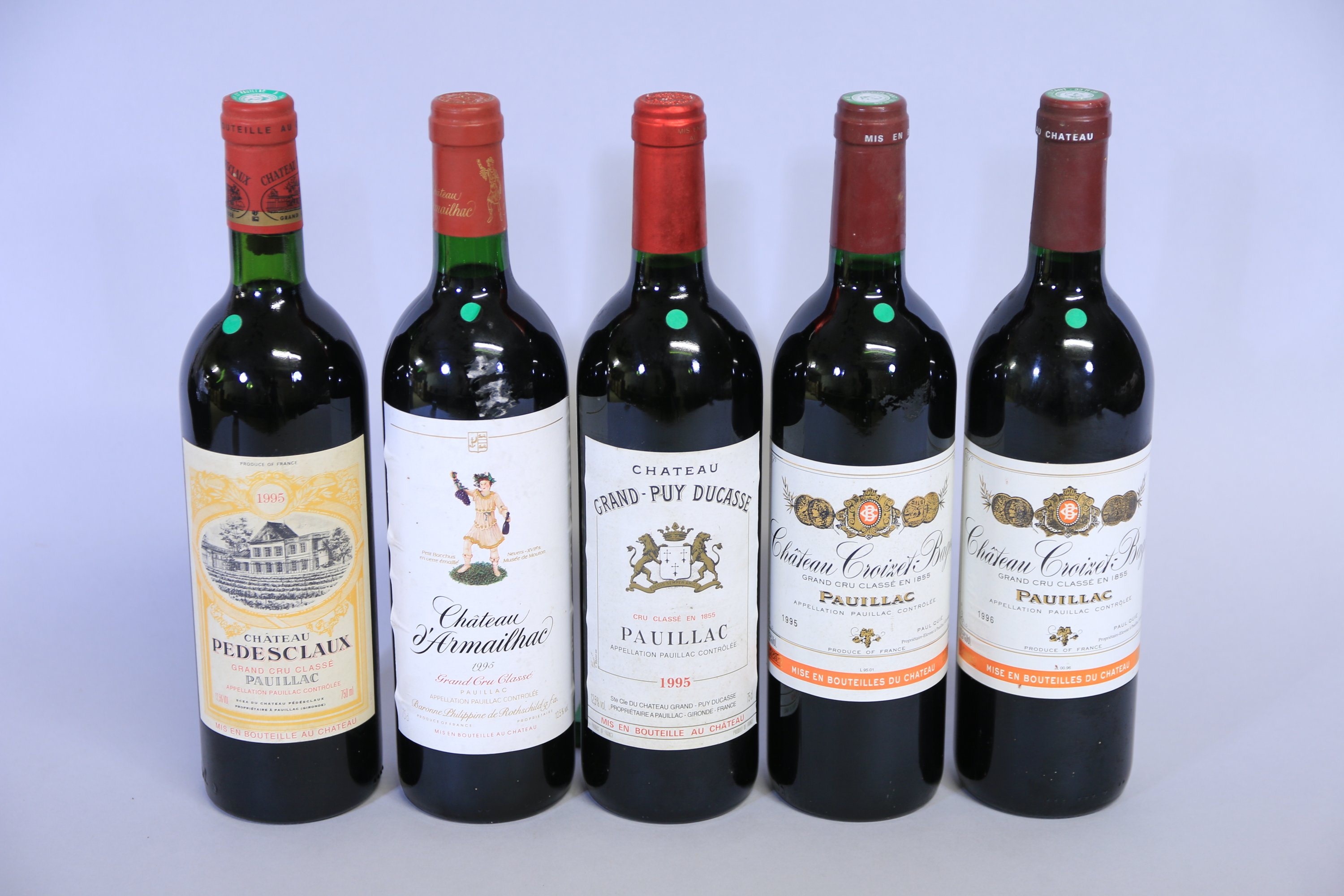 - Château Pedesclaux, 5ème Grand cru classé, 1995, 1 bouteille. Niveau: Très légèrement bas. Etiquette: Très bon état. Capsule: Petite pliure.