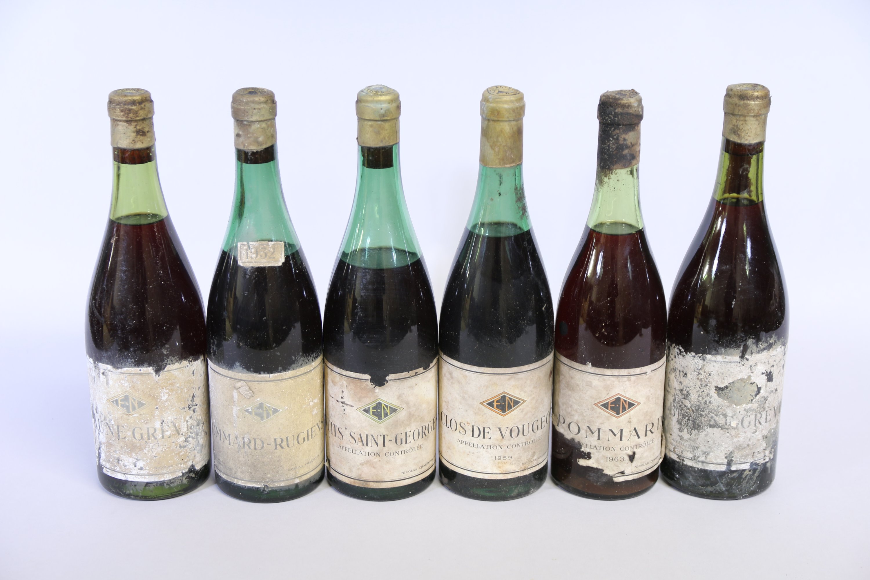 Bourgogne, Nicolas Charenton, 12 bouteilles, la plupart aux millésimes non identifiés: Clos de la Roche 1 bouteille, Charmes-Chambertin 1 bouteille, Clos de Vougeot 1 bouteille, Pommard 1 bouteille, Pommard-Rugiens 1952 1 bouteille, Clos Saint-Denis 1 bouteille, Beaune Grèves 2 bouteilles, Beaune 1959, Nuits-Saint-Georges 1 bouteille, Volnay-Chevrey 1 bouteille.