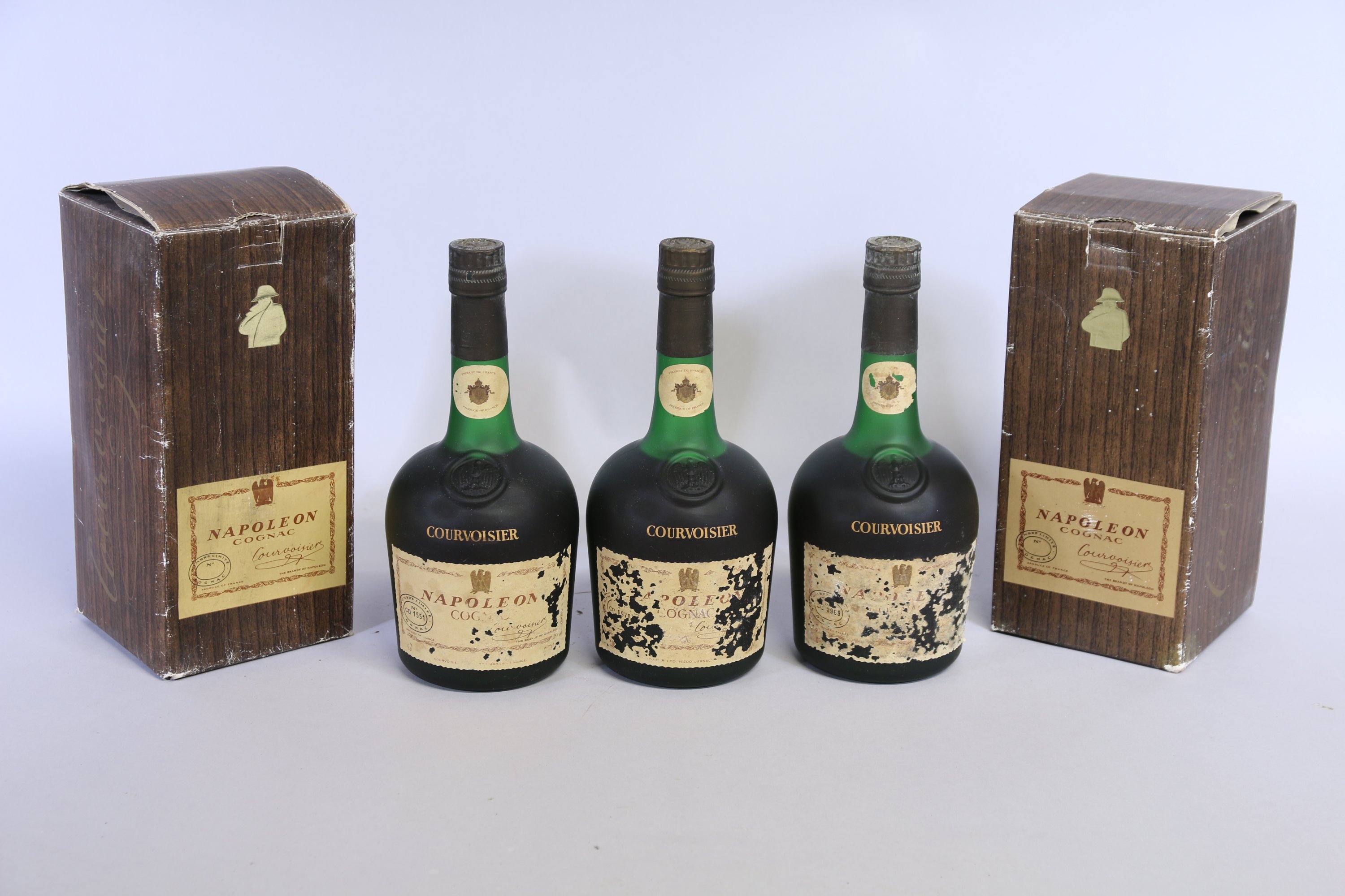 Cognac, Courvoisier, "Napoléon", 3 bouteilles numérotées. Deux dans leurs coffrets.
