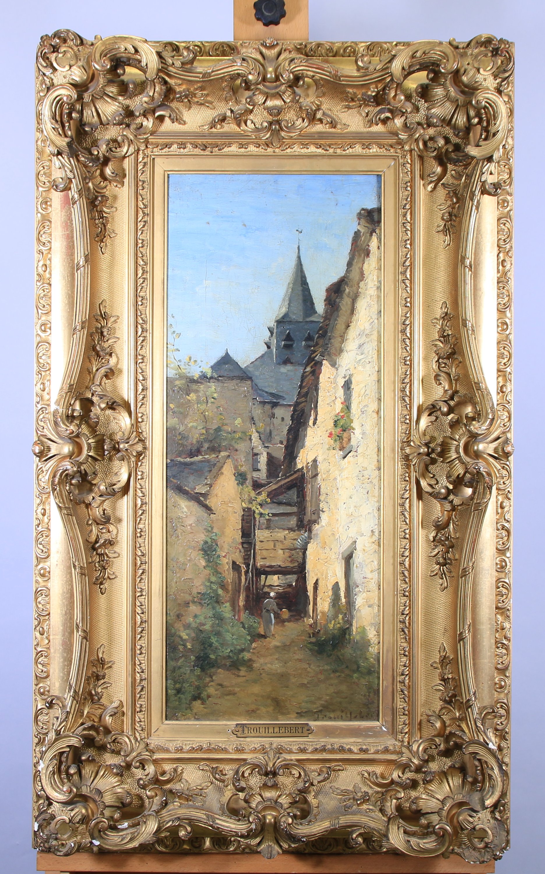 Cadre en bois et stuc doré richement orné d'acanthes et de fleurs portant un cartouche "Trouillebert"