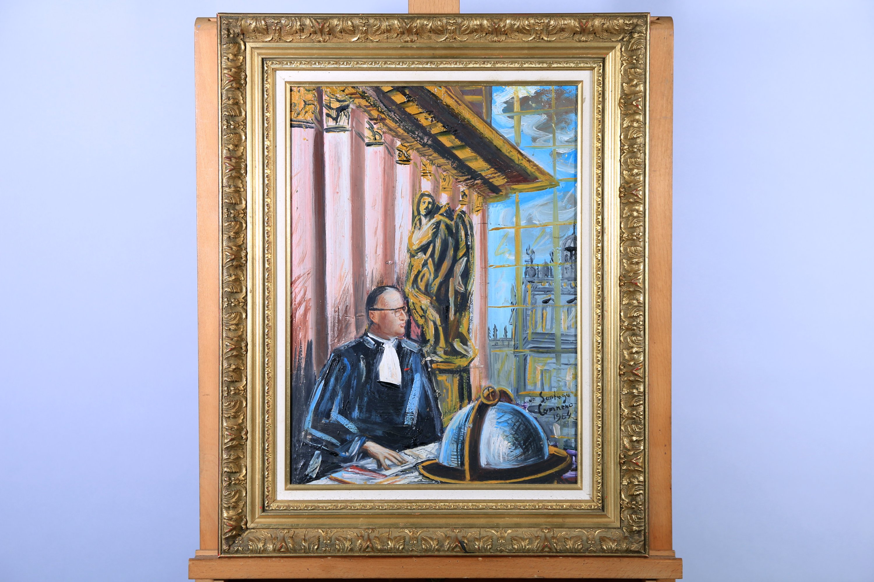 Notre tableau est un vibrant hommage du peintre à son avocat, René Floriot. En 1964, Georges Commène est accusé de "contrefaçon en raison des nombreux pastiches d'œuvres de maîtres contemporains, qu'il admet avoir fabriqués". Commène imite par exemple Bernard Buffet ou Maurice Utrillo. Il est défendu par René Floriot.