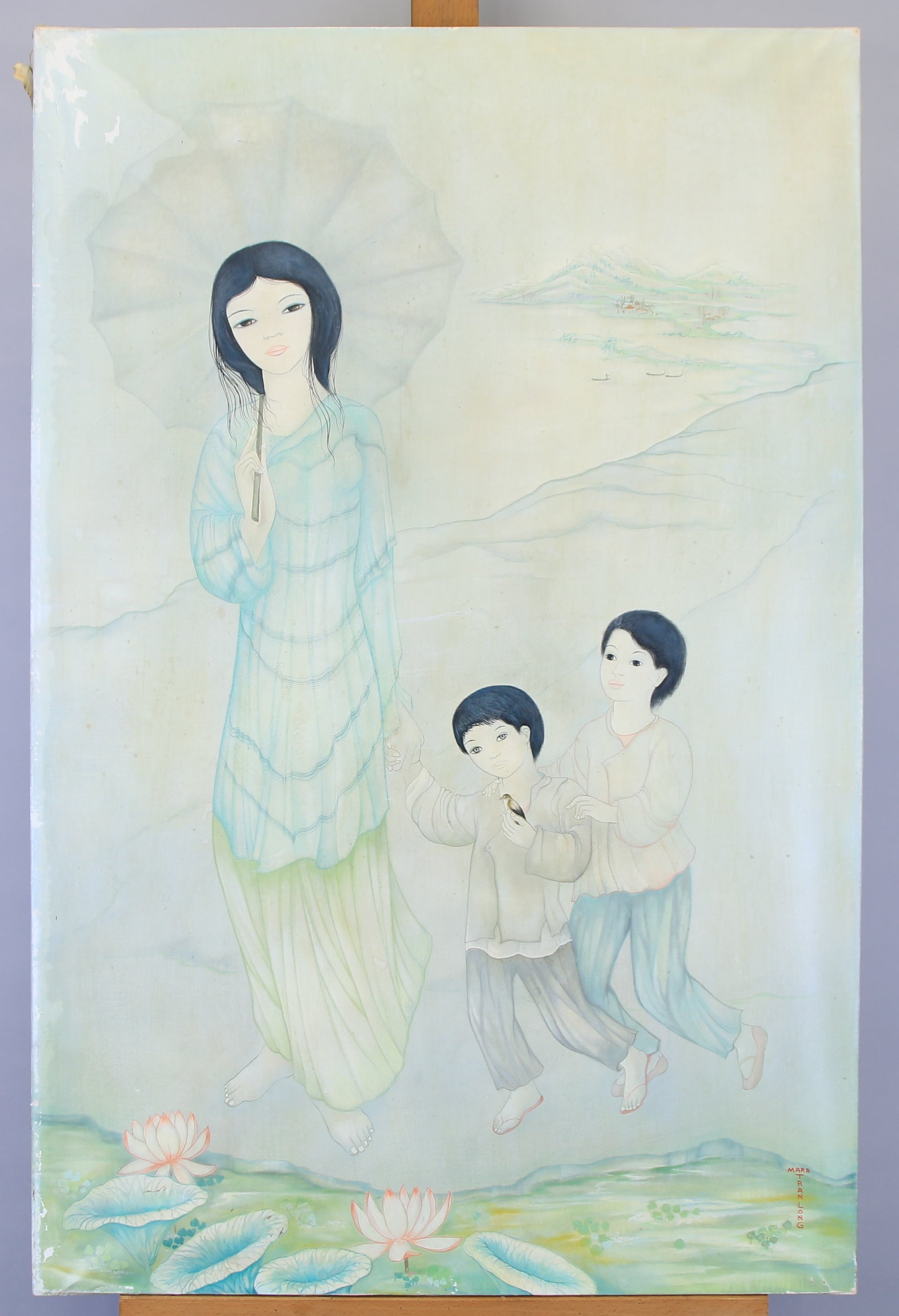 Peinture sur soie montée sur châssis.