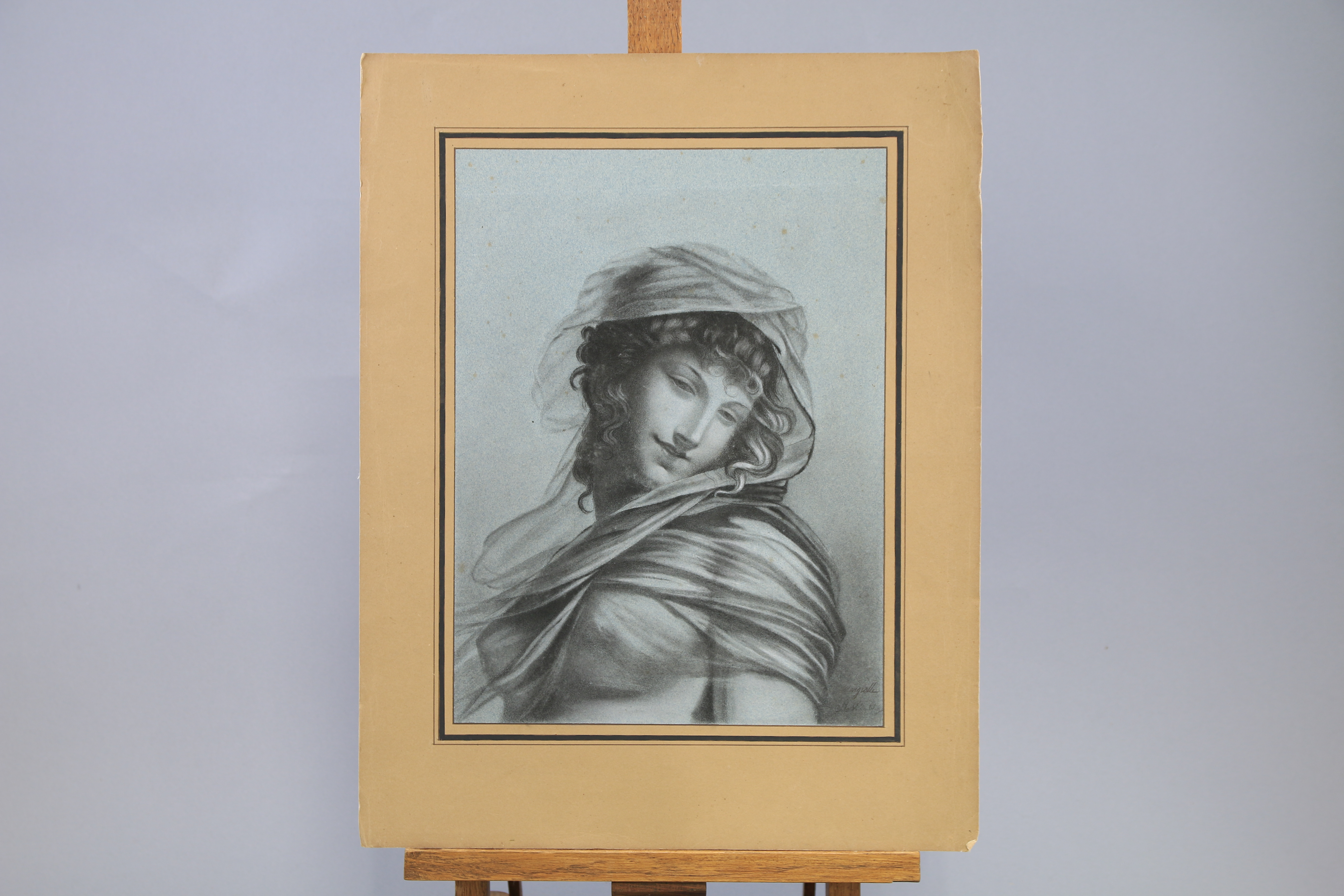 - Buste de femme à l'antique à la manière noire sur papier bleu (Haut. 36 Larg. 27 cm).