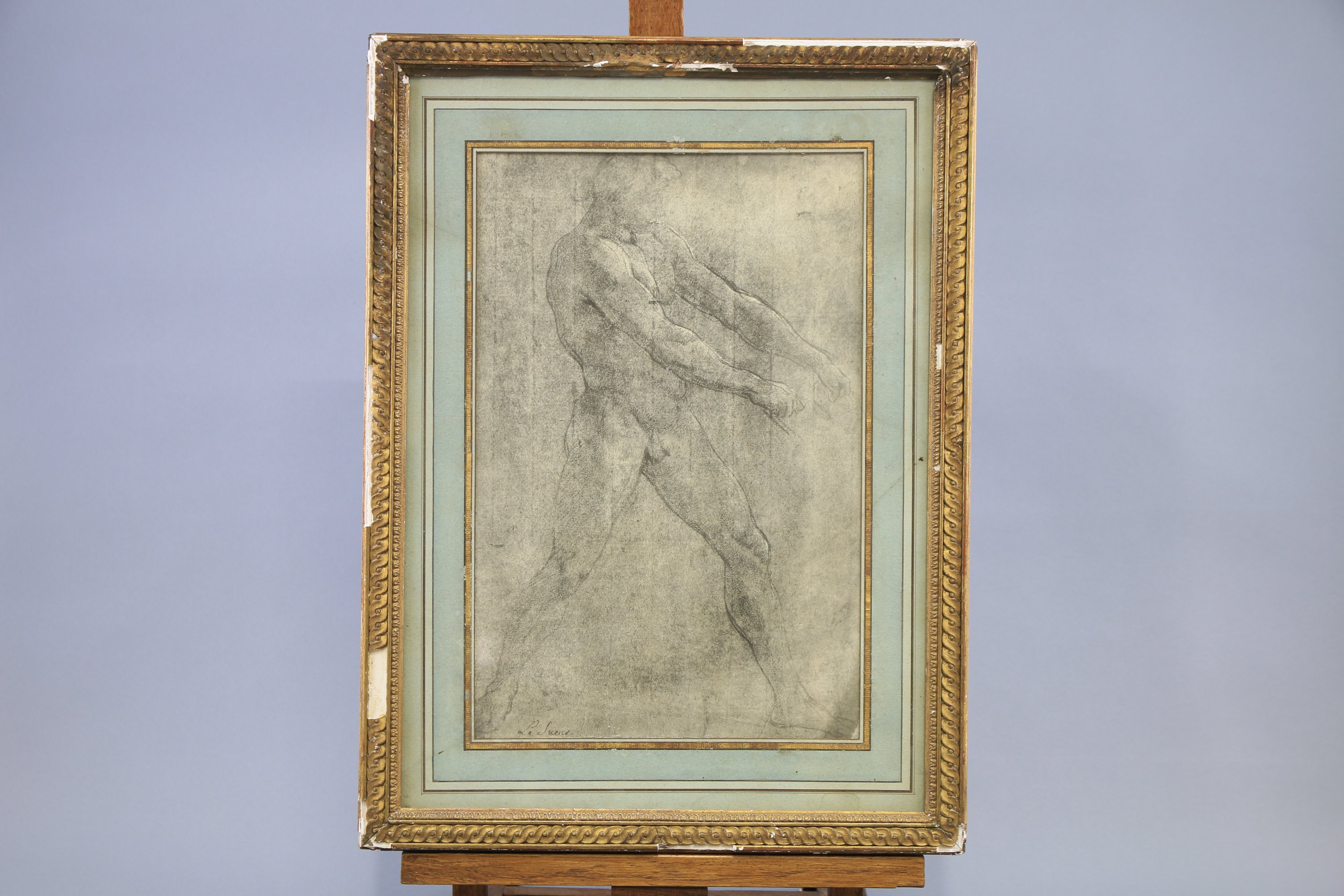 - Reproduction d’après LE SUEUR, Académie d’homme Haut. 36 Larg. 23,5 cm Cadre en stuc doré. Haut. 50 Larg. 37 cm., Reproduction d’un dessin conservé au Louvre