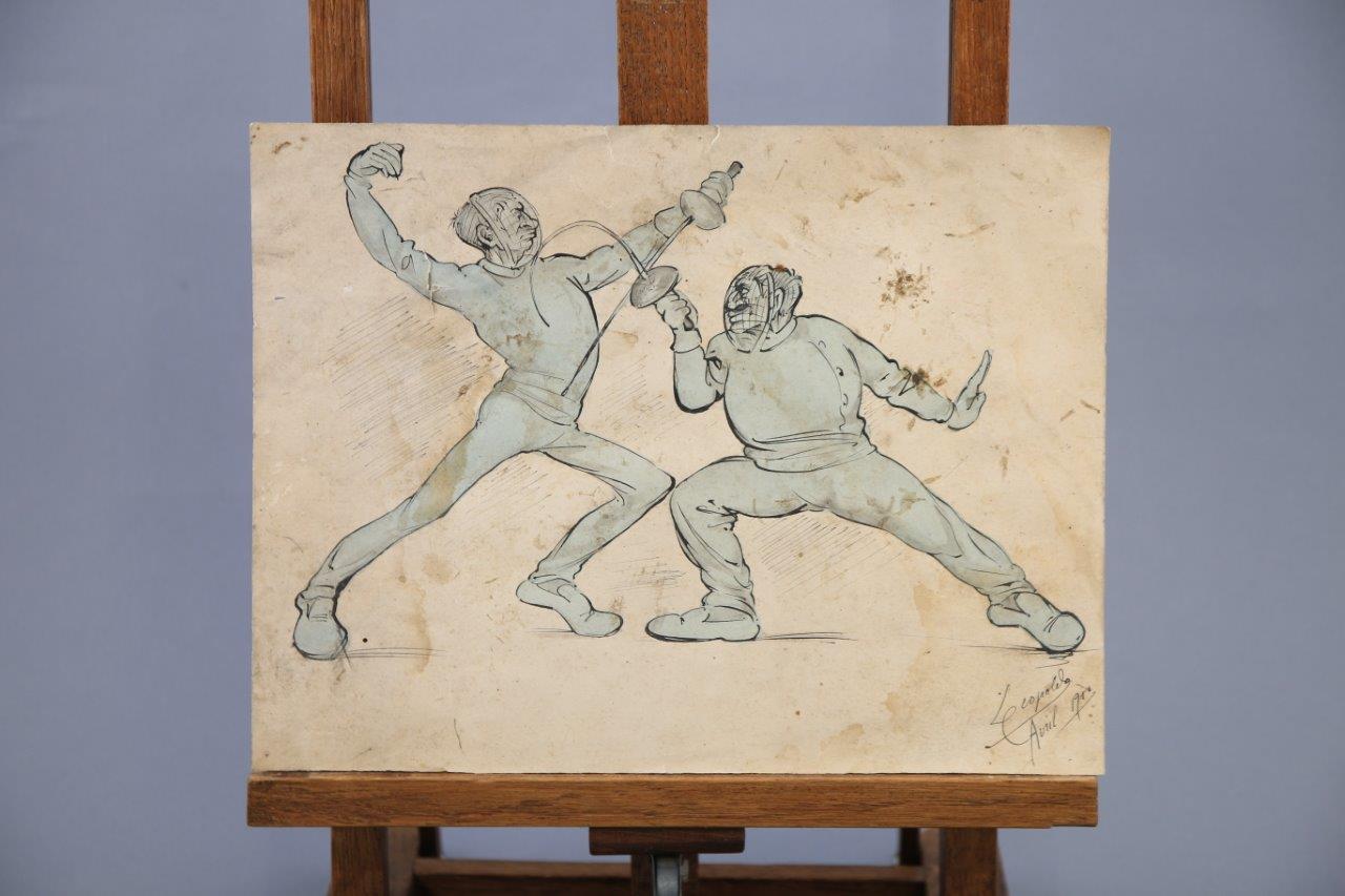 - Les escrimeurs, aquarelle et encre, signée et datée "Léopoled Avril 1910". Haut. 24 Larg. 32 cm. (taches, traces d'humidité et petites déchirures dans les marges)