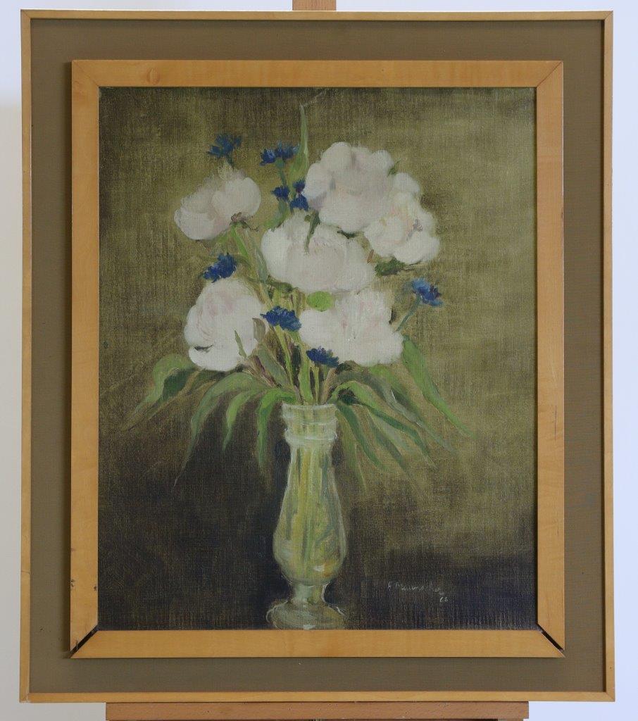 - André Brauneker (Français, né en 1926), Bouquet de fleurs, 1968, Toile marouflée. Signée et datée en bas à droite. Haut. 50 Larg. 60,5 cm. Cadre en bois et tissus (Haut. 77 Larg. 66 cm).