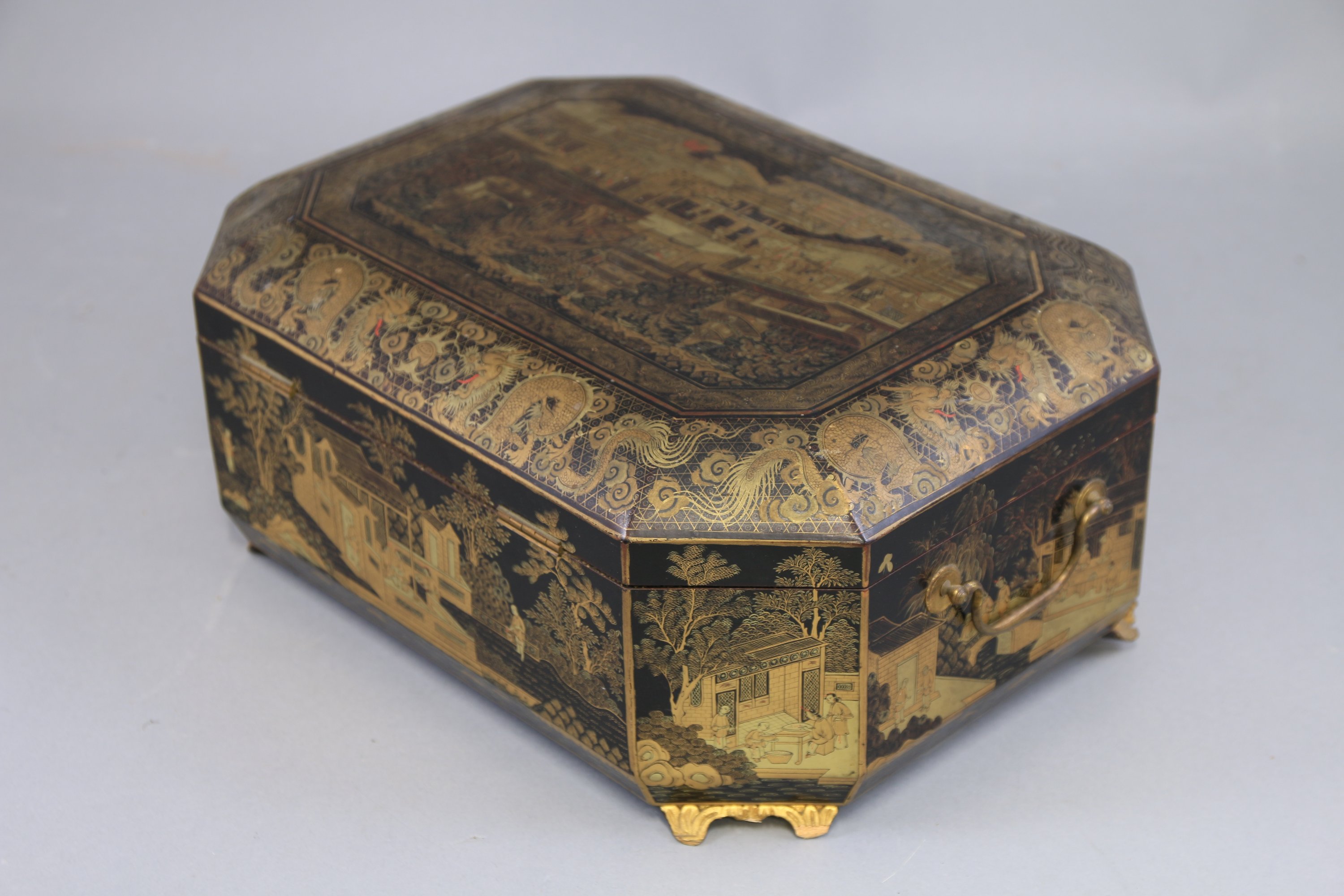 Le couvercle est décoré en son centre d'une scène animée dans un cartouche et de dragons pourchassant la perle sacrée. Il découvre un plateau amovible et s'ouvre par un tiroir en façade. Les côtés à décor de scènes animées. Elle repose sur quatre pieds en bois sculptés et dorés.