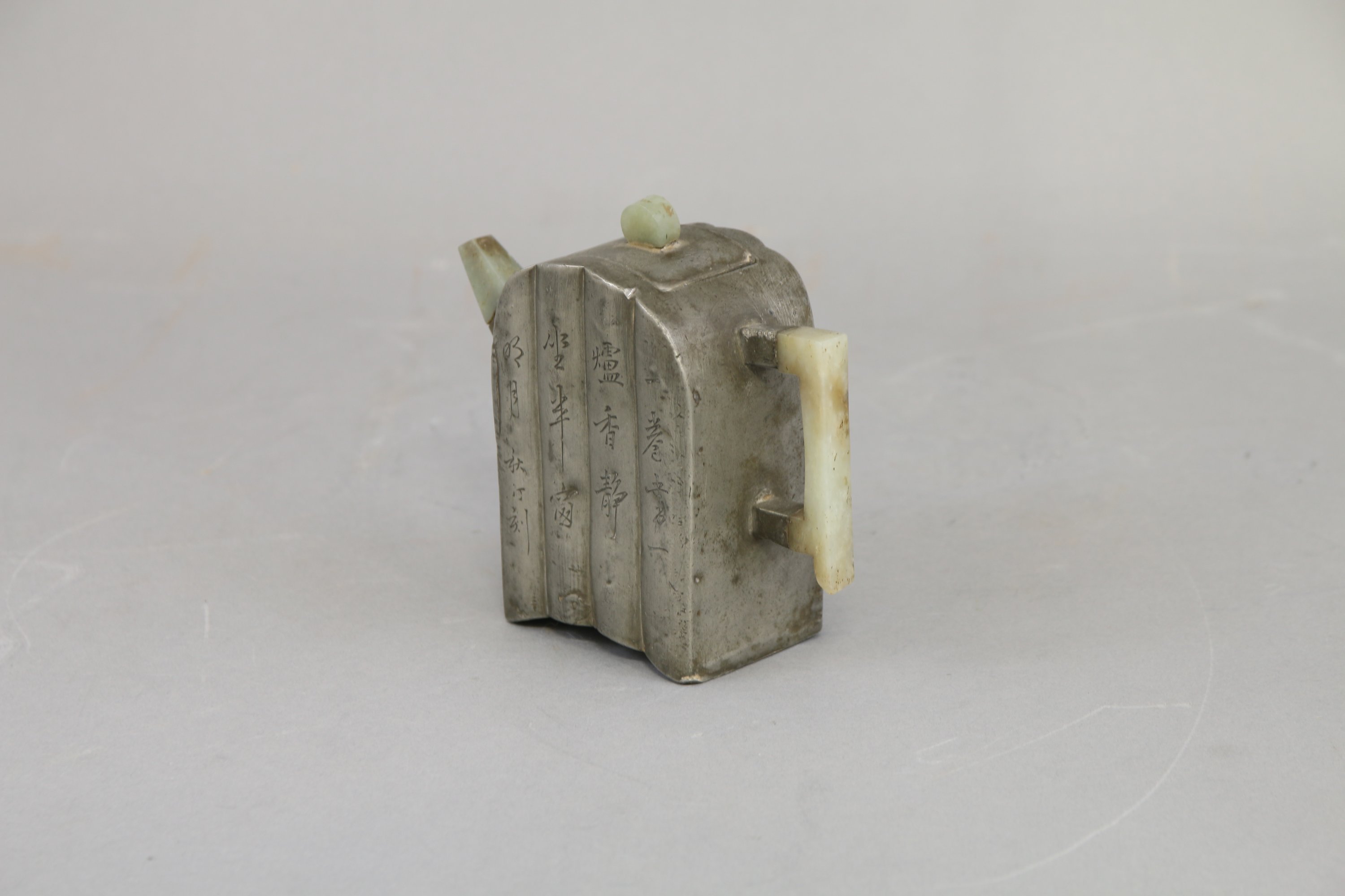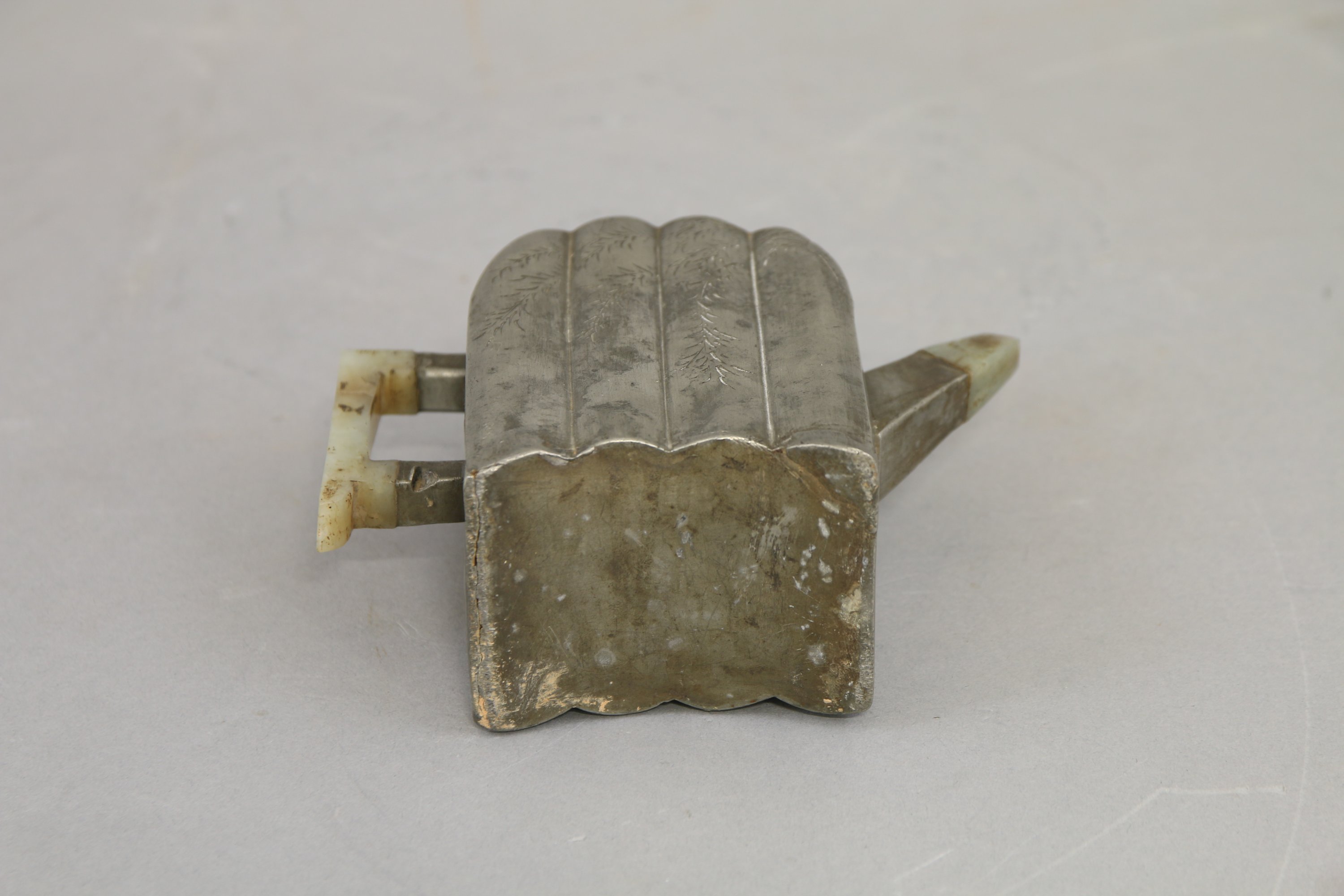 A décor cannelé, la panse gravée de motif de feuilles et idéogrammes. Le fretel, le bec et l'anse en jade (?)