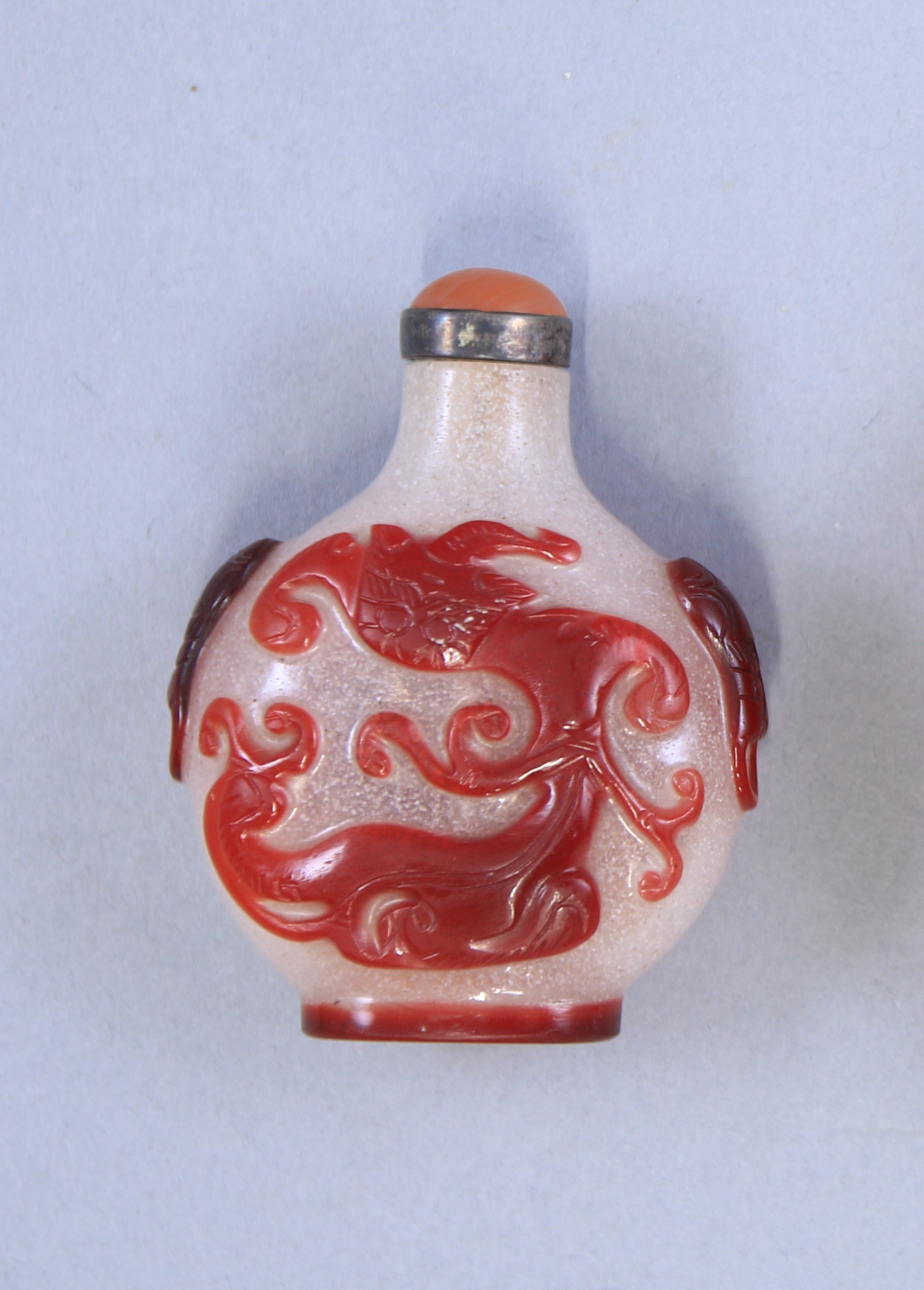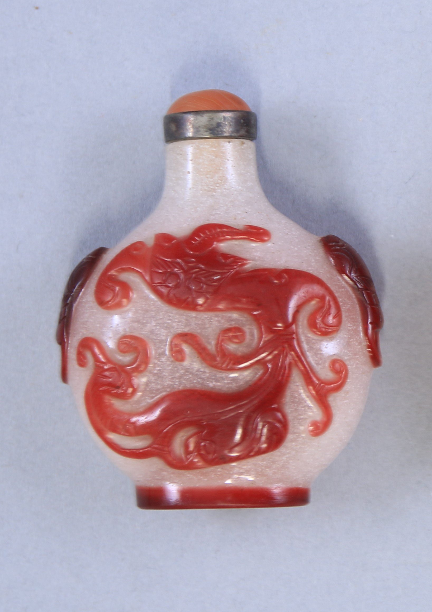 Verre overlay rouge sur fond bullé d'un chilong sur chaque face, les côtés flanqués de têtes de lion soutenant des anneaux.