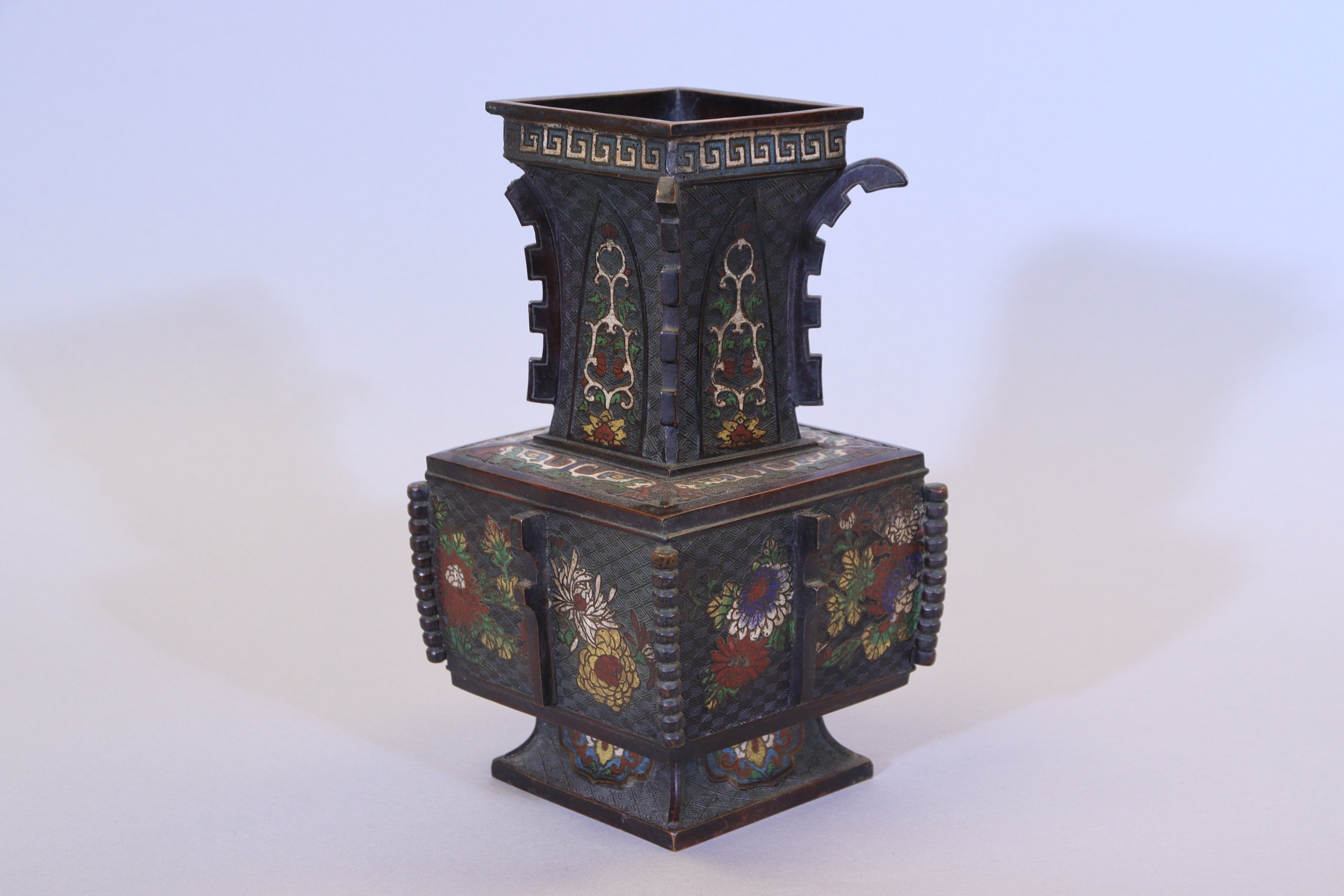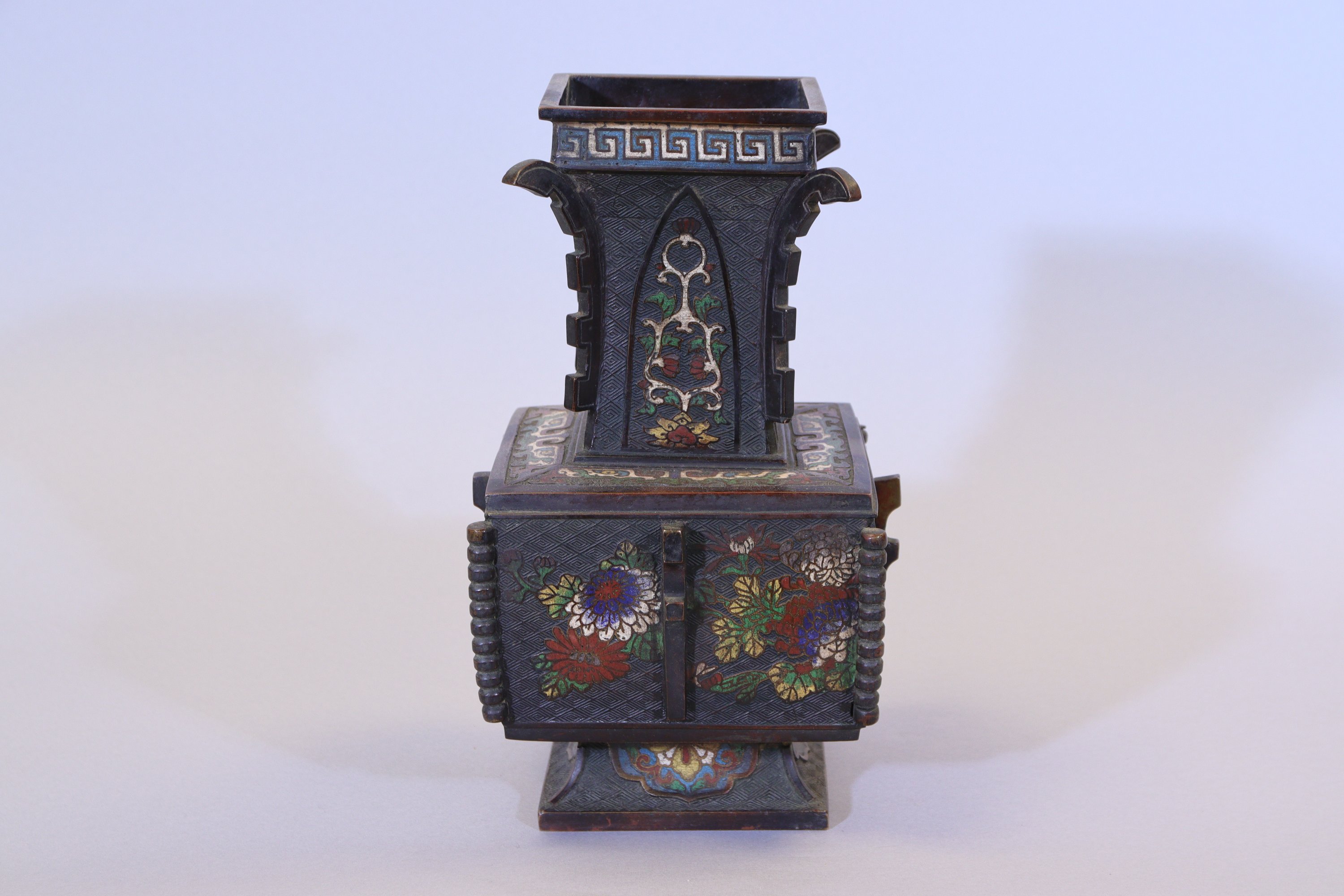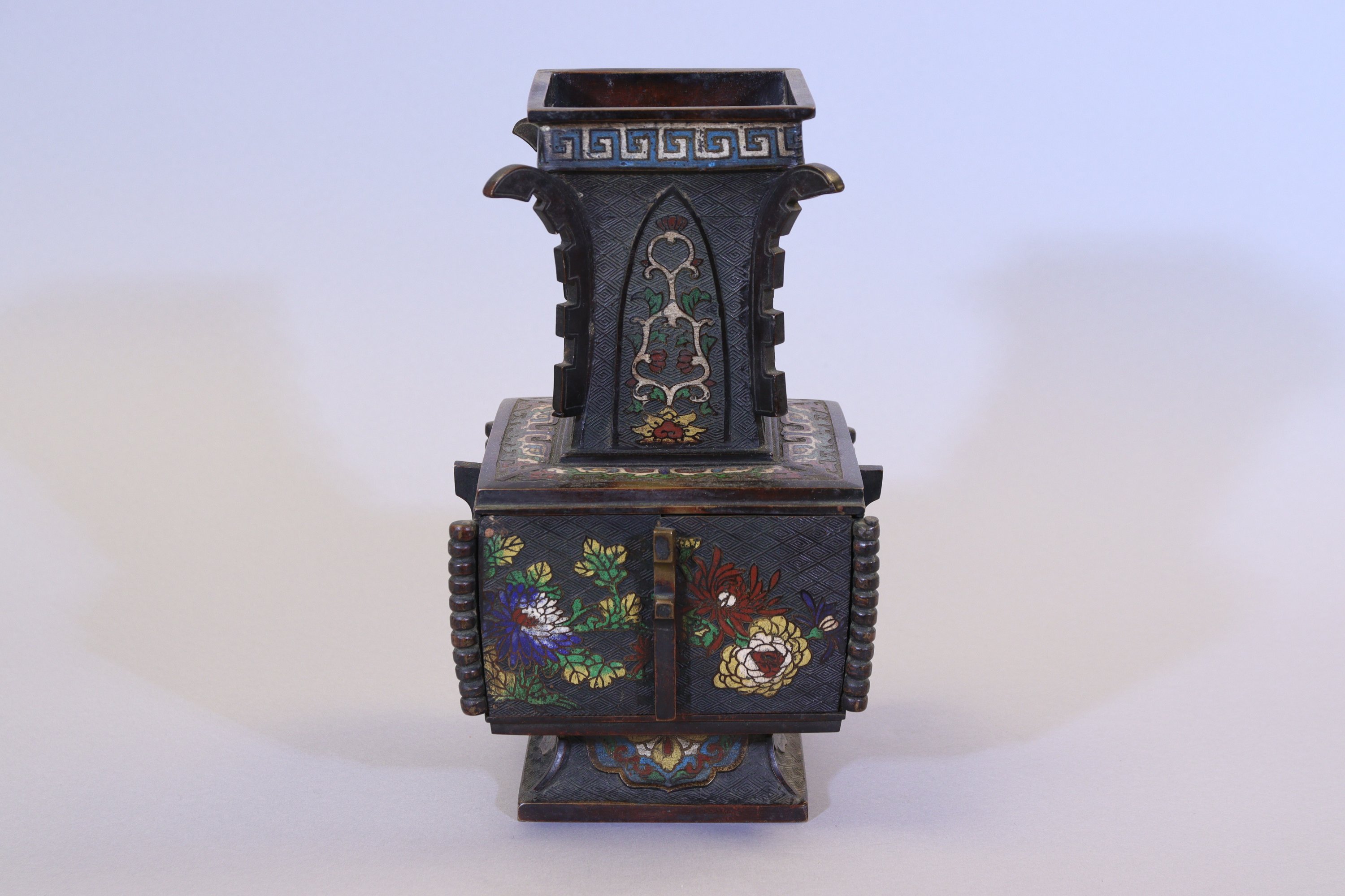 Bronze à patine brune et émaux cloisonnés, à décor de pivoines et chrysanthèmes.