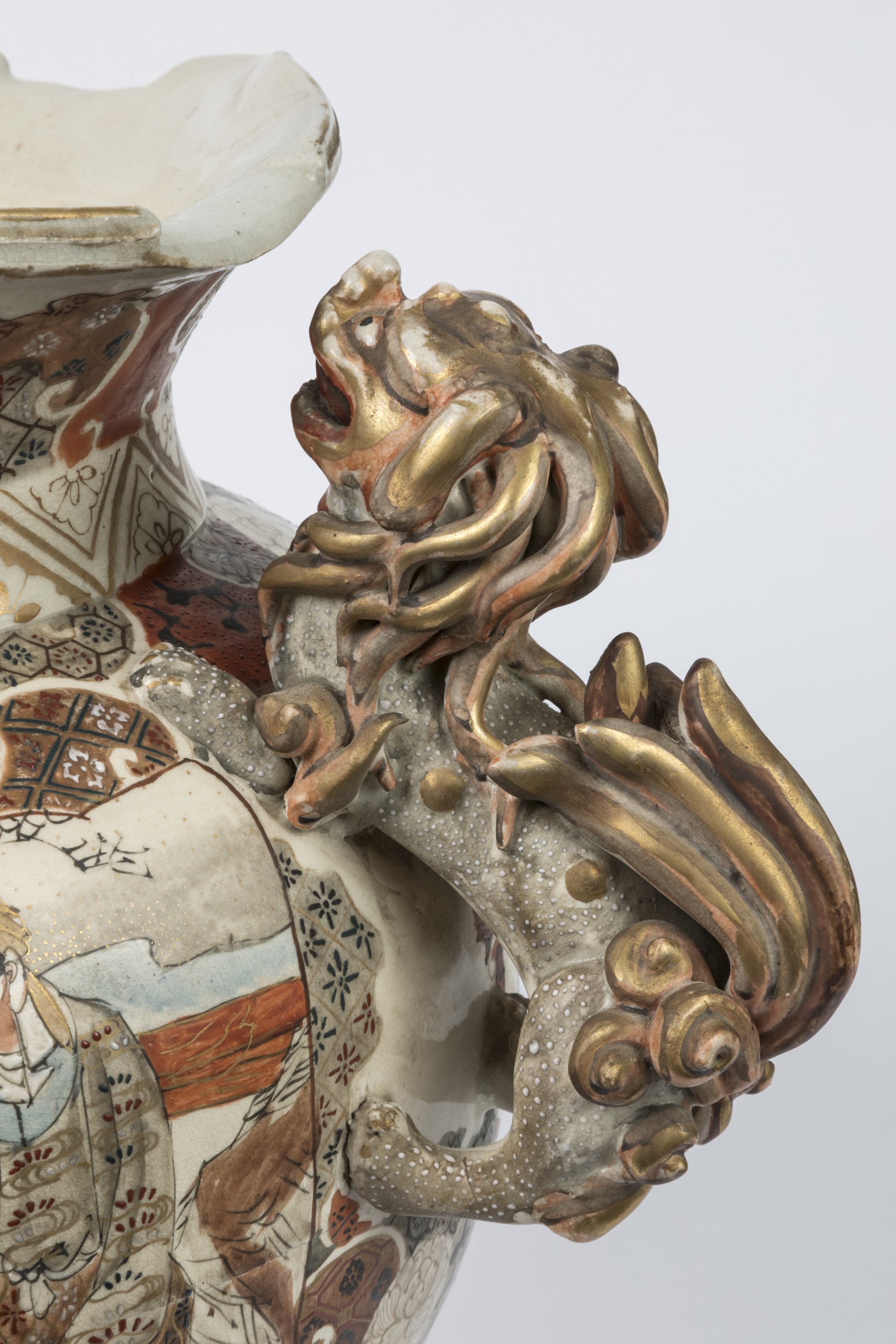 Dignitaires assis d'un côté et rakan et enfant de l'autre, sur fond de motif de brocard, les pieds en forme de tête de lion, la panse flanquée de deux shishi formant anses, le couvercle surmonté d'un shishi tenant une balle.