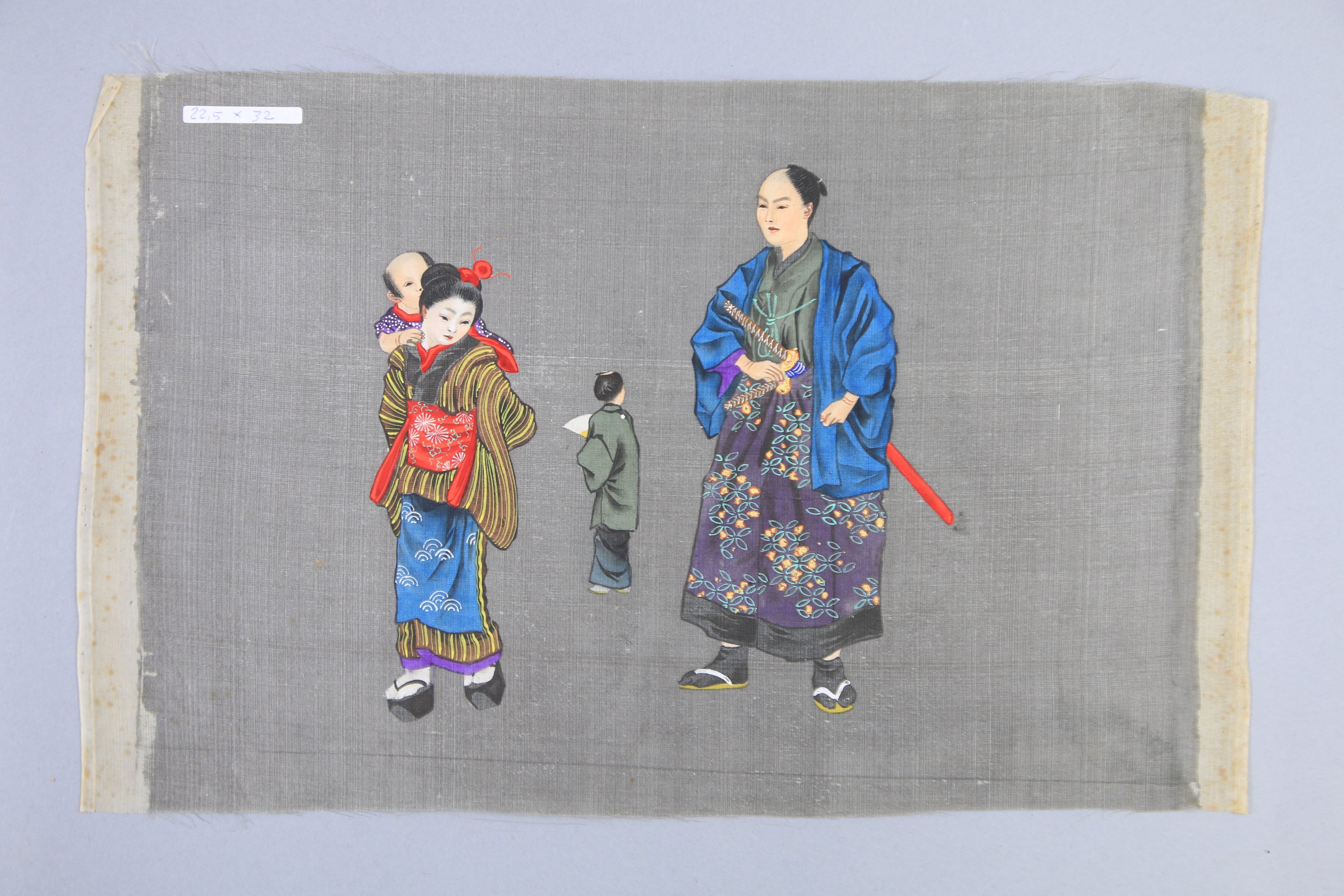 - trois encres sur soie, samouraï, jeunes femmes et enfants. Haut. 22 Larg. 35 cm