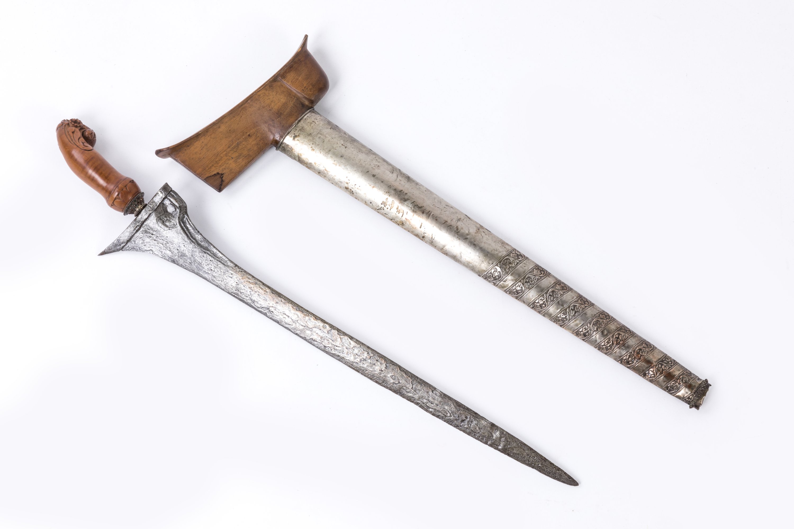 Poignée en bois clair sculpté. Lame droite en acier pamor. Fourreau en bois recouvert en partie d’une plaque d’argent repoussé à décor de fleurs et feuillages.
