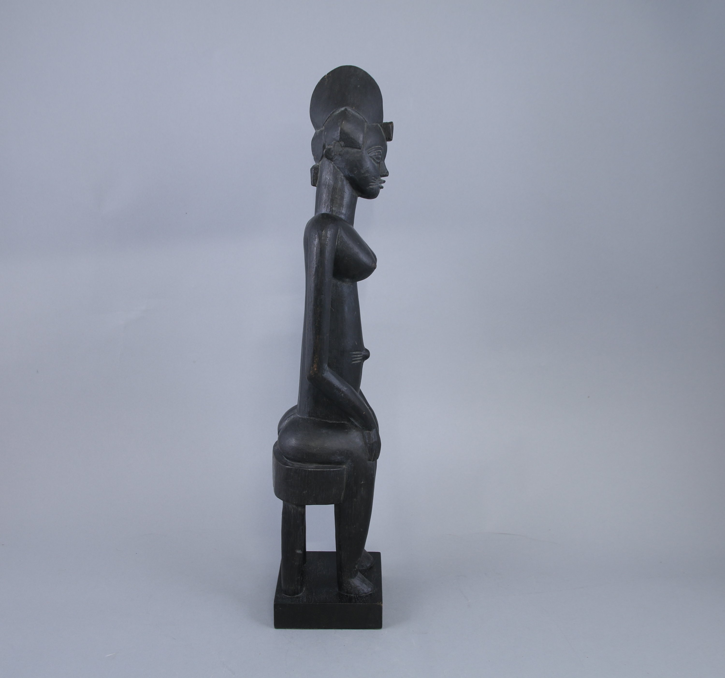 Statue représentant un personnage féminin assis sur un tabouret, les mains posées sur les genoux, le ventre orné de scarifications et la tête à la coiffure en crête à bec de calao.