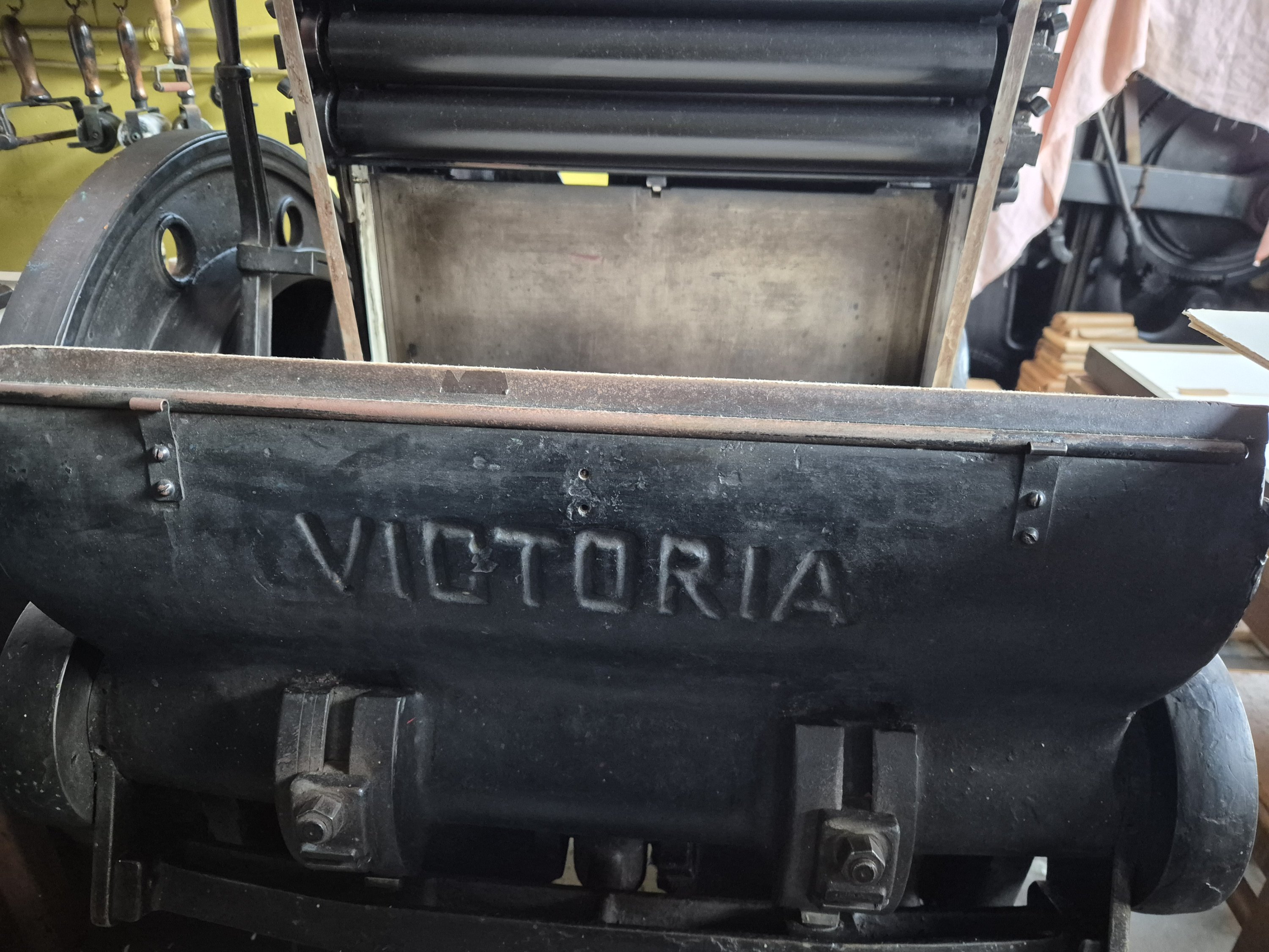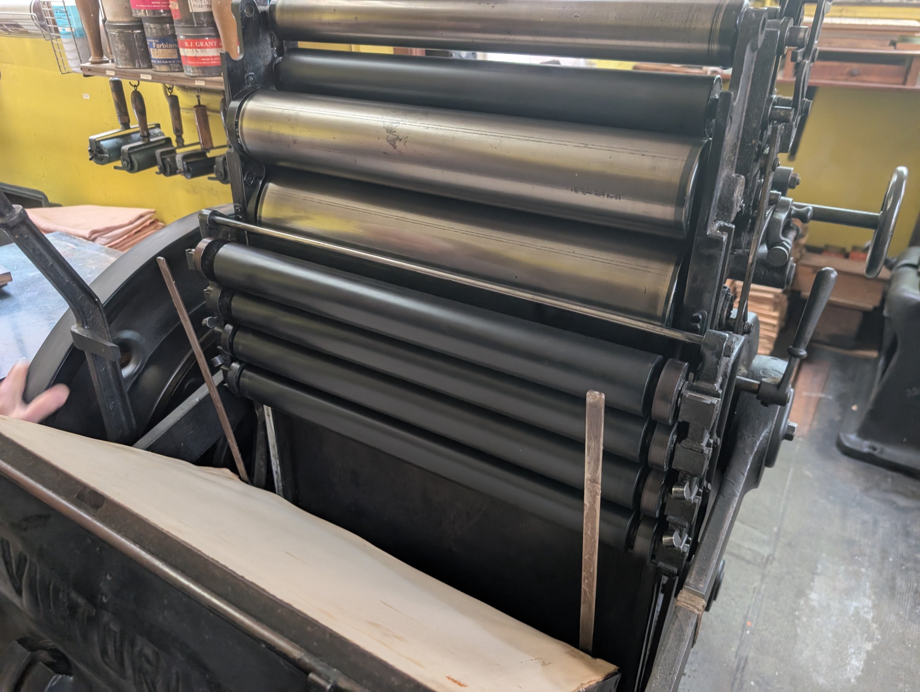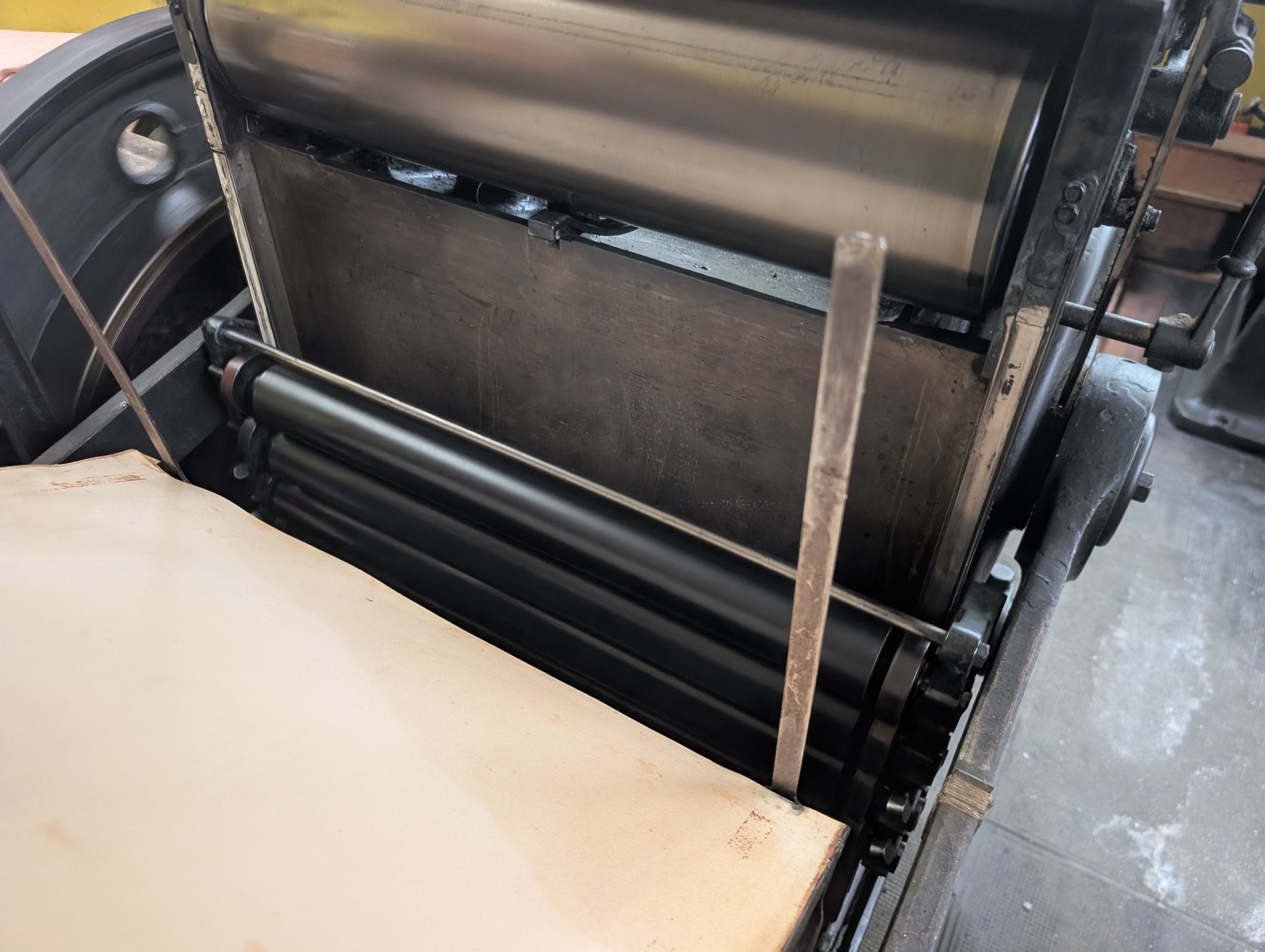 Presse à platine lourde à moteur électrique, variateur de vitesse, avec 2 châssis, un jeu de rouleaux (à regarnir), 2 tablettes hautes sur lesquelles sont empilées les feuilles d’impression, mandrin de rechang.