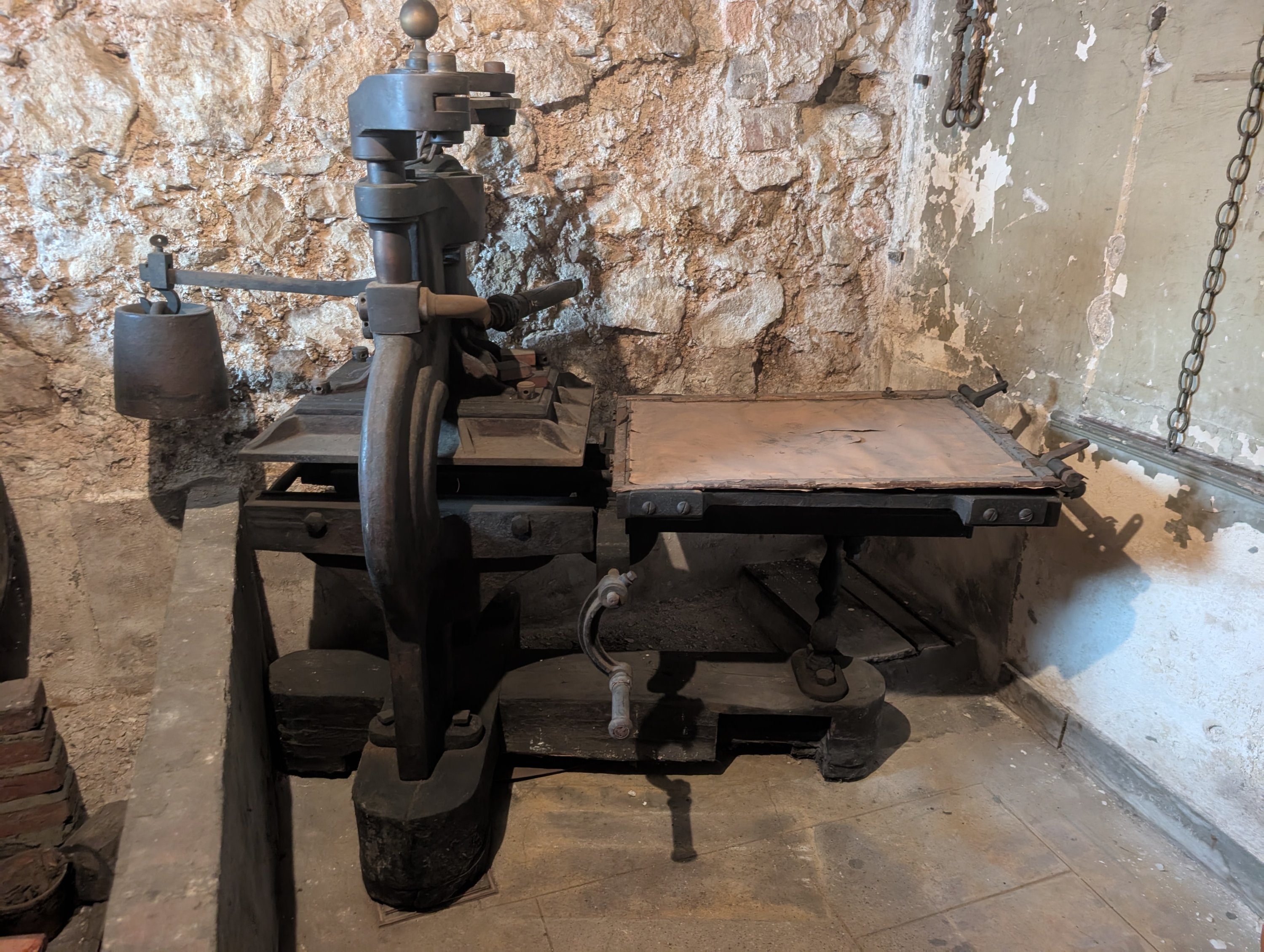 Provenance: cette presse a d’abord servi au célèbre graveur et illustrateur Auguste Lepère (1849-1918), puis aux maîtres pressiers Jacques Beltrand (1874-1977) et Robert Blanchet (1921-2009).