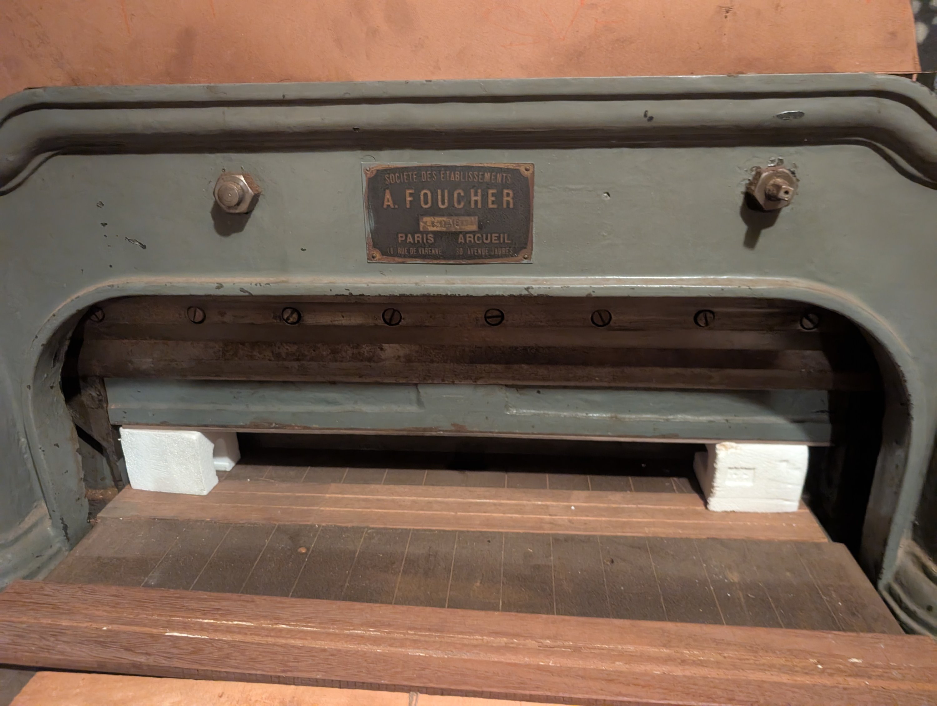 Fonte de fer des établissements A. Foucher, n° 56 148, ouverture lame 80 cm. Mise au point et marge au taquet manuelles, ainsi que la coupe.