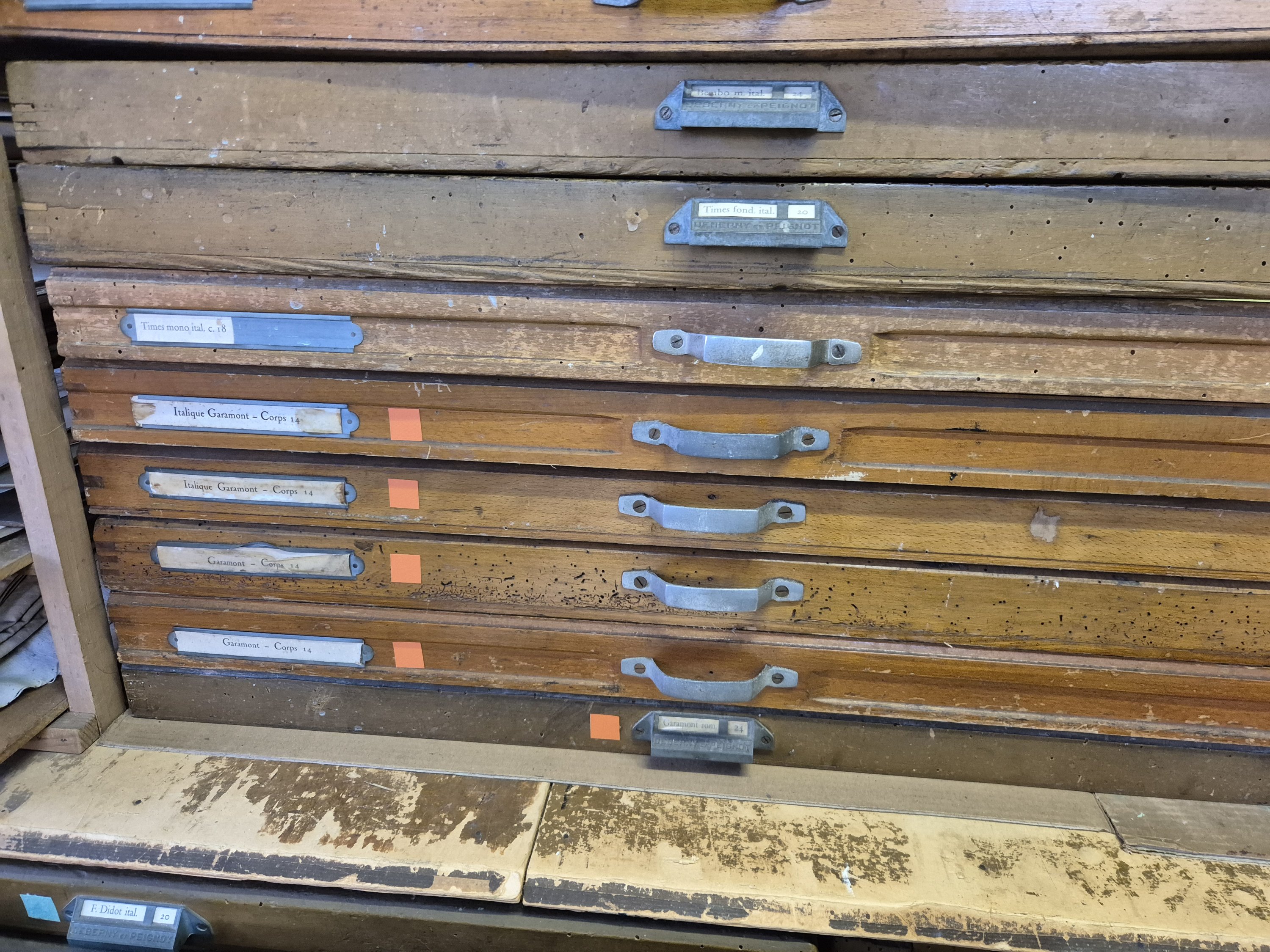 - Italique: corps 8 (1 casse) - 10 (1 casse) - 12 (1 casse) - 14 (1 casse) - 16 (1 casse) - 18 (1 casse) - 20 (1 casse) - 24 (1 casse) - 36 (1 casse) - 48 (1 casse)