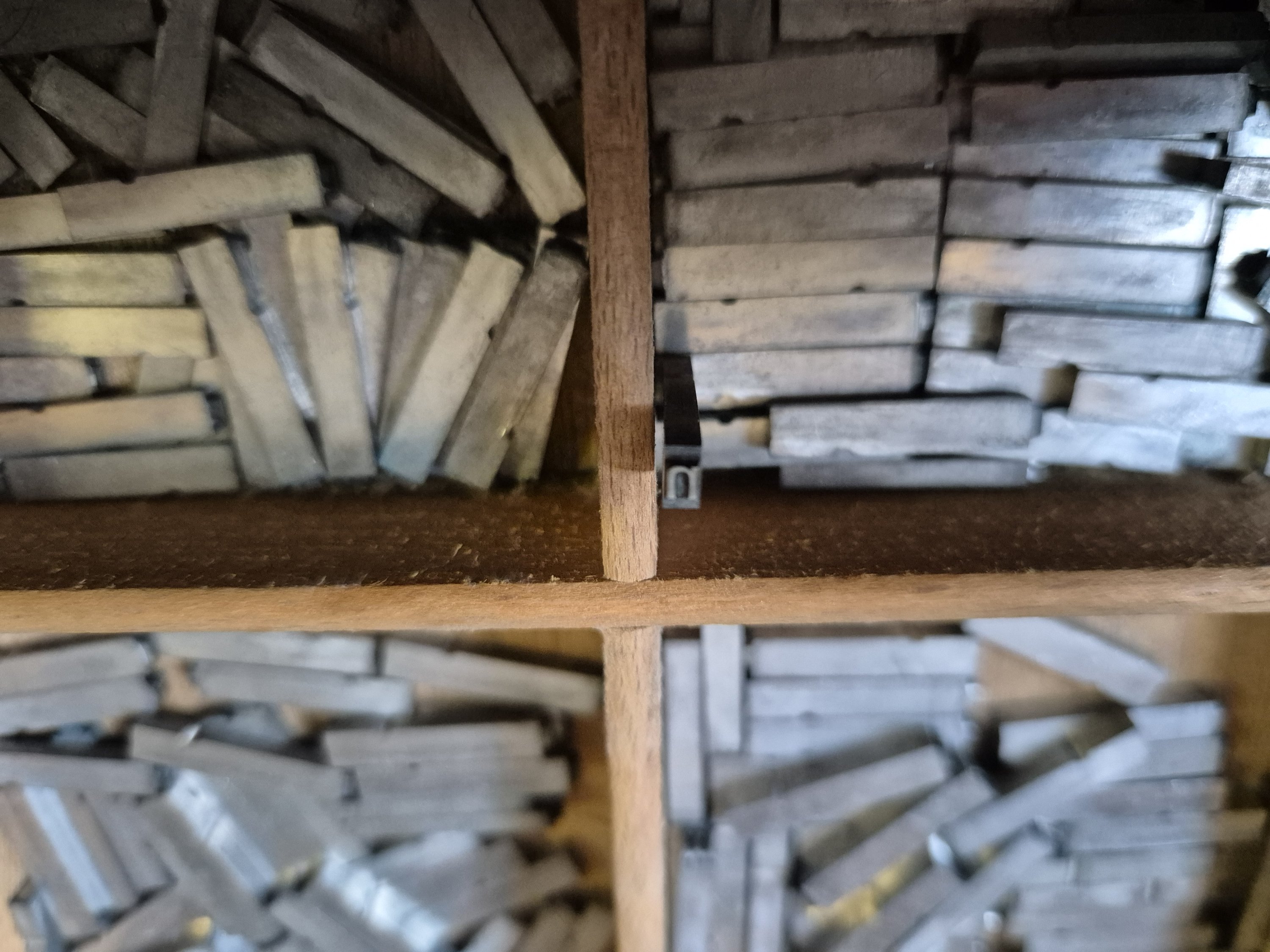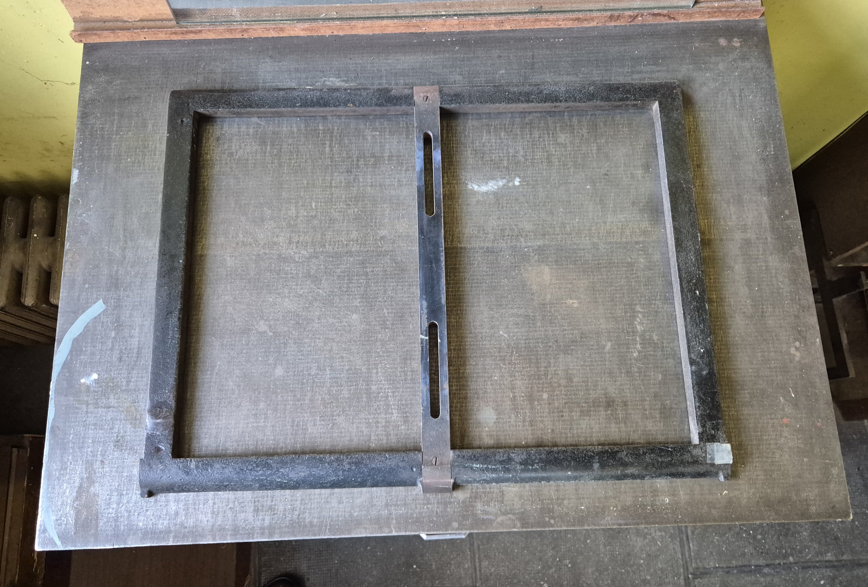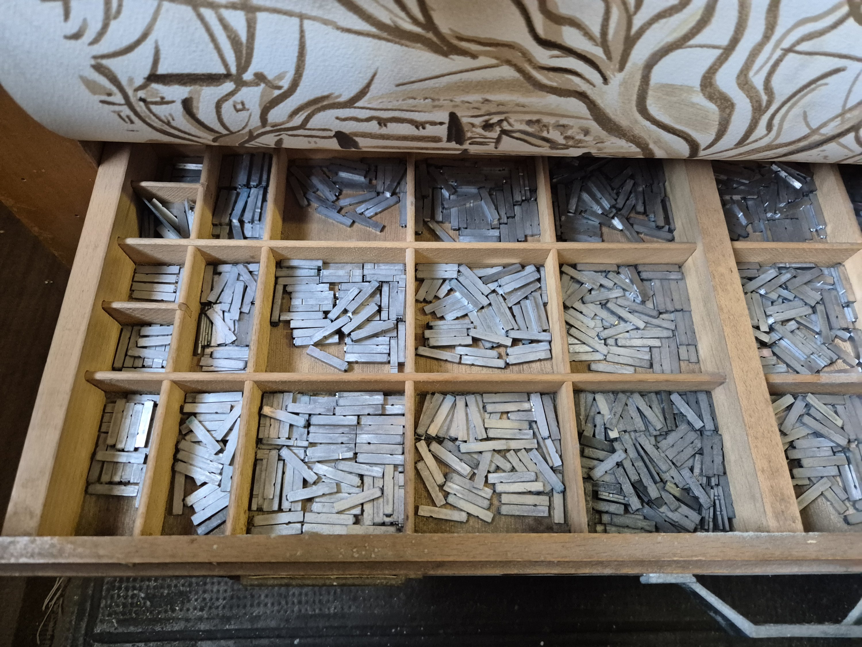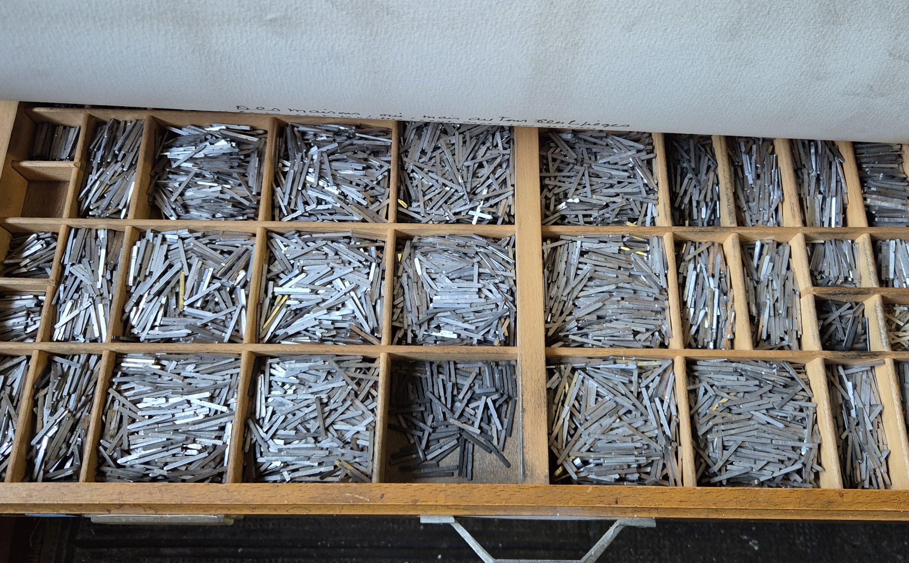 L’ensemble des 12 casses contenues dans un meuble plat à dessus marbre métallique pour apposition des formes d’impression, Long. 80, Larg. 65, haut. 95 cm