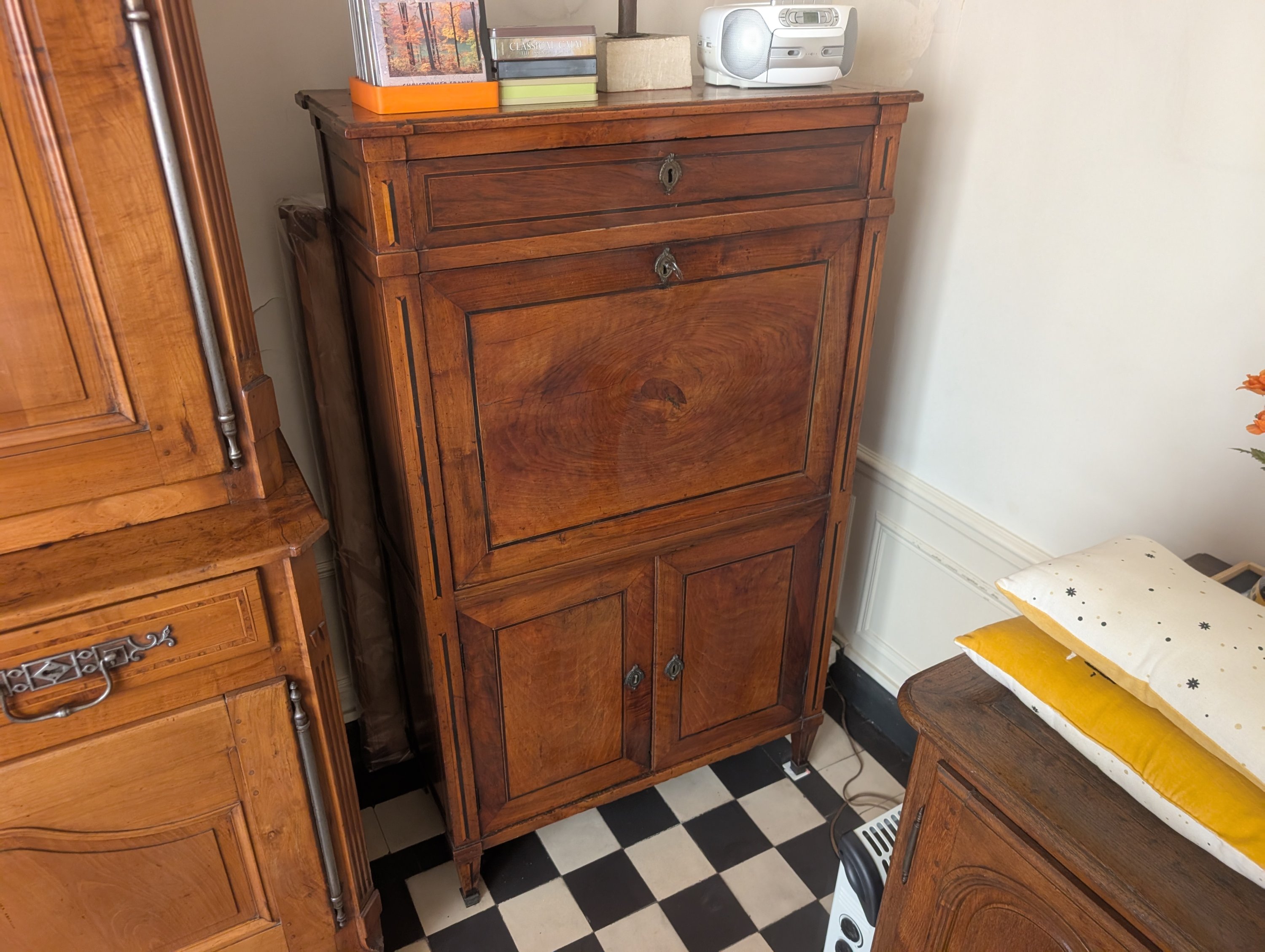 Il ouvre par un tiroir et deux portes en partie basse et repose sur quatre pieds en gaine fuselés.