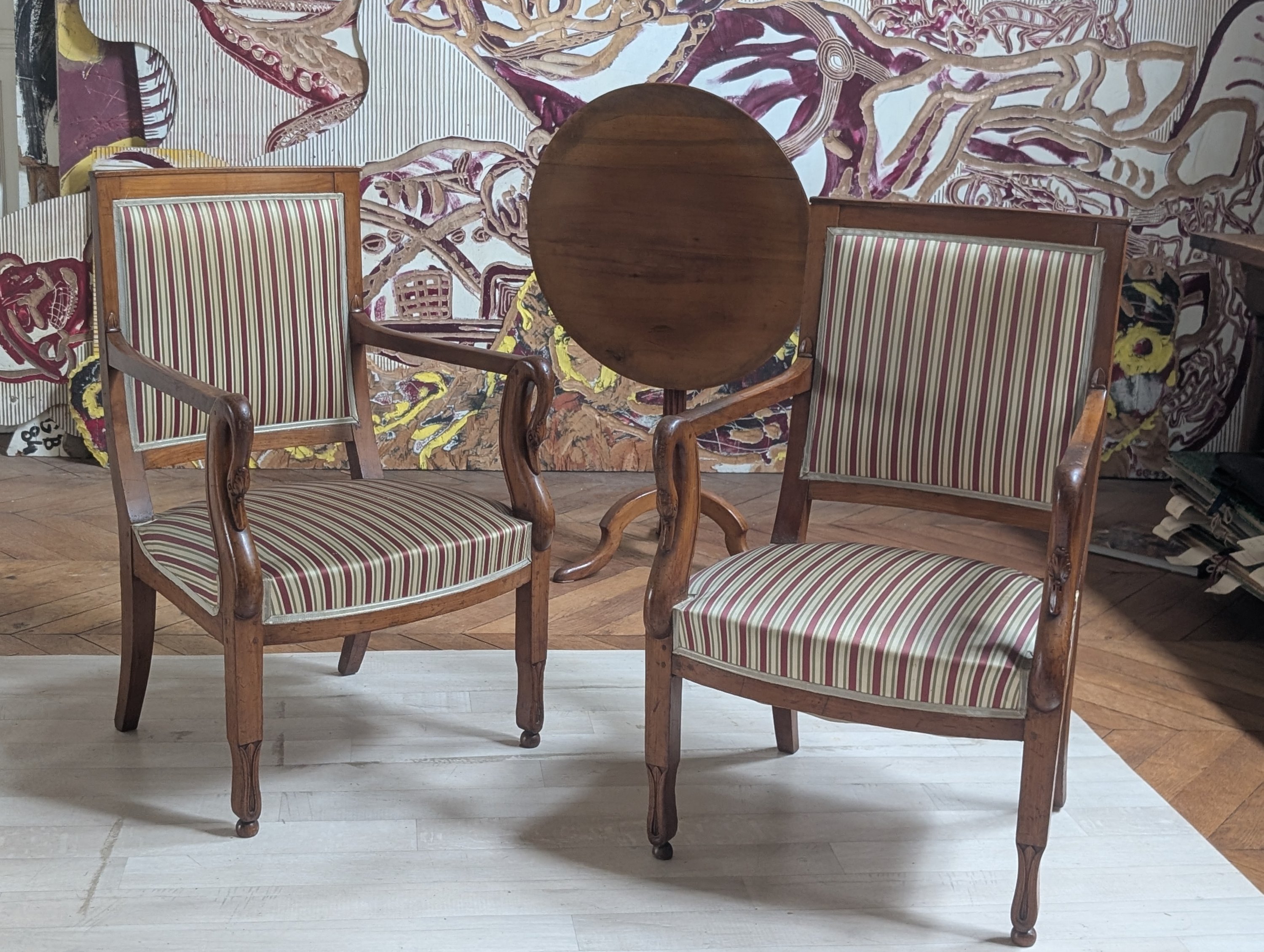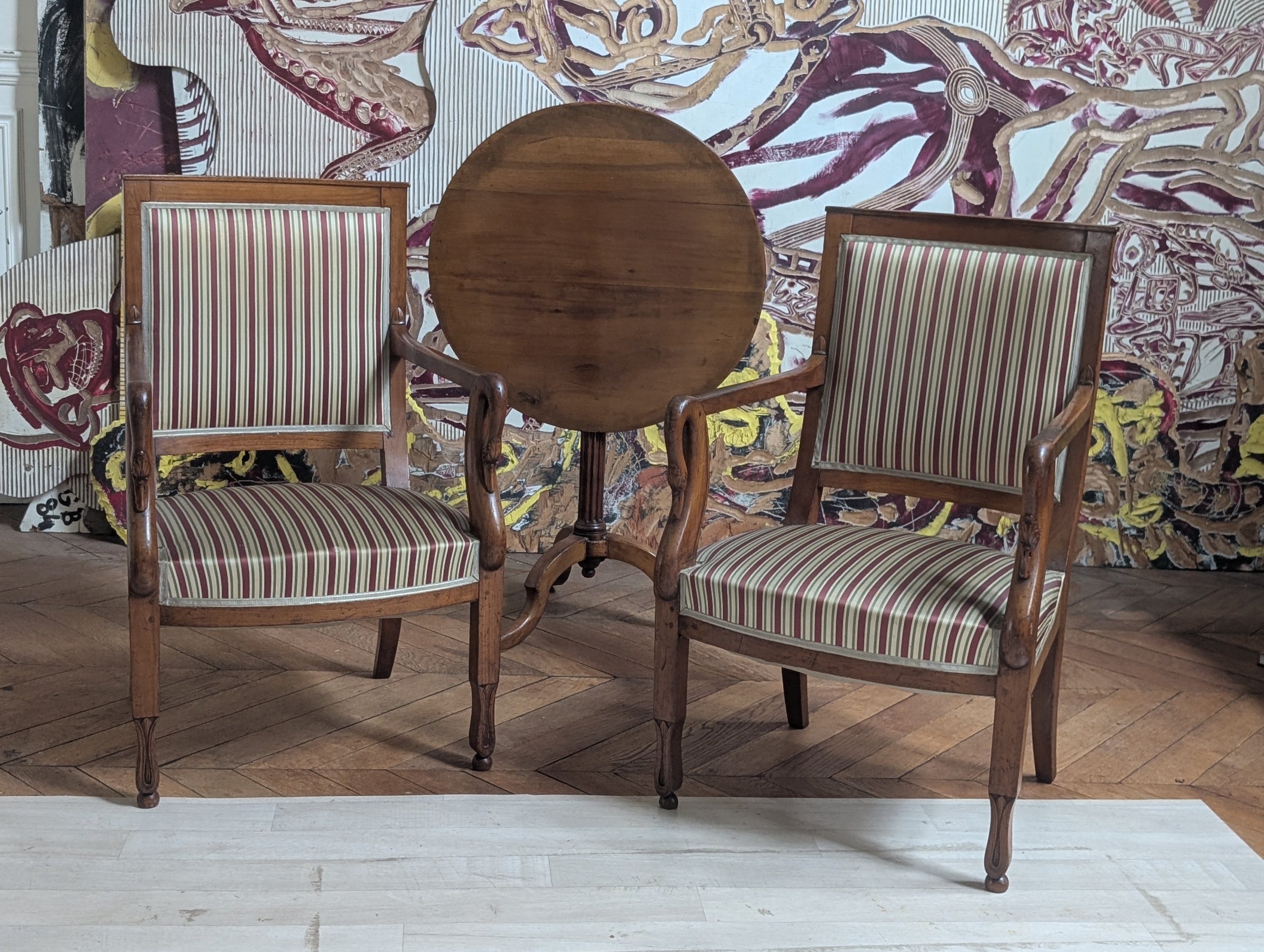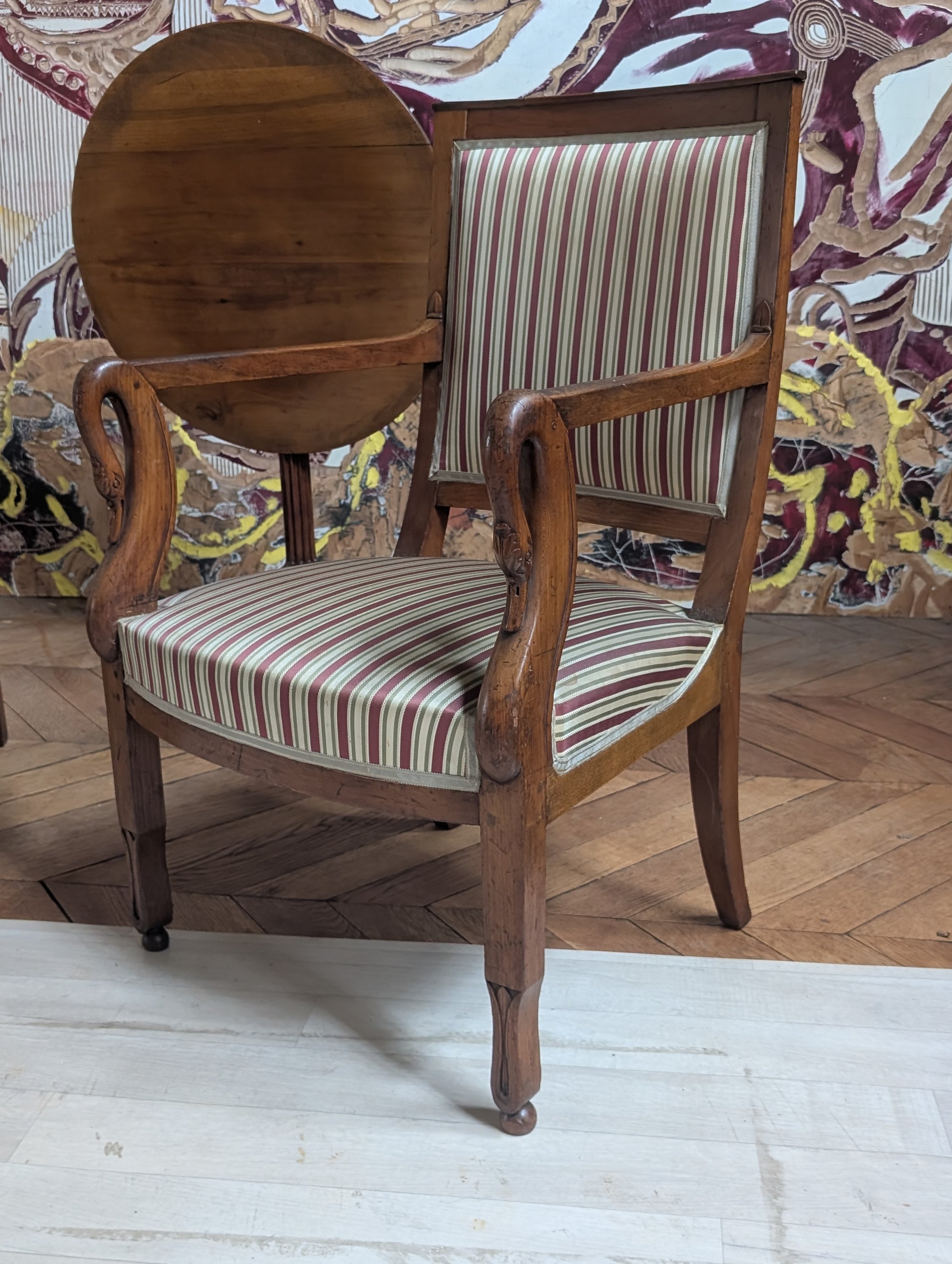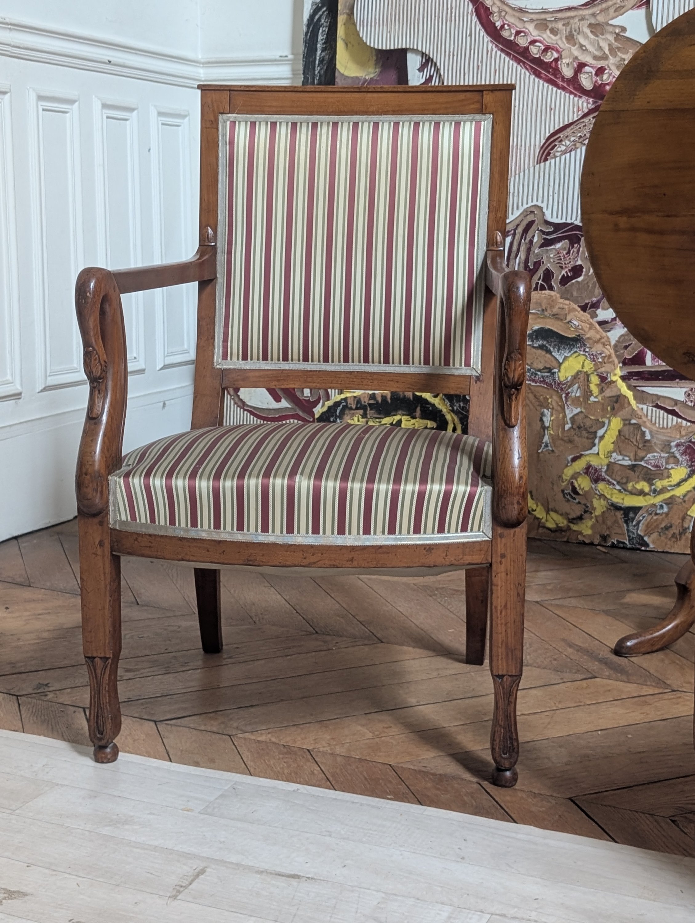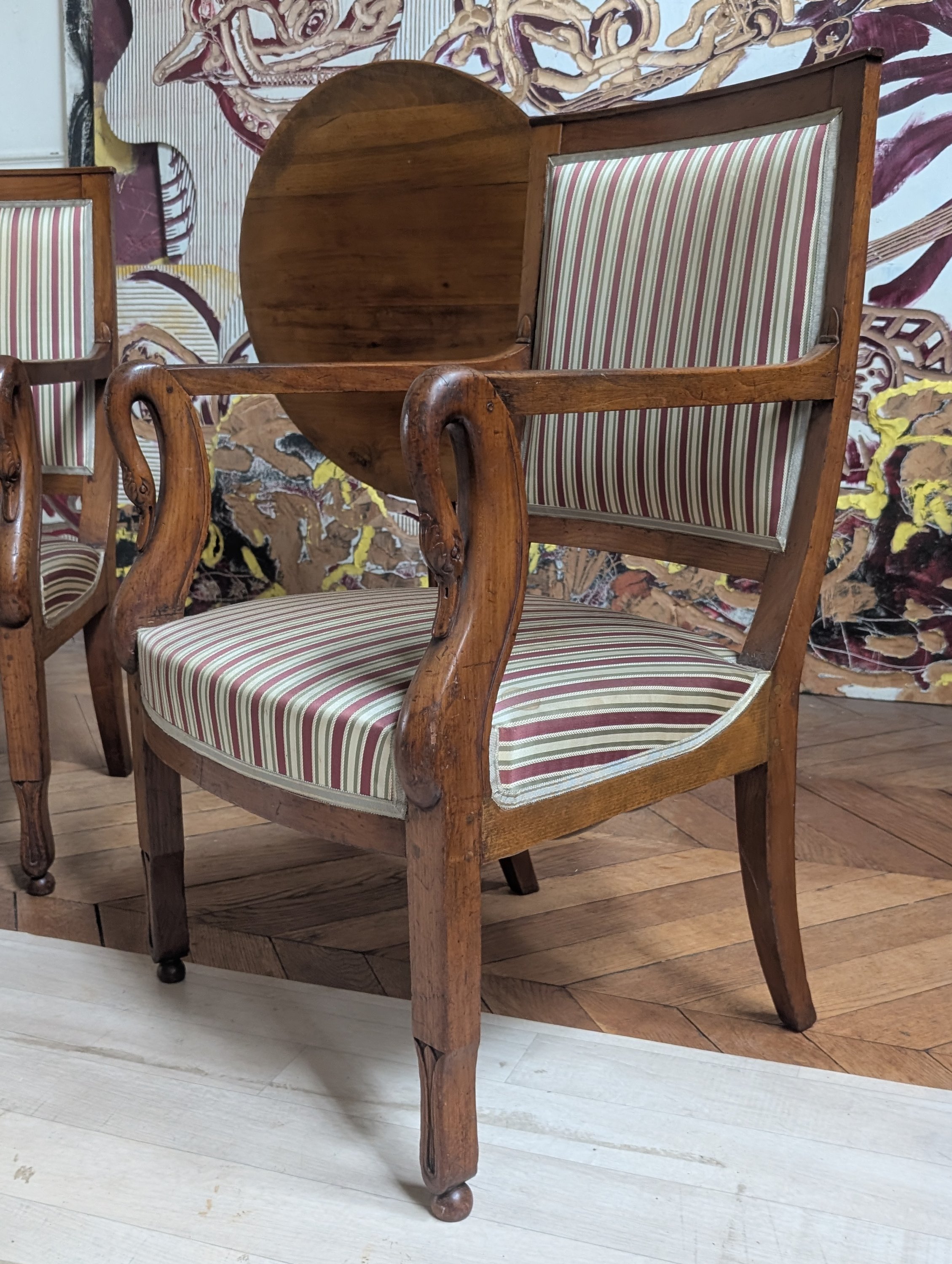 Les accoudoirs à col de cygne reposent sur des pieds antérieurs en fleur de lotus et des pieds arrière sabres.