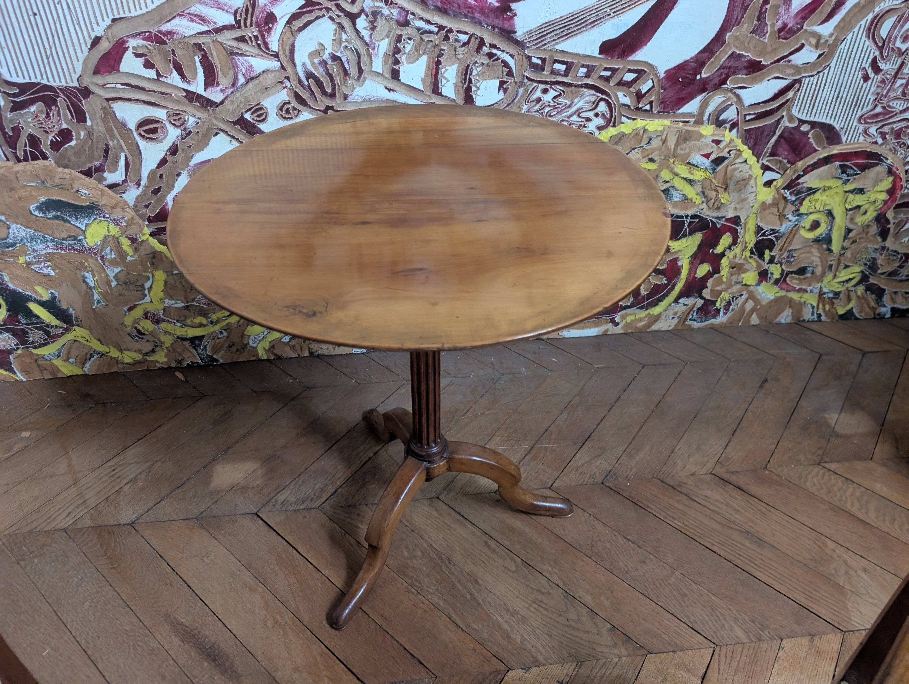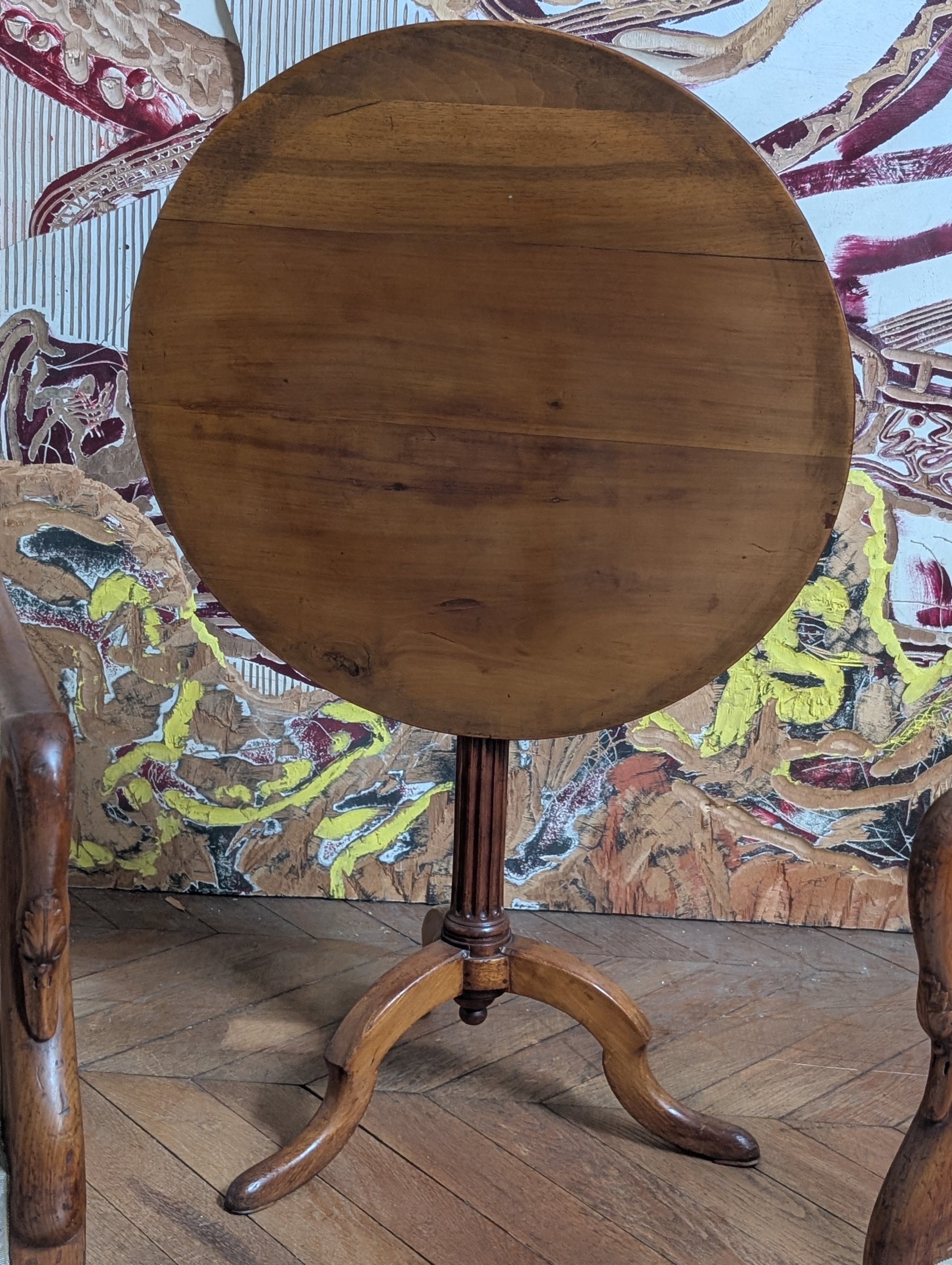 Joint: une petite table volante guéridon à plateau circulaire, piètement en colonne cannelée reposant sur 3 pieds mouvementés. Haut. 71 Diam. 66 cm.