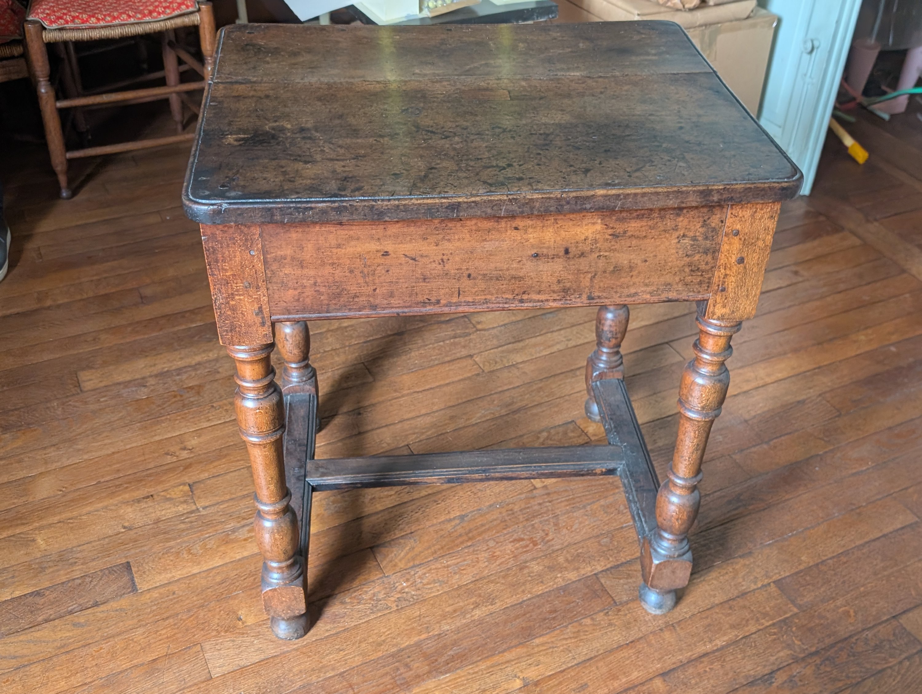 Joint à l'étage: table en bois naturel de forme rectangulaire ouvrant par deux tiroirs en ceinture reposant sur quatre pieds à colonne baguées réunies par une entretoise en H.