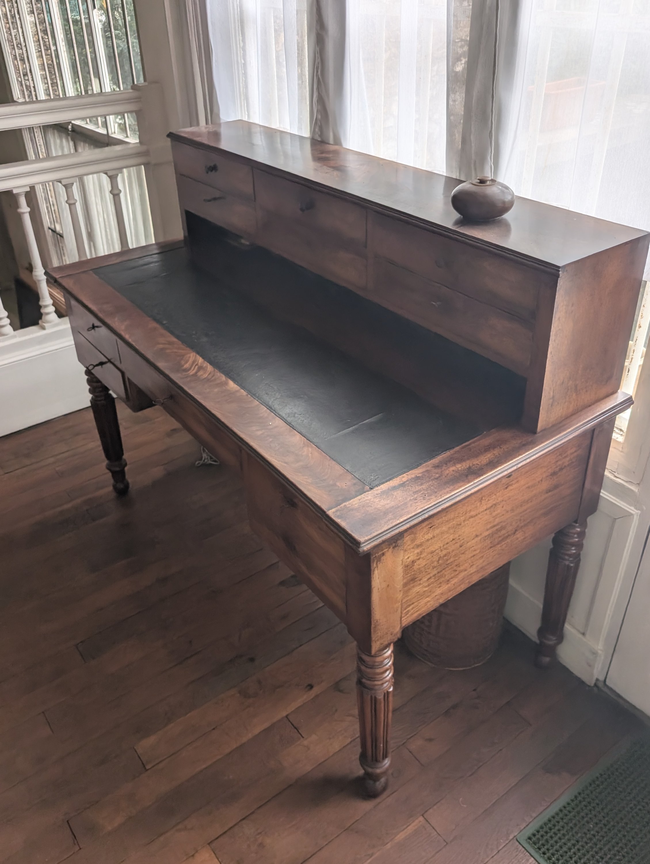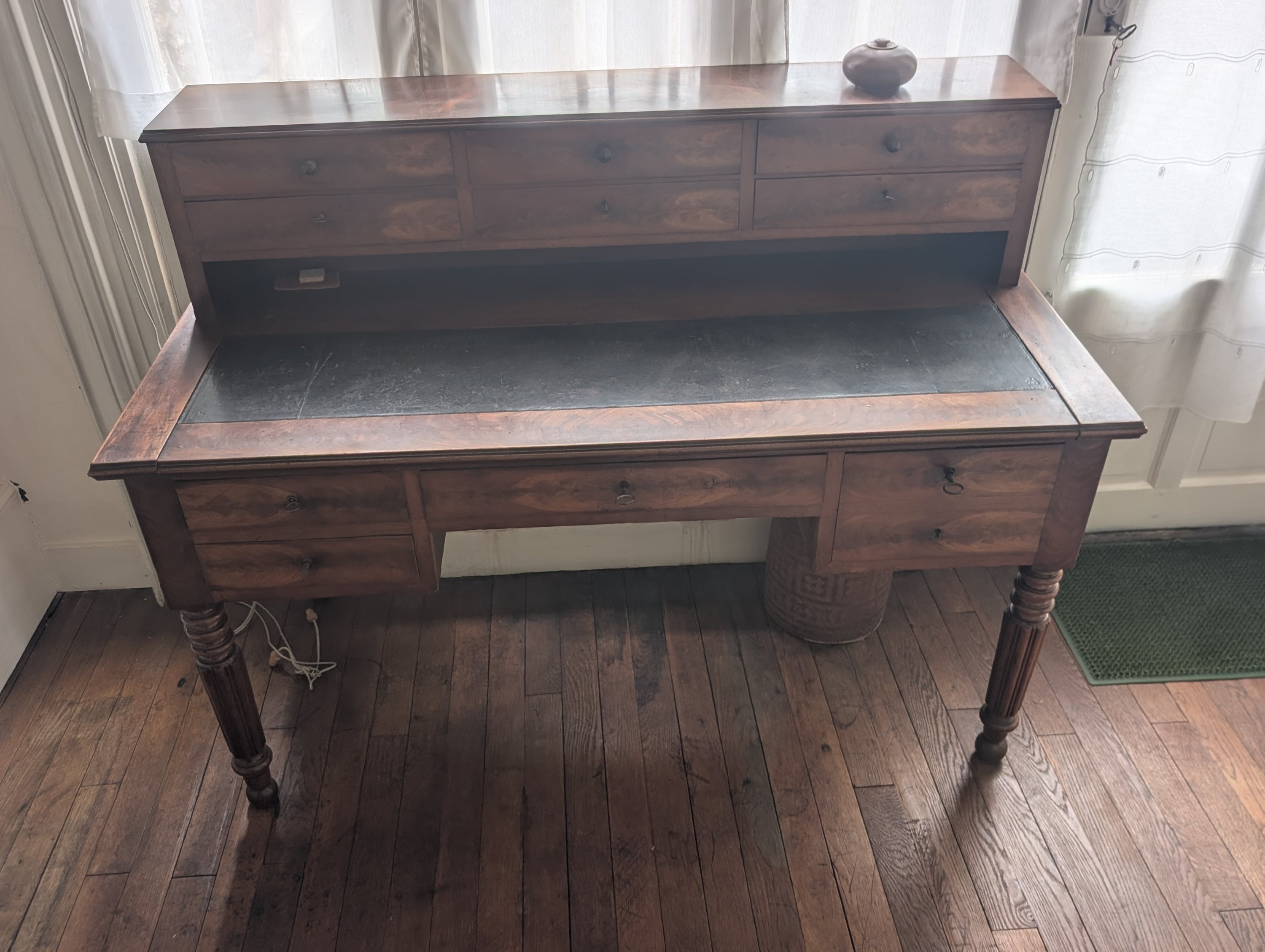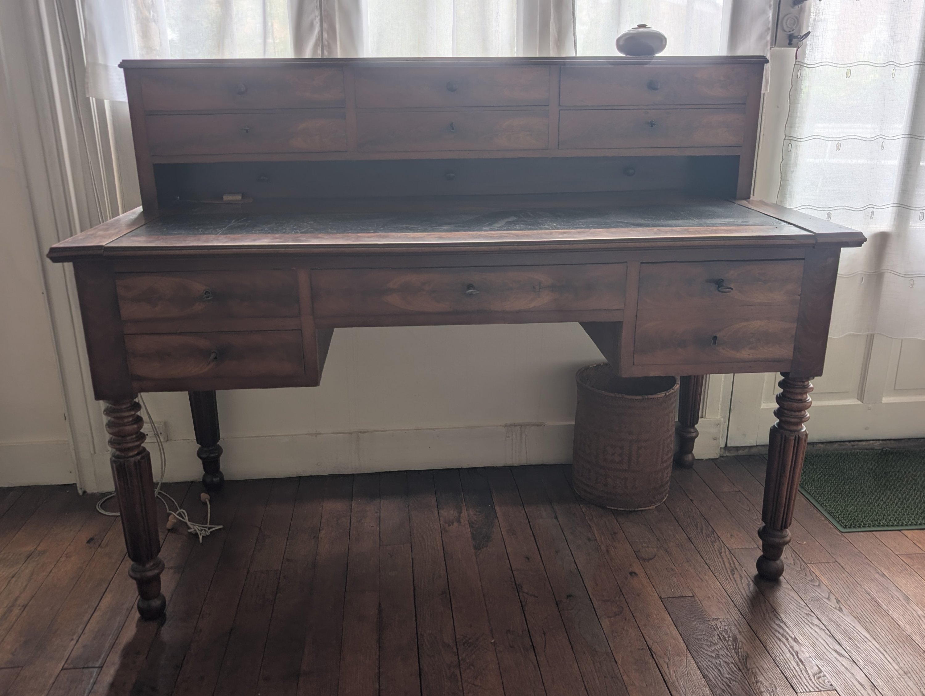 Le bureau en placage de noyer surmonté d'un casier à trois tiroirs, le plateau foncé en partie d'un cuir sombre, il ouvre en ceinture par quatre tiroirs et repose sur quatre pieds moulurés.