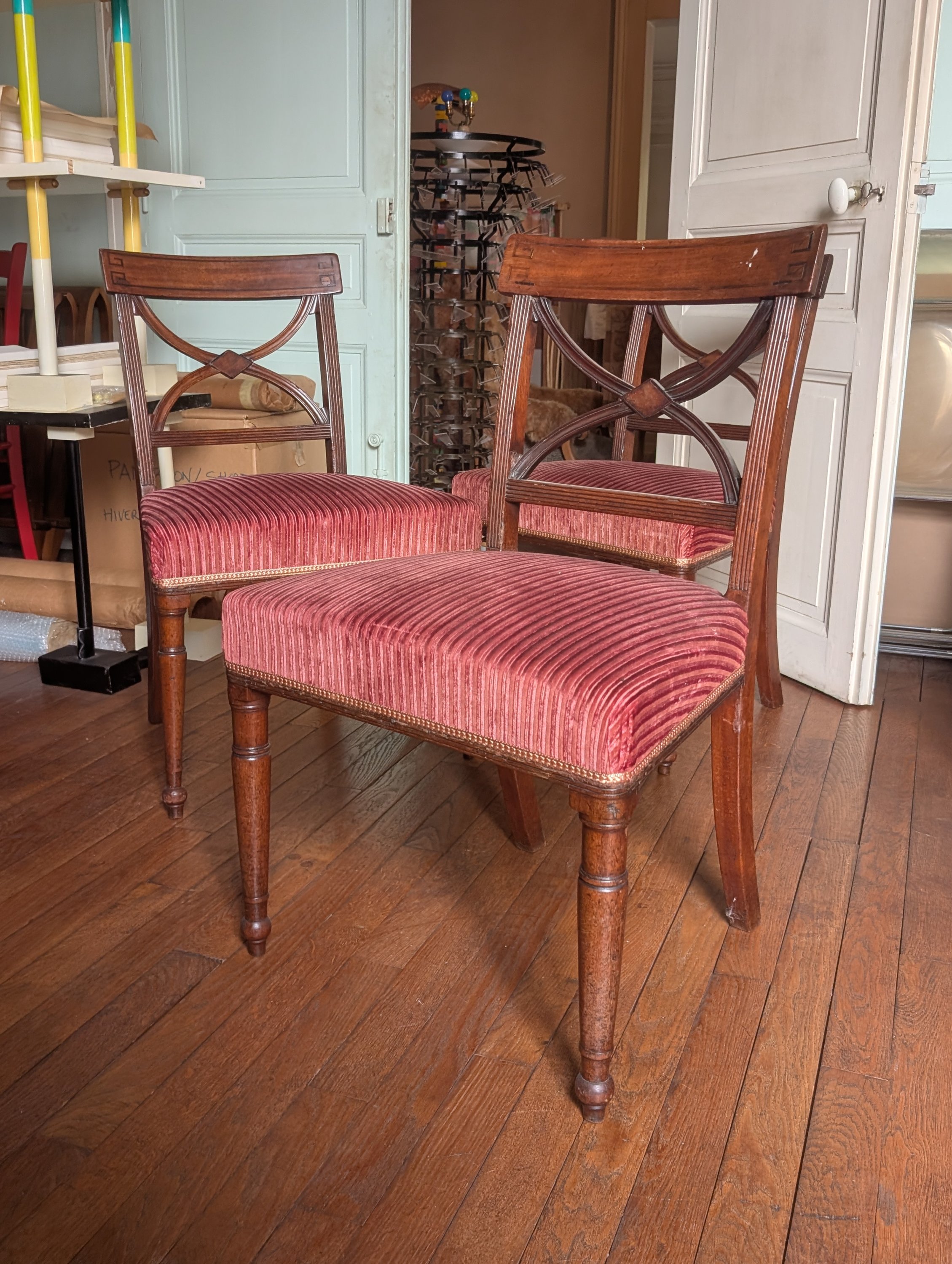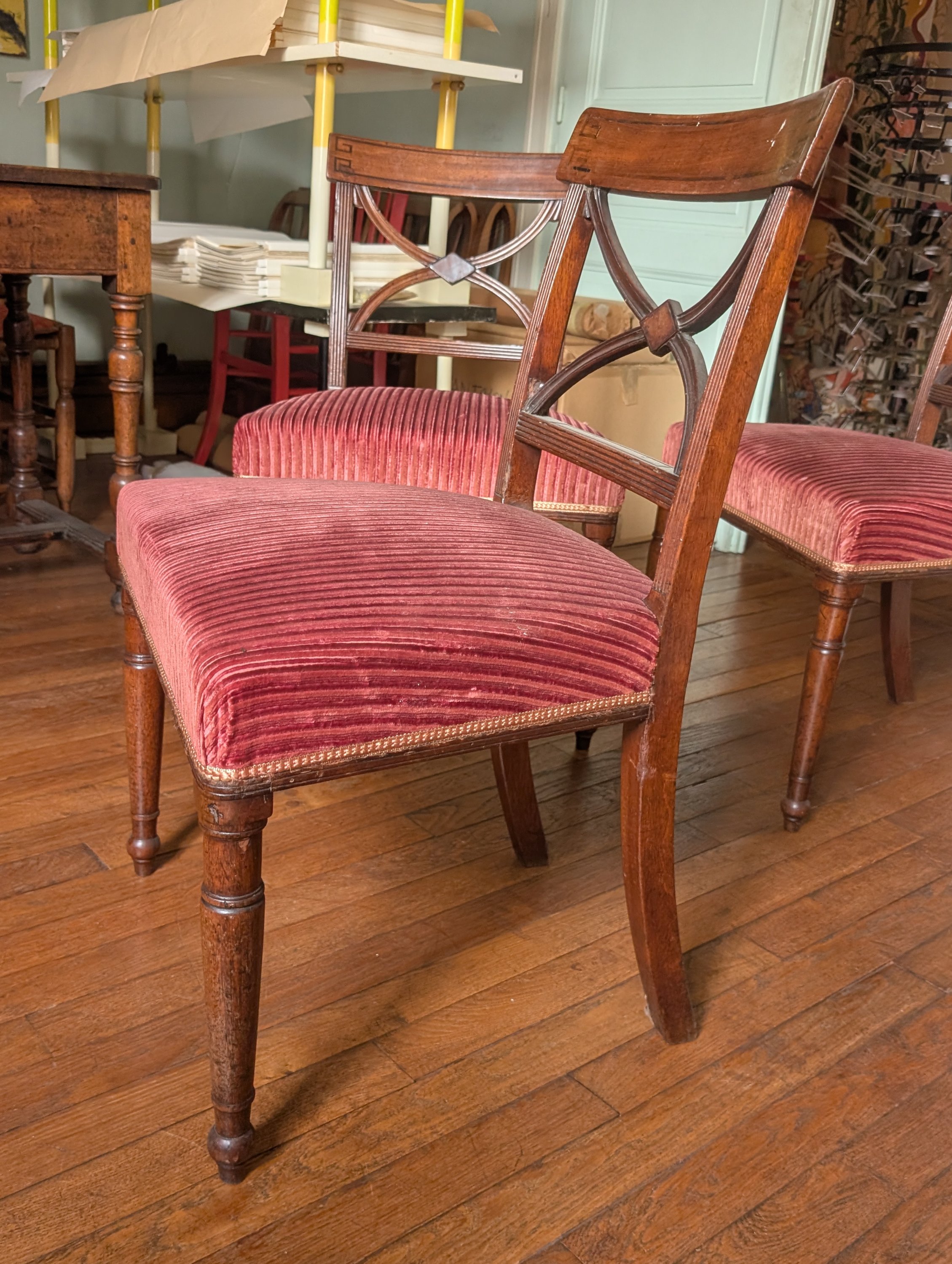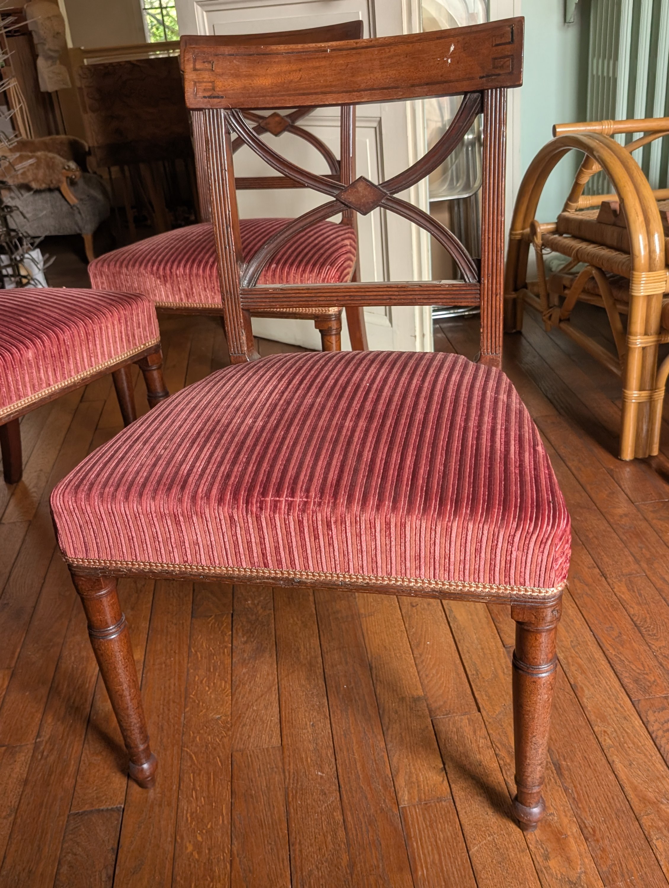 Le dossier légèrement cabriolet ajouré à motif de croisillon reposant sur des pieds en gaines et des pieds sabres.