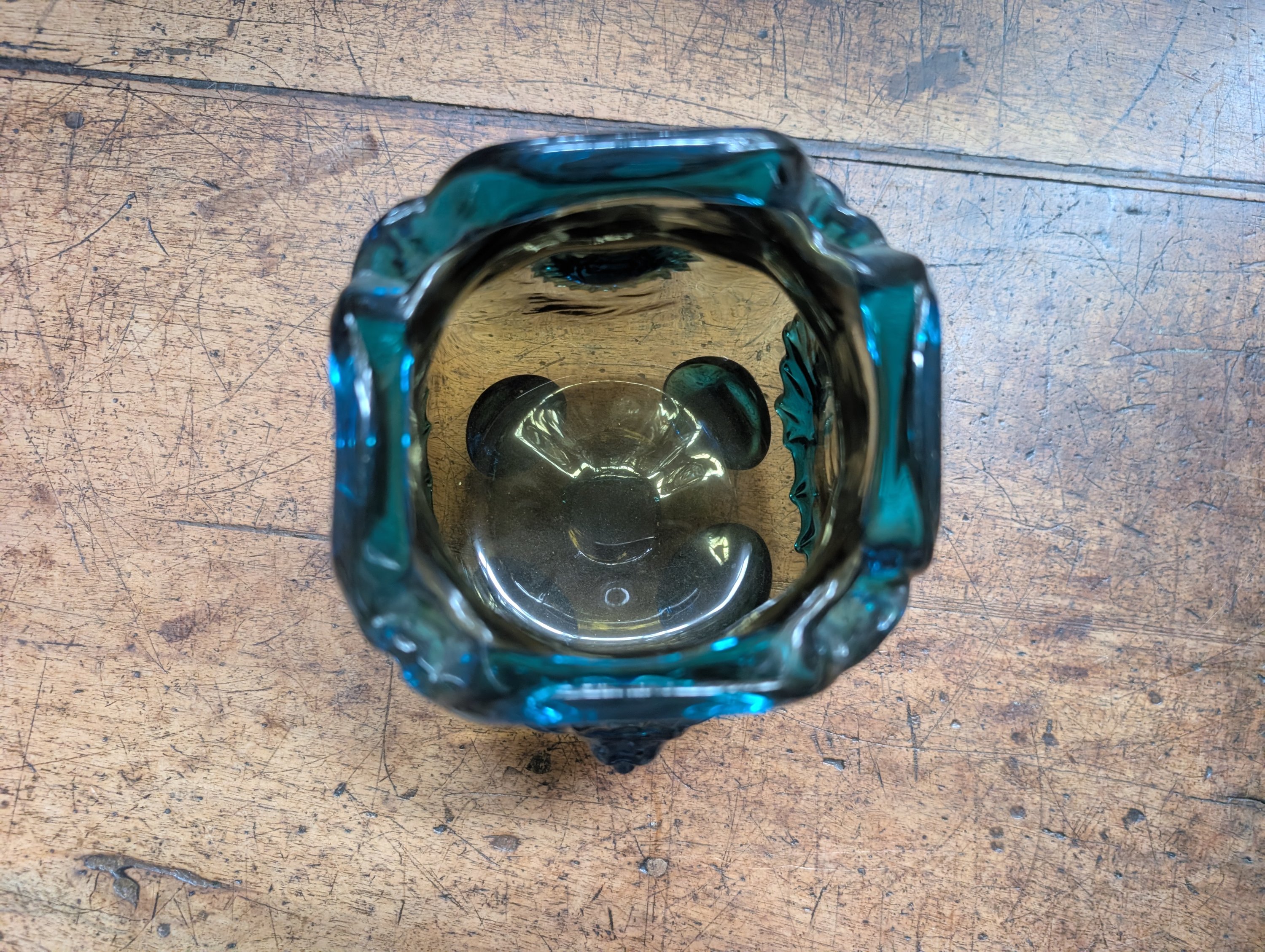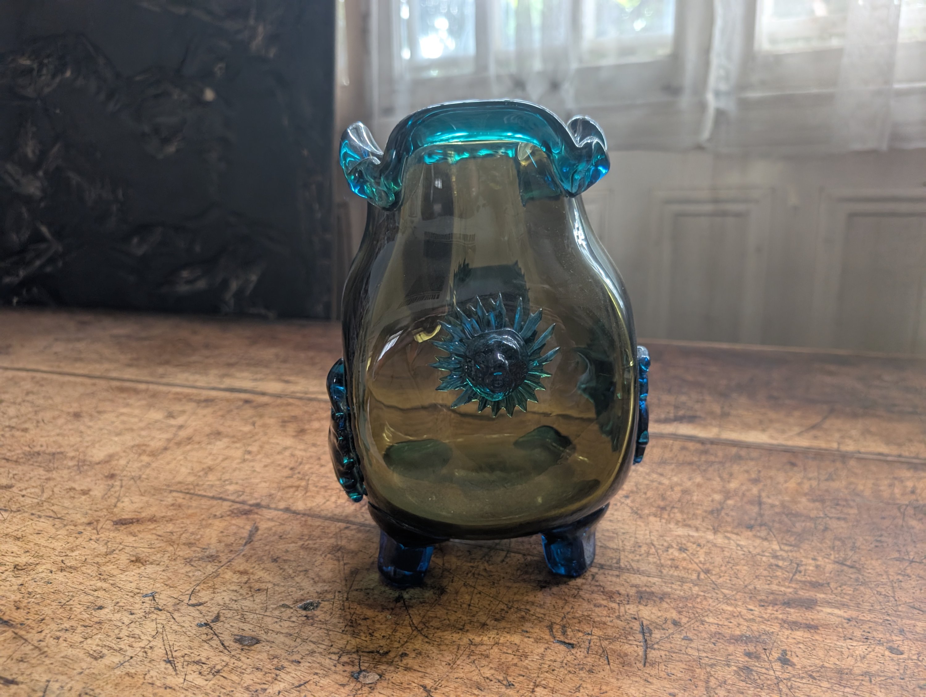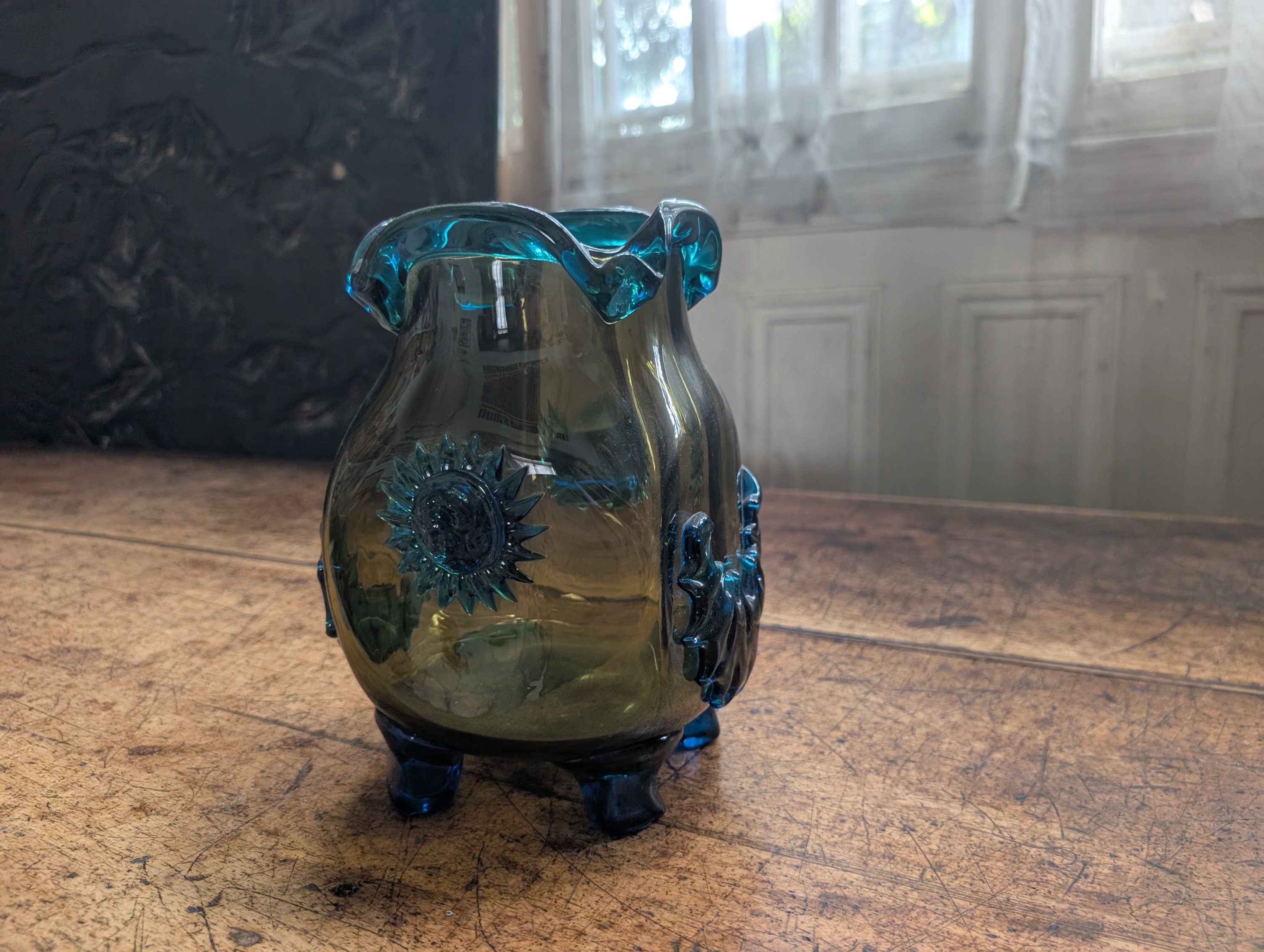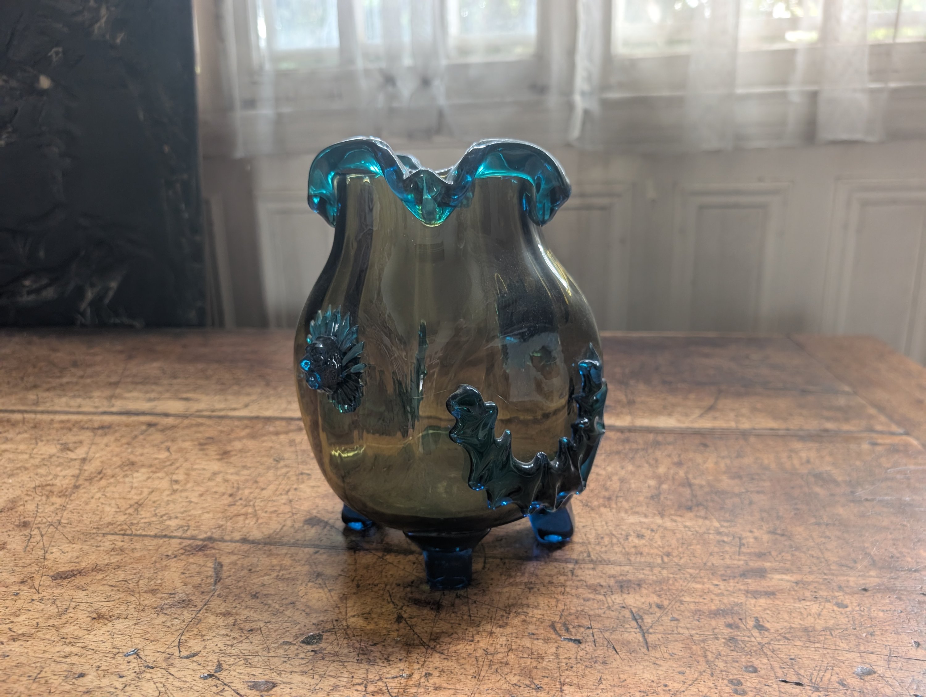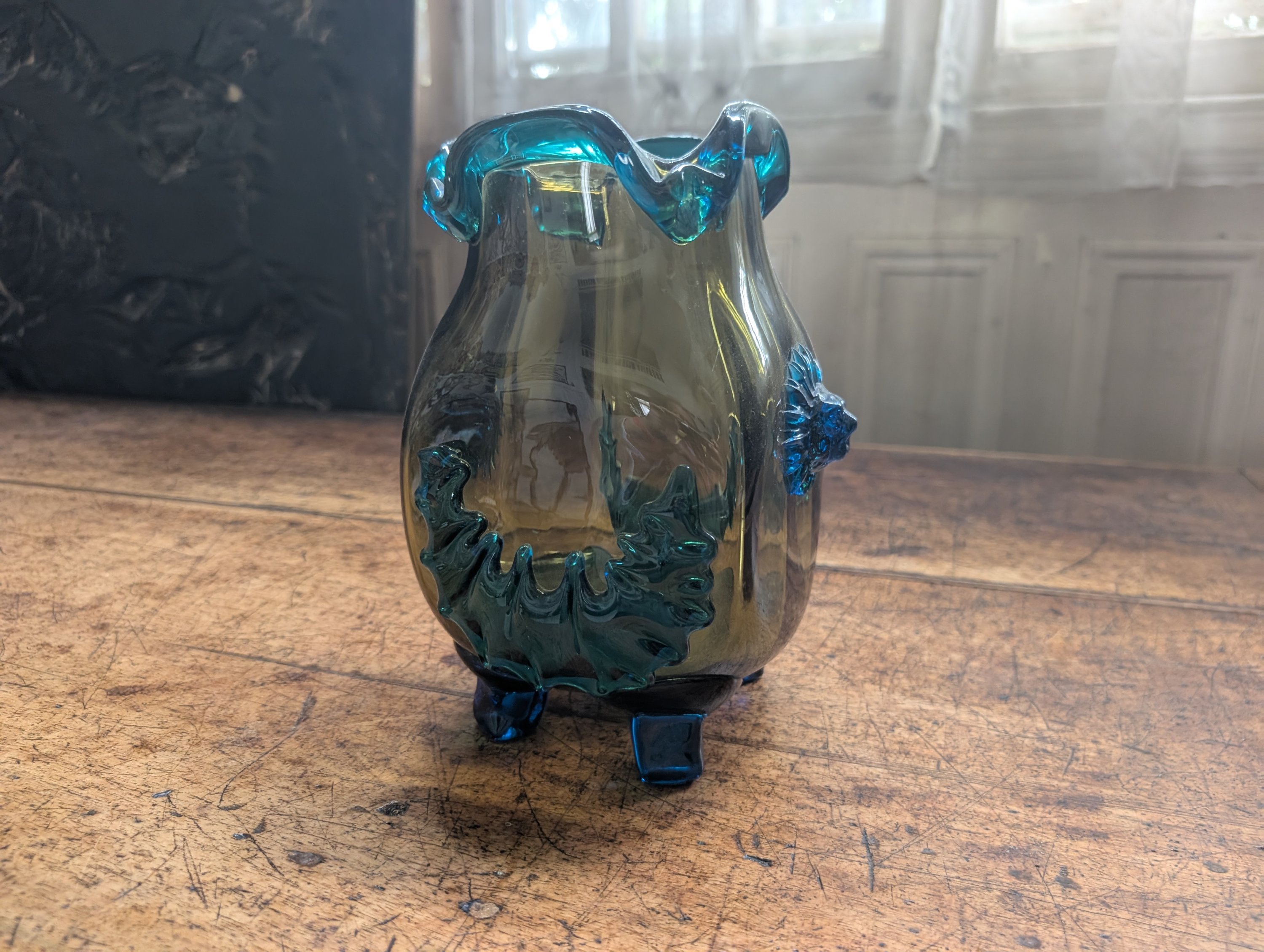 Verre bicolore de forme pansu, le col pincé reposant sur quatre petits pieds avec des protomées de lion en applique et des guirlandes .