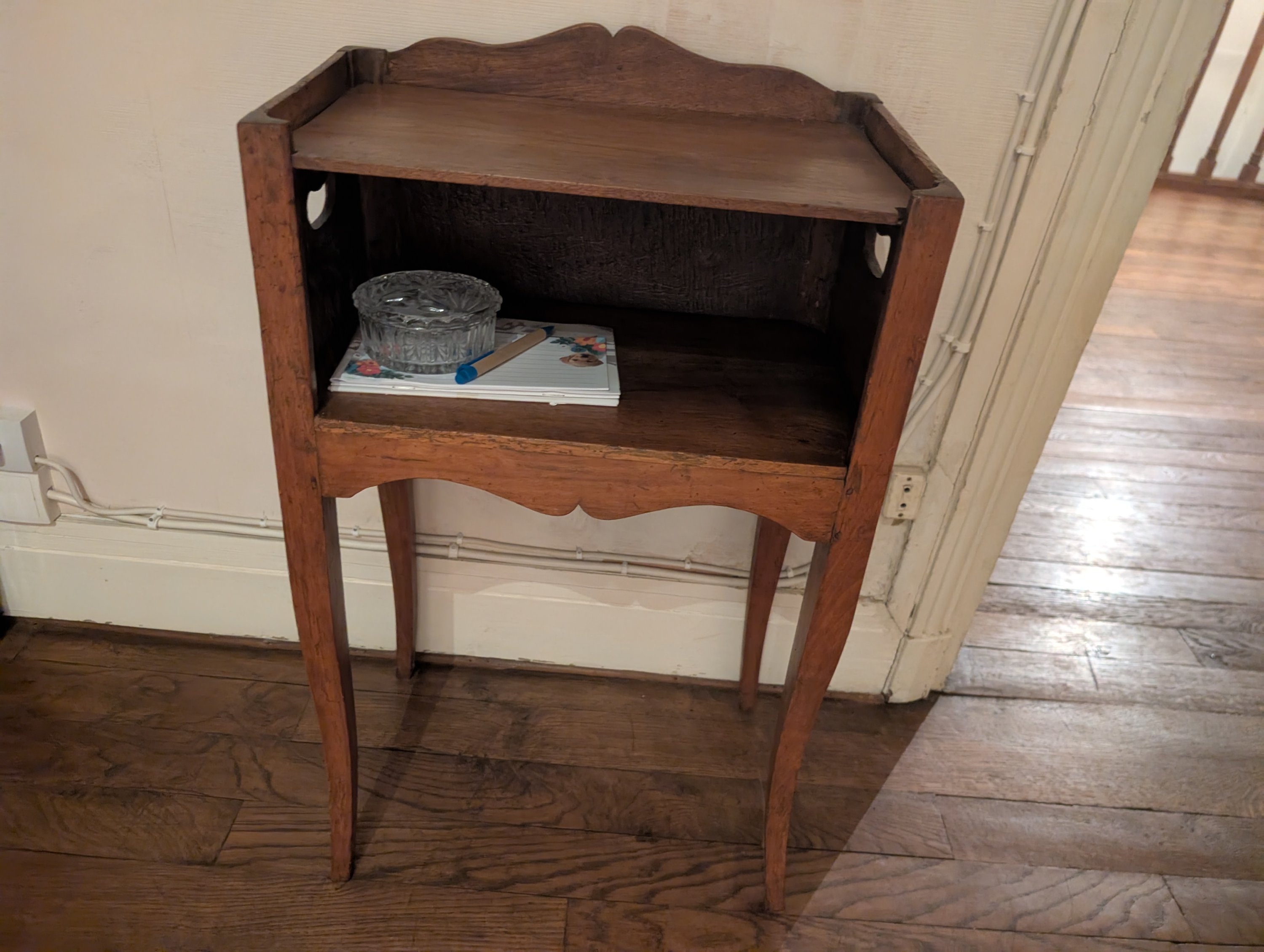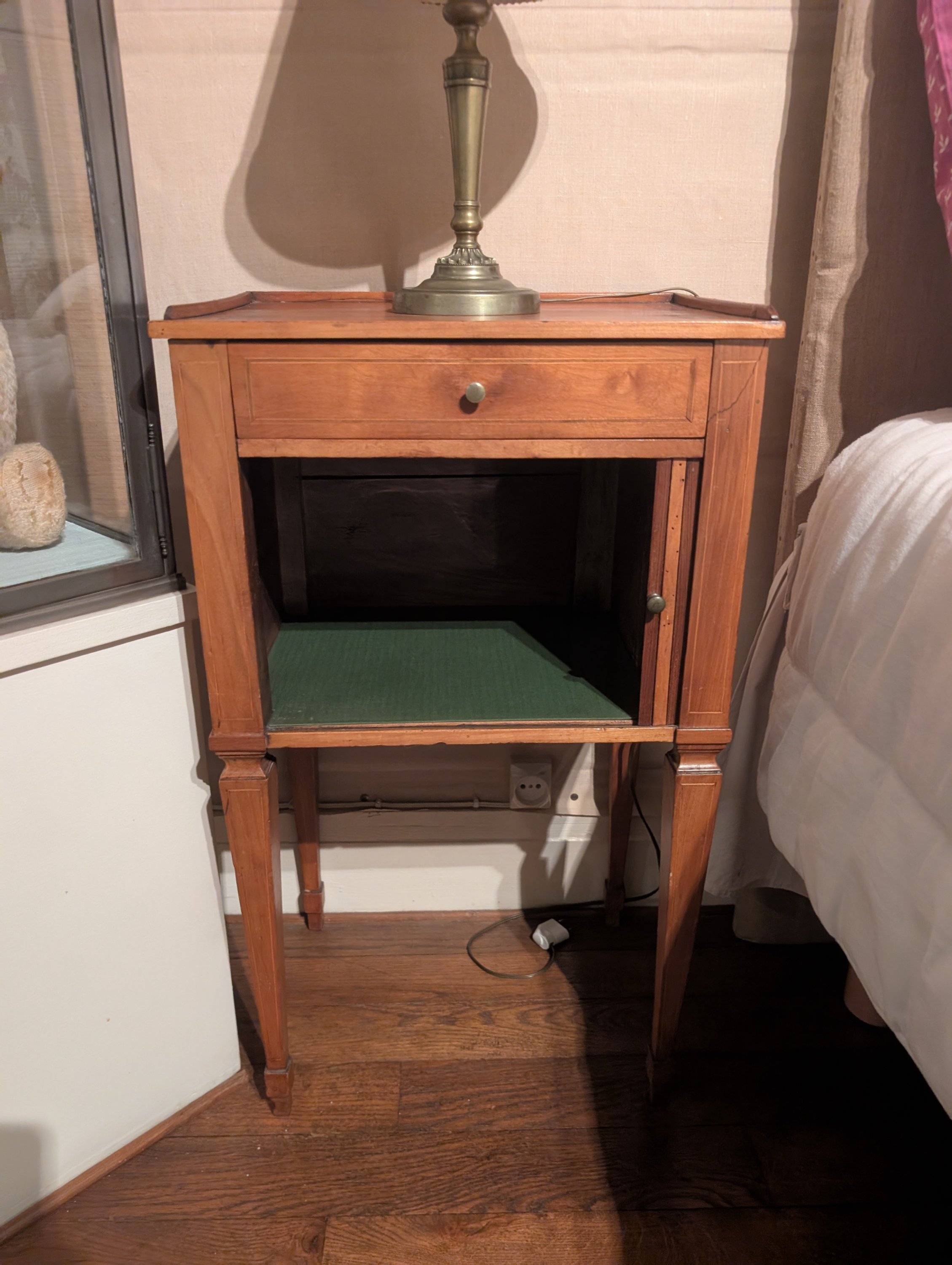 Joint: un petit chevet à casier ouvert en bois naturel de style transition Louis XV ou Louis XVI.