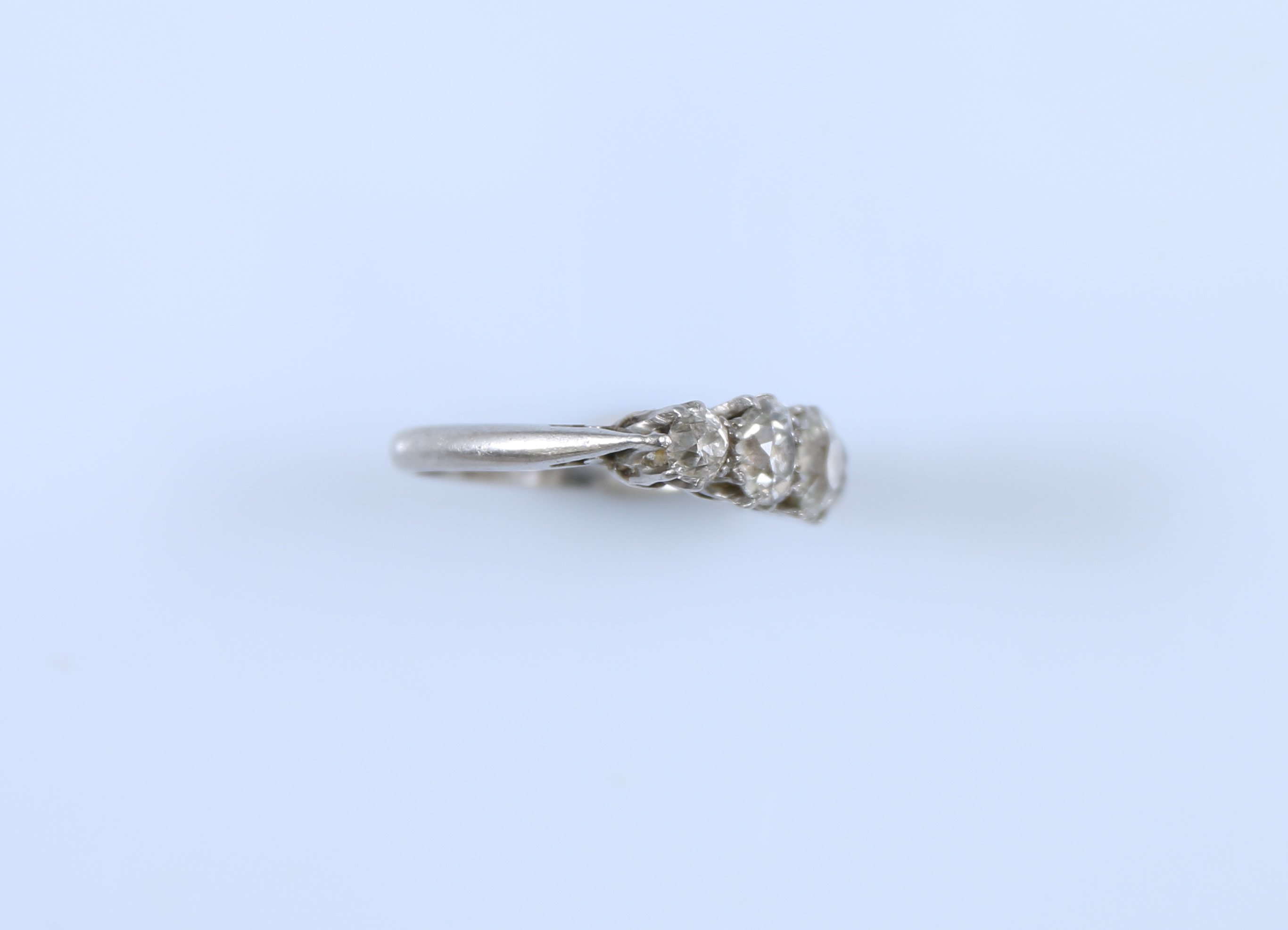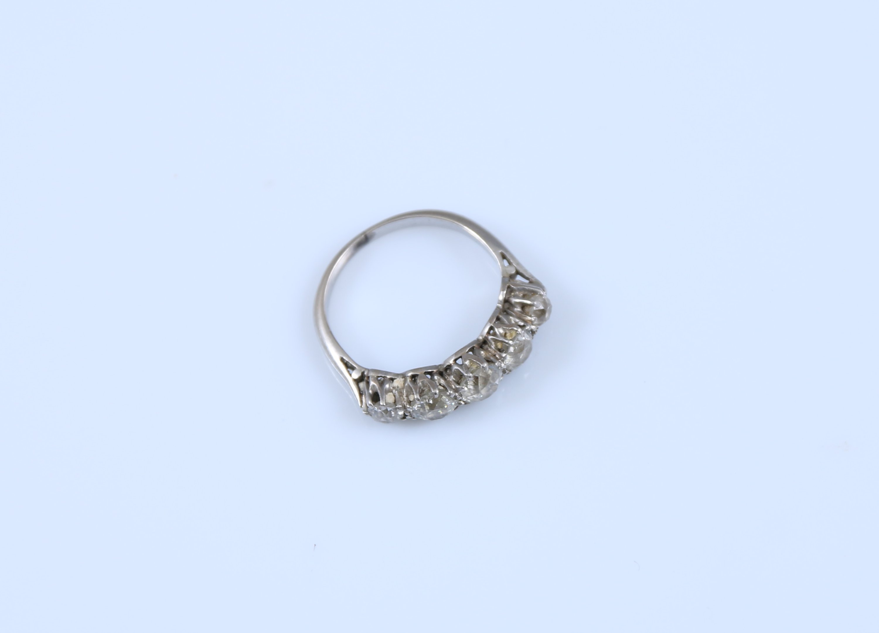 Platine 850 millièmes ornée au centre d’une ligne de cinq diamants ronds de taille ancienne en chute.