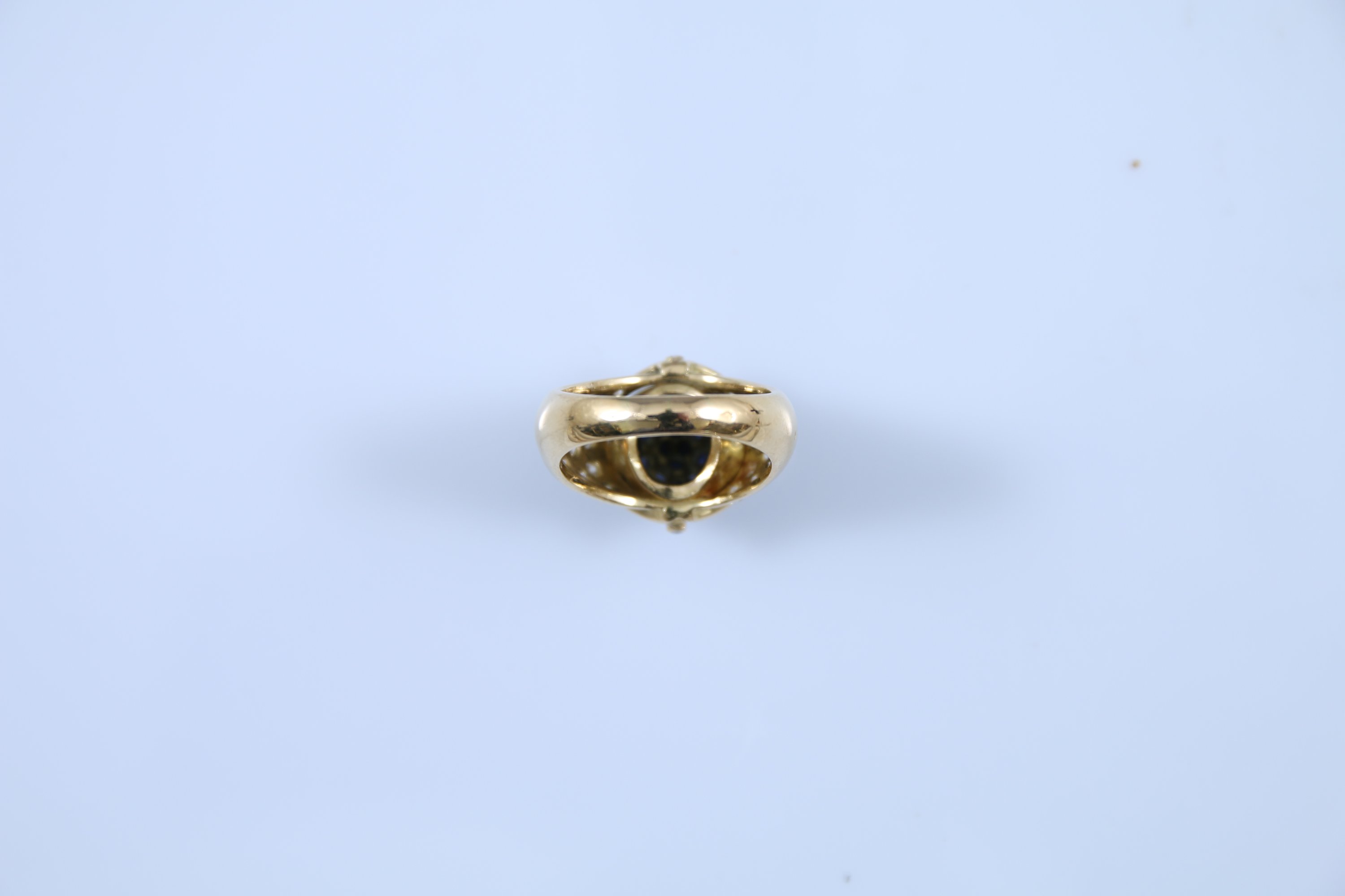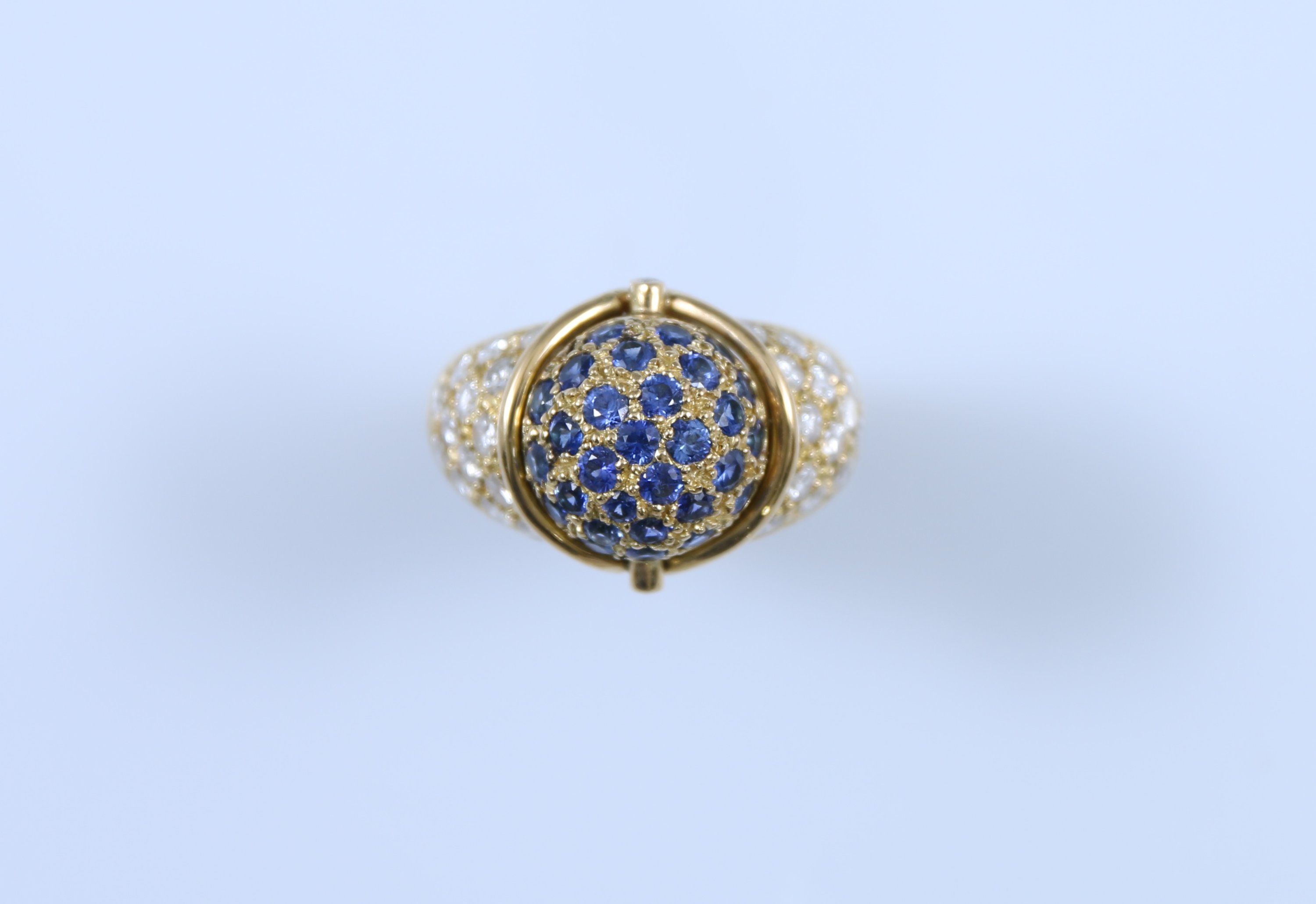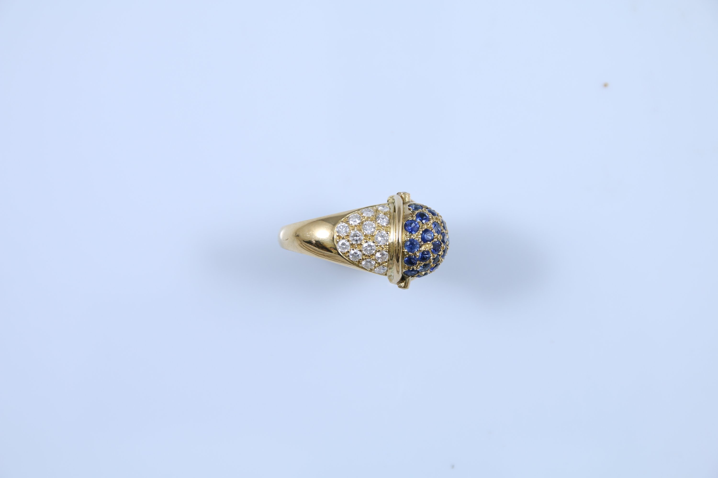 Or jaune 750 millièmes, le centre figurant une demi-sphère sertie de saphirs entre deux pavages de diamants ronds de taille brillant.