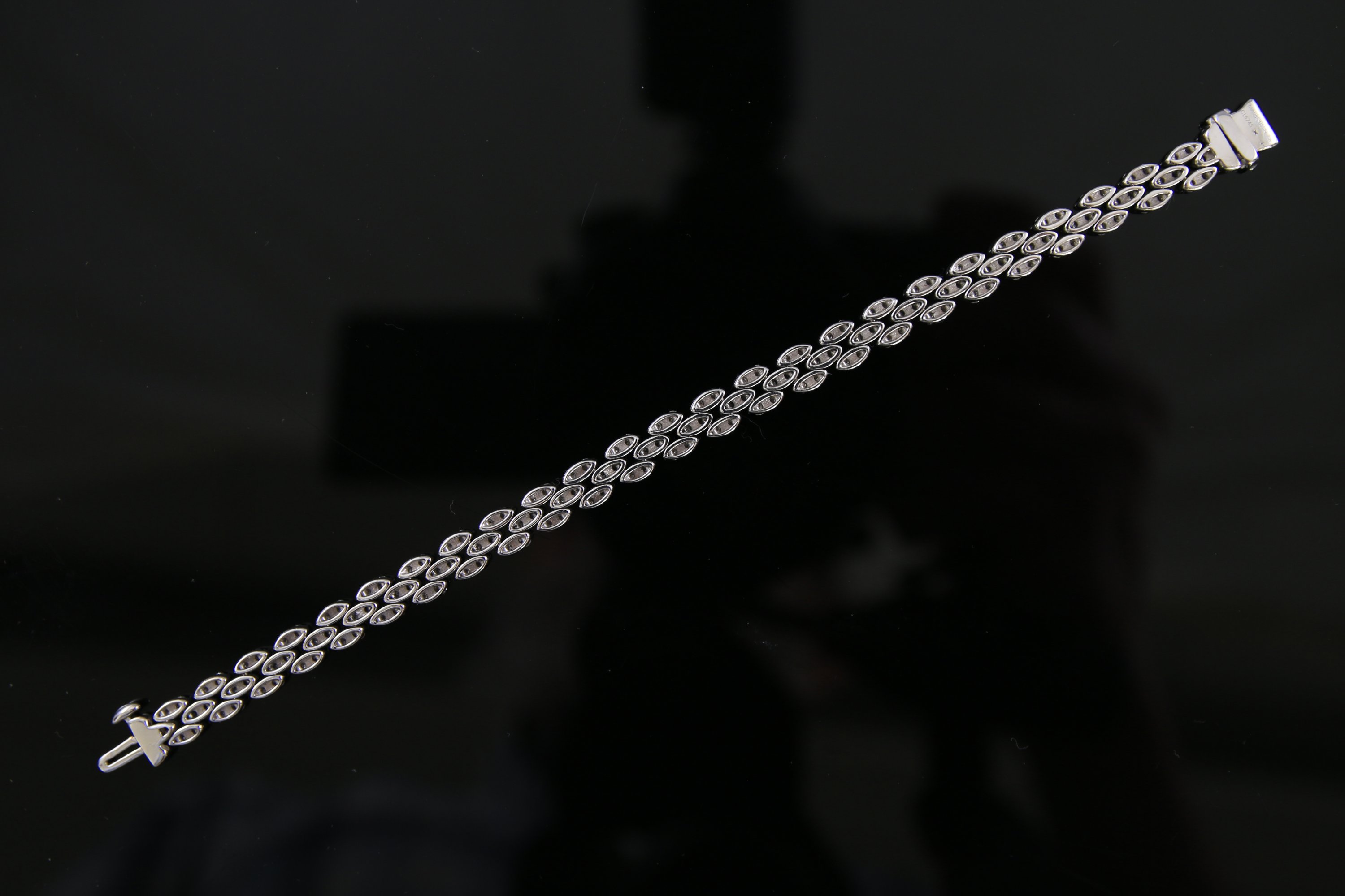 Sécoré de trois lignes de diamants ronds de taille brillant, les maillons de forme navette.
