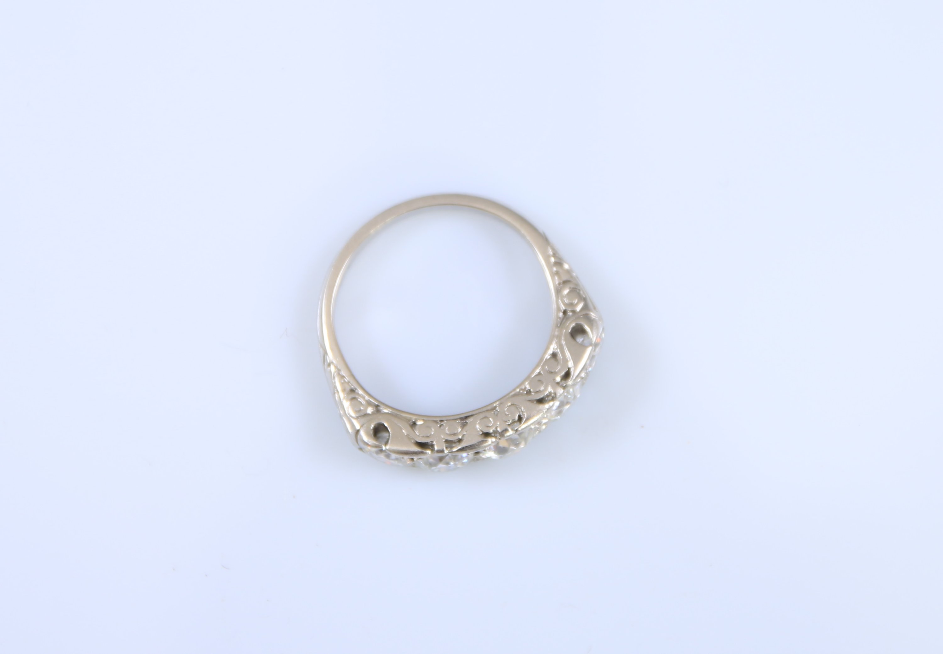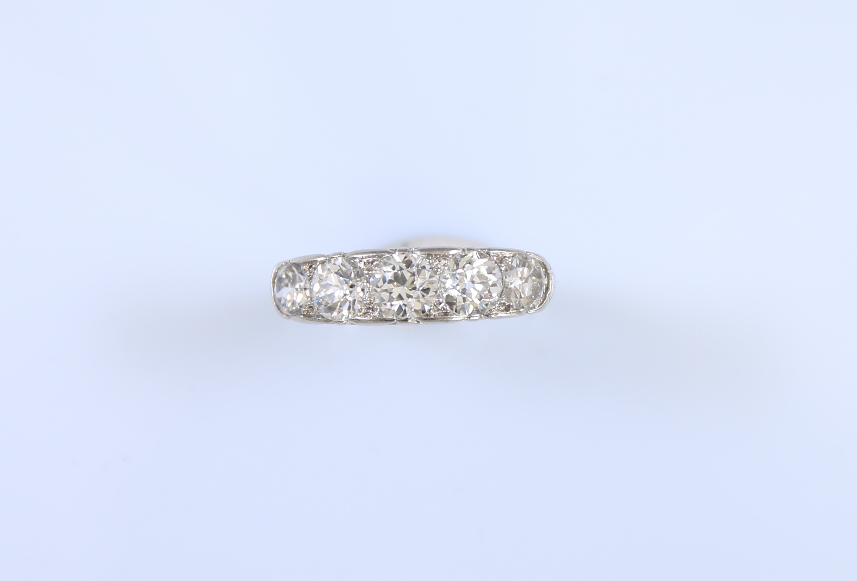 Partiellement gravée à décor d'enroulement, le centre serti d'une ligne de cinq diamants ronds de taille brillant ou de taille ancienne en chute.
