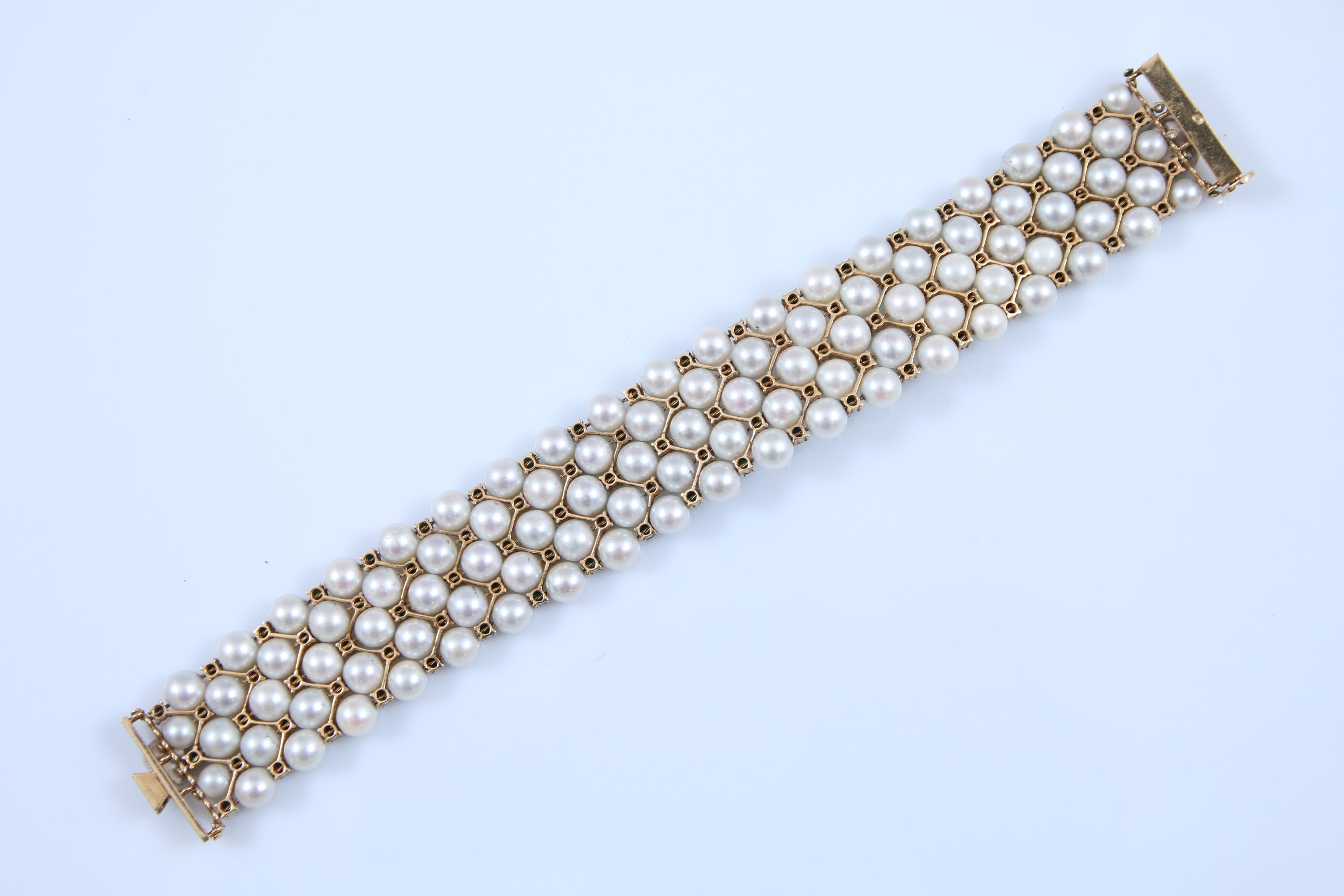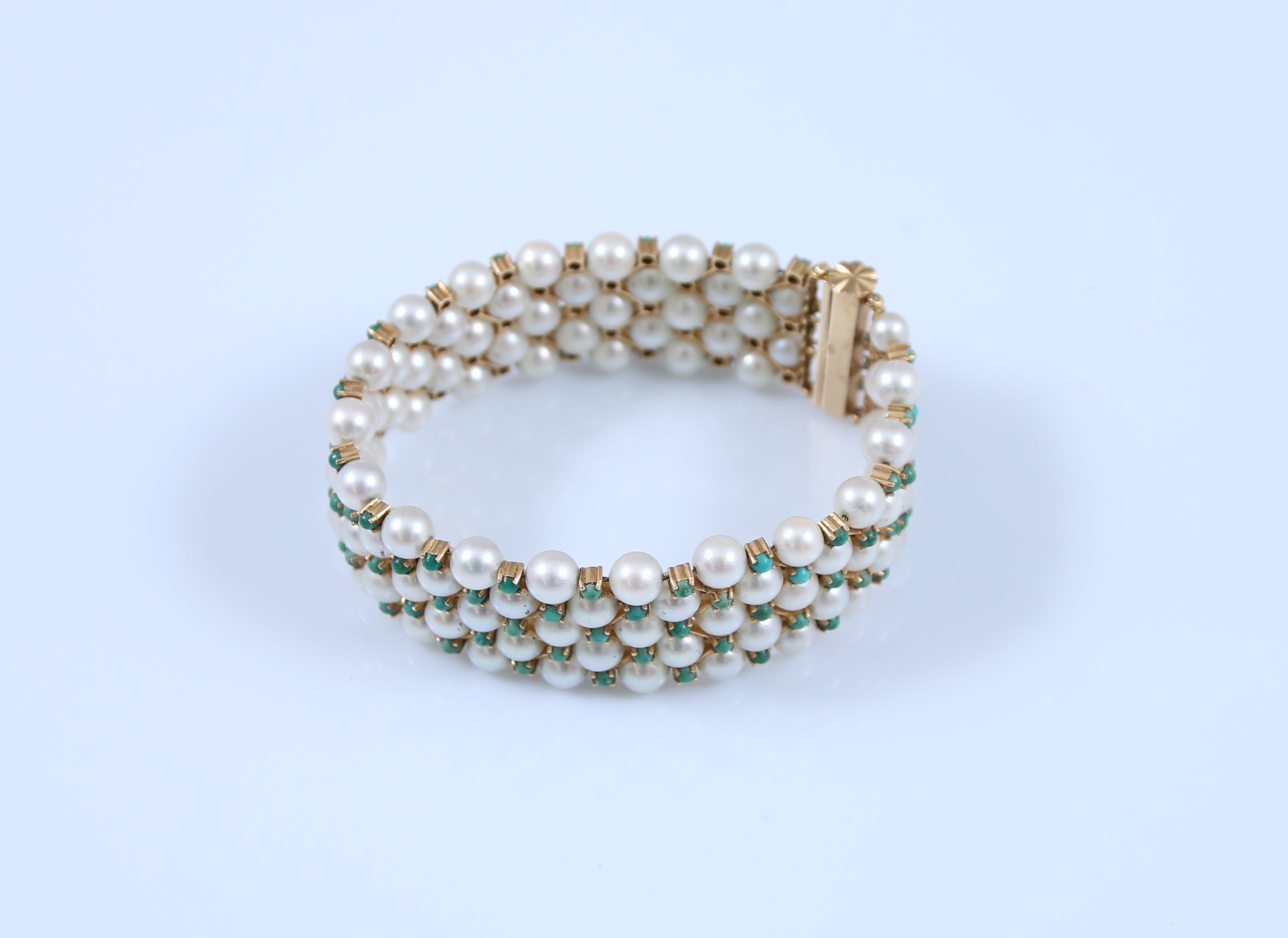 Or jaune 750 millièmes ornée de cinq lignes de perles de culture alternées de pierres vertes de forme cabochon.