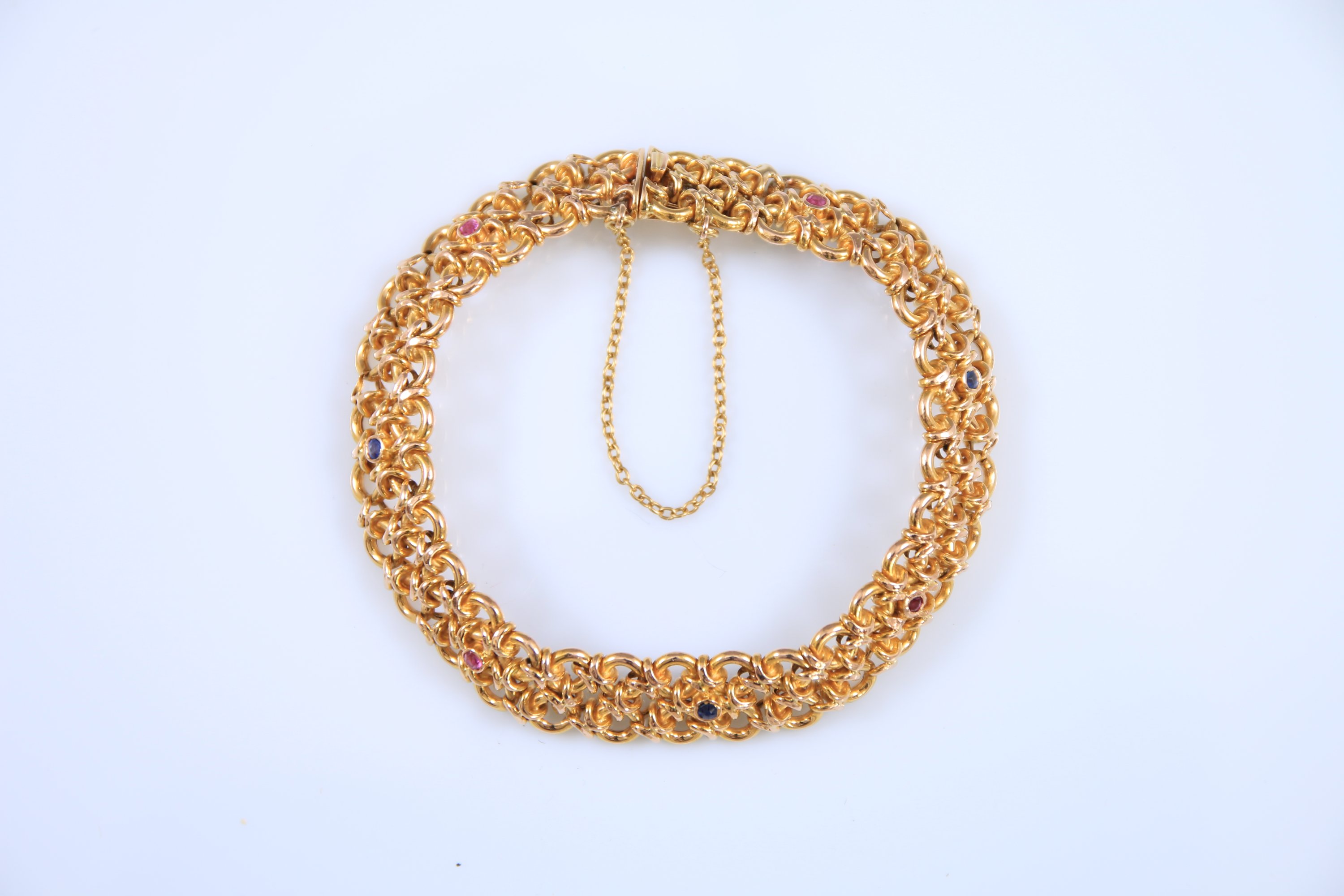Il se compose de motifs quadrilobés articlés ornés de pierres fines. Chainette de sécurité.
