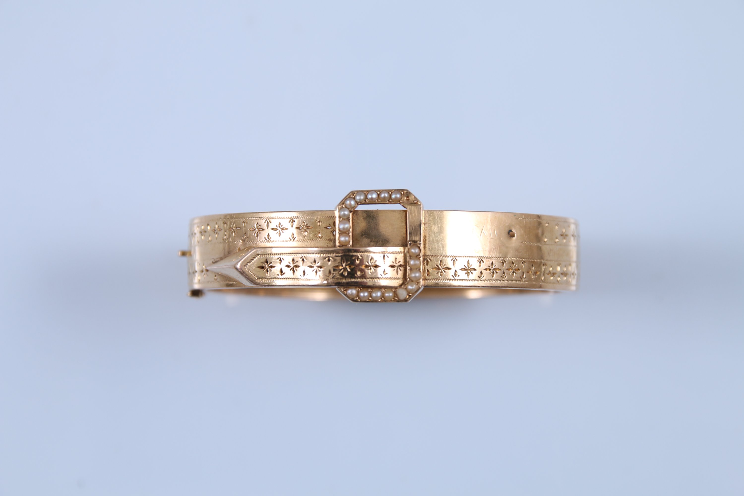 Or jaune 750 millièmes, orné d'une boucle sertie de semences de perles.