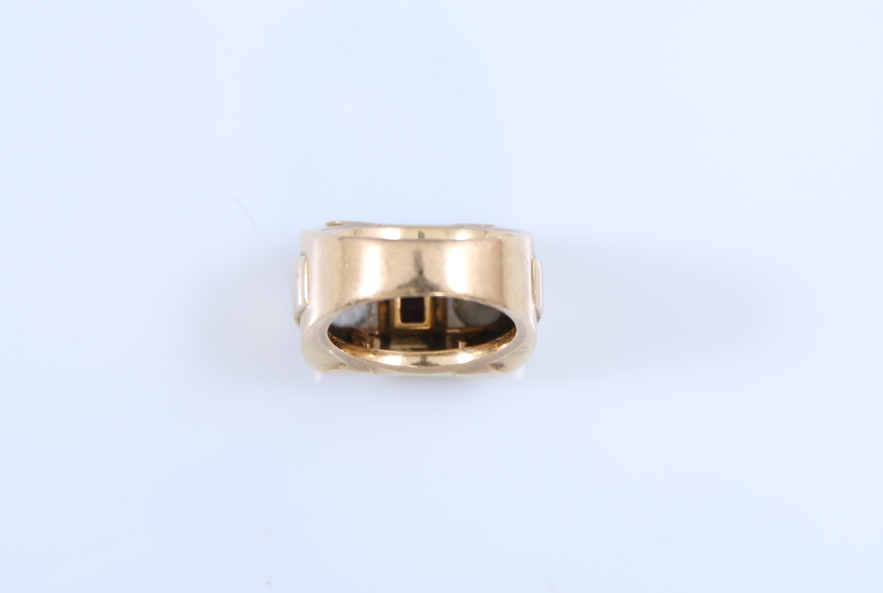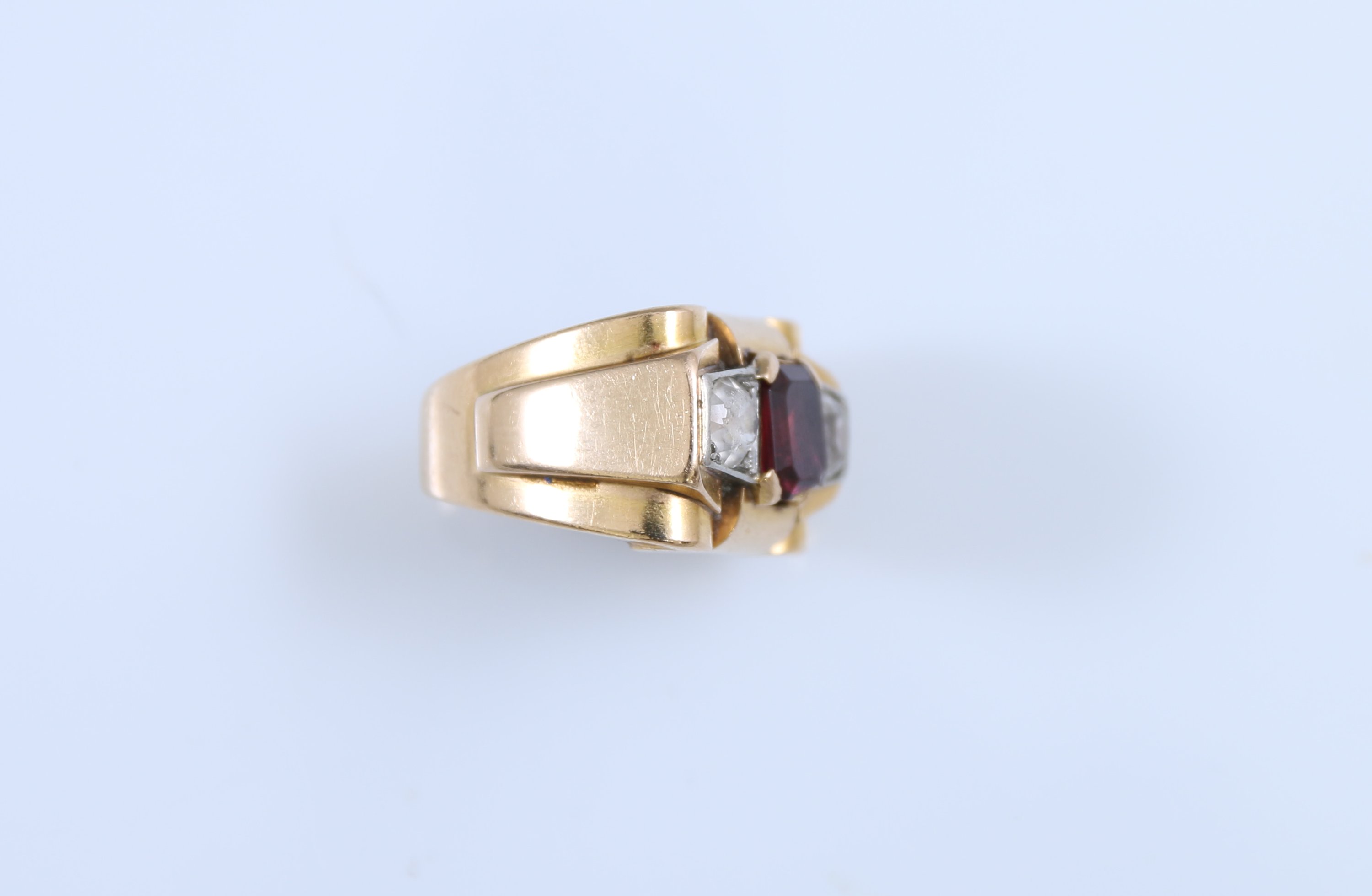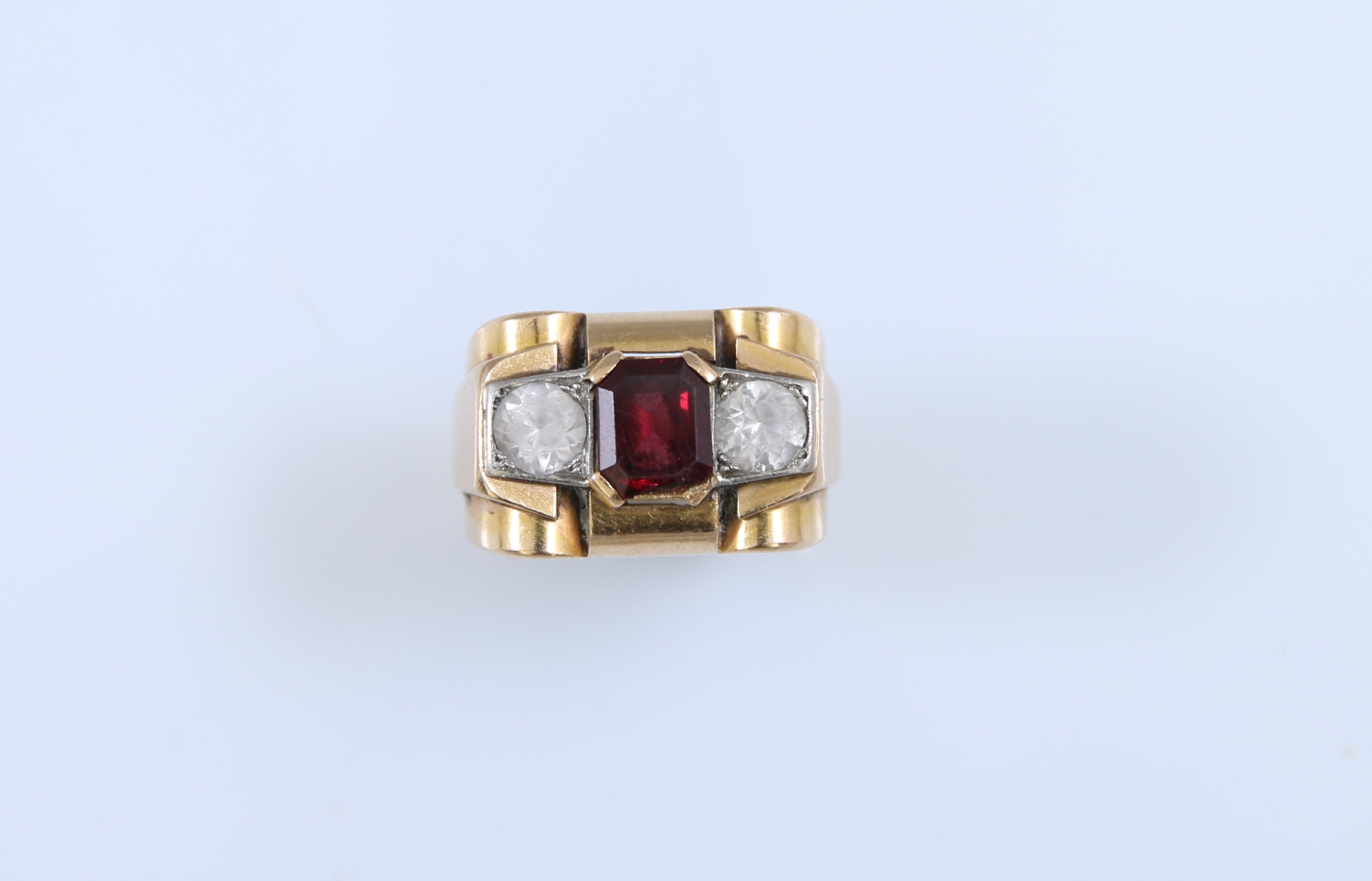 Or jaune 750 millièmes, sertie d'une pierre rouge et deux pierres blanches à l'imitation de diamants.