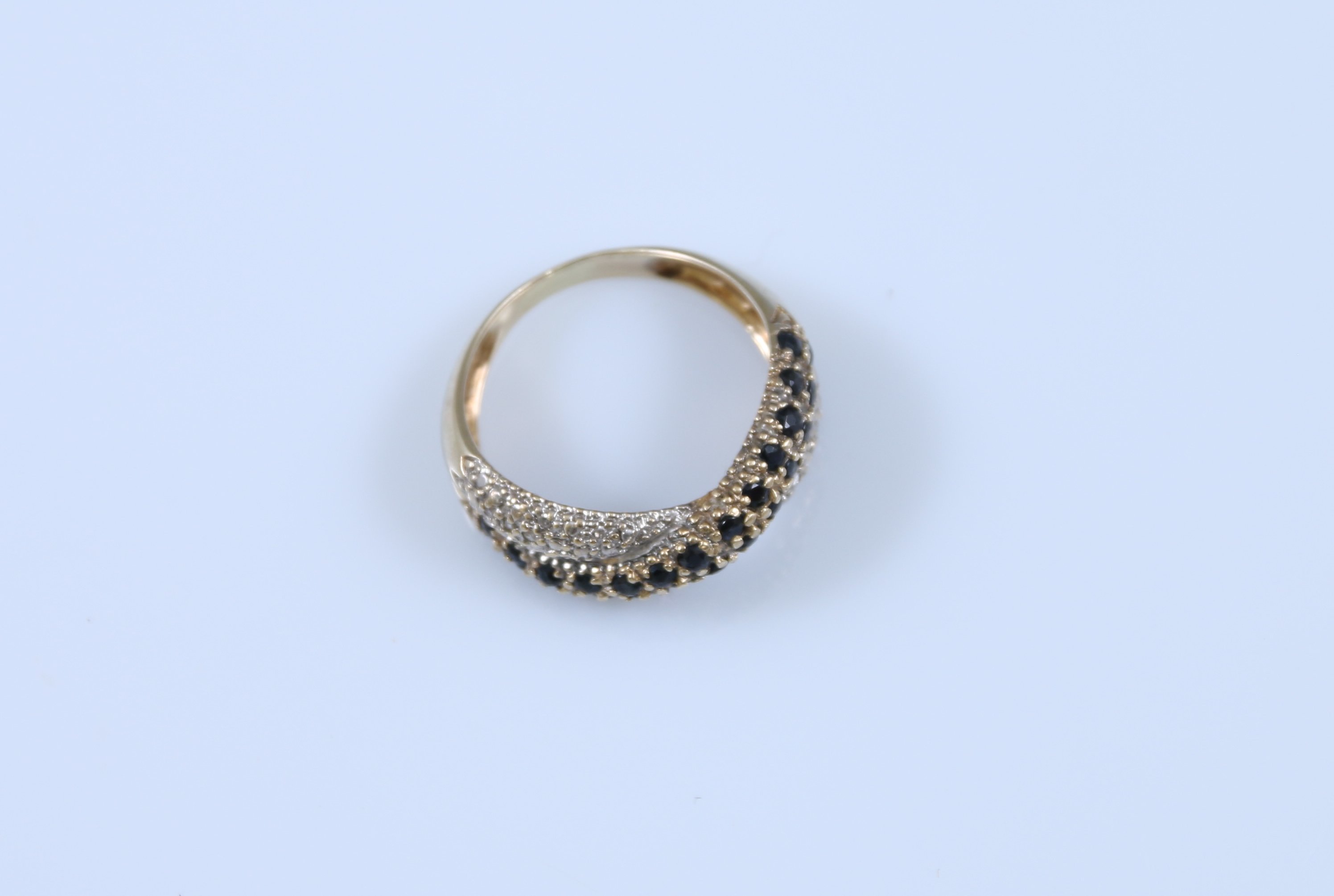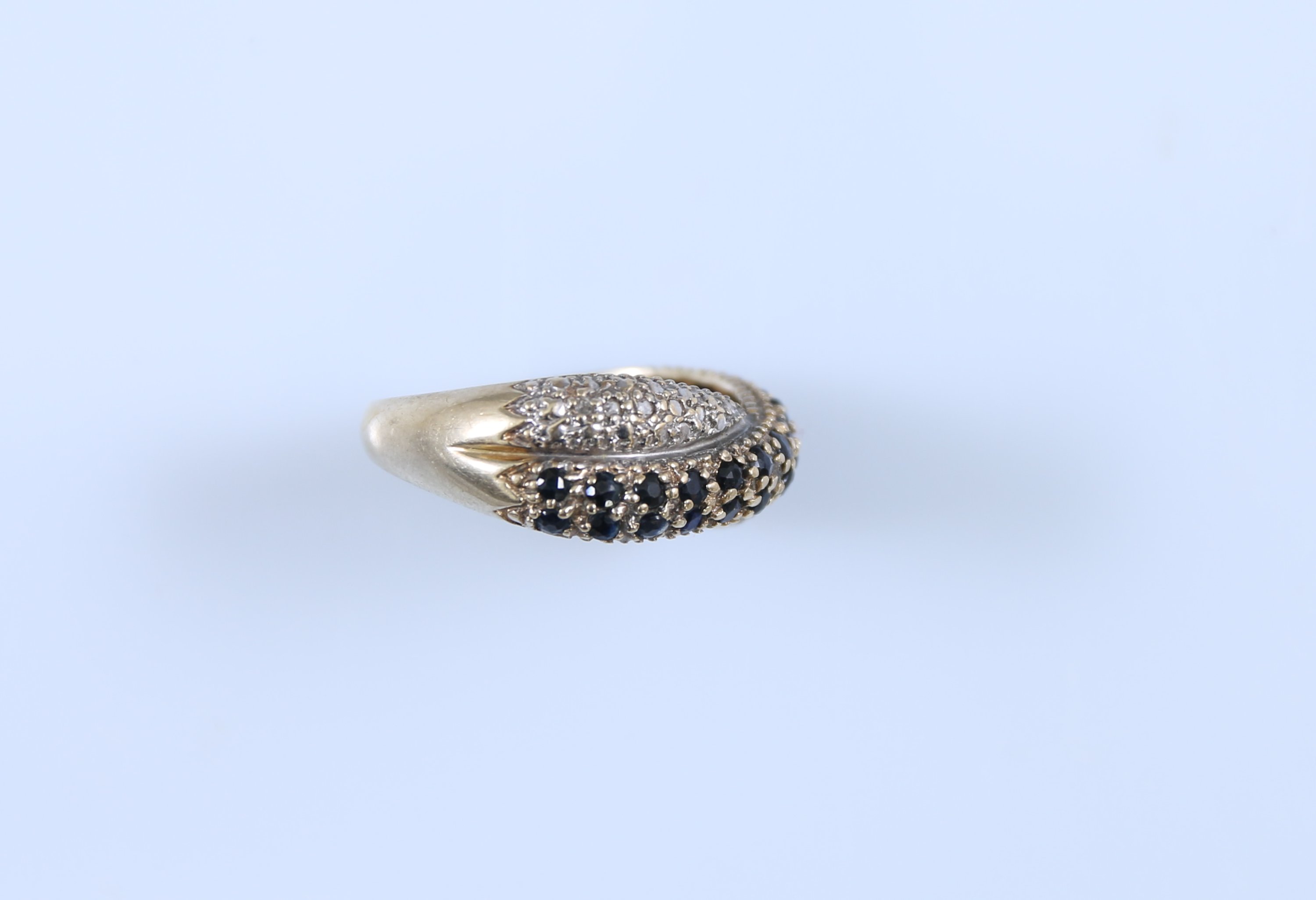 Sertie de pierres bleues et pierres blanches de forme à simuler deux anneaux entrelacés.