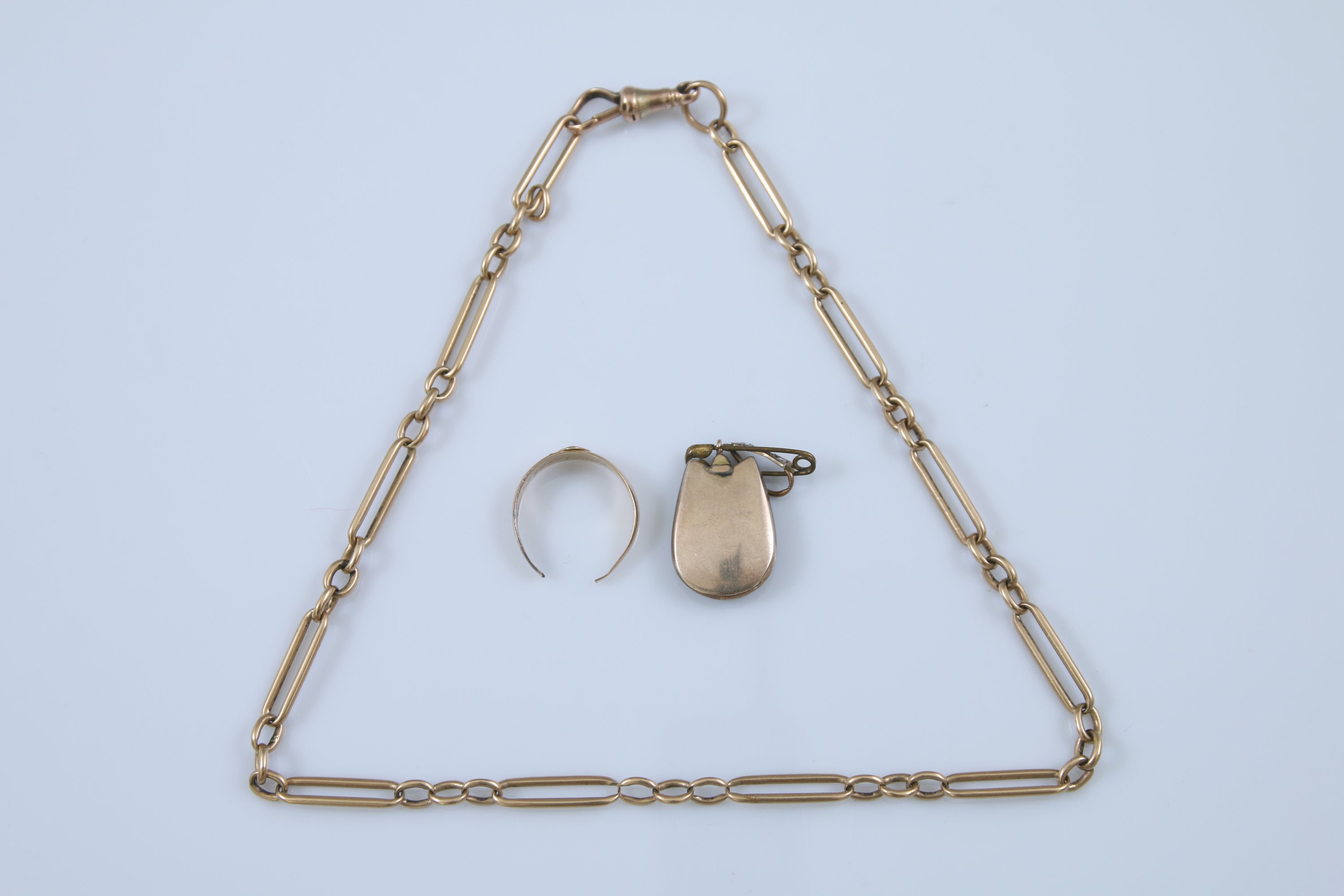 Comprenant une bague (coupée), un médaillon dans le goût de l'Egypte, une chaine à maille cheval et un élément.