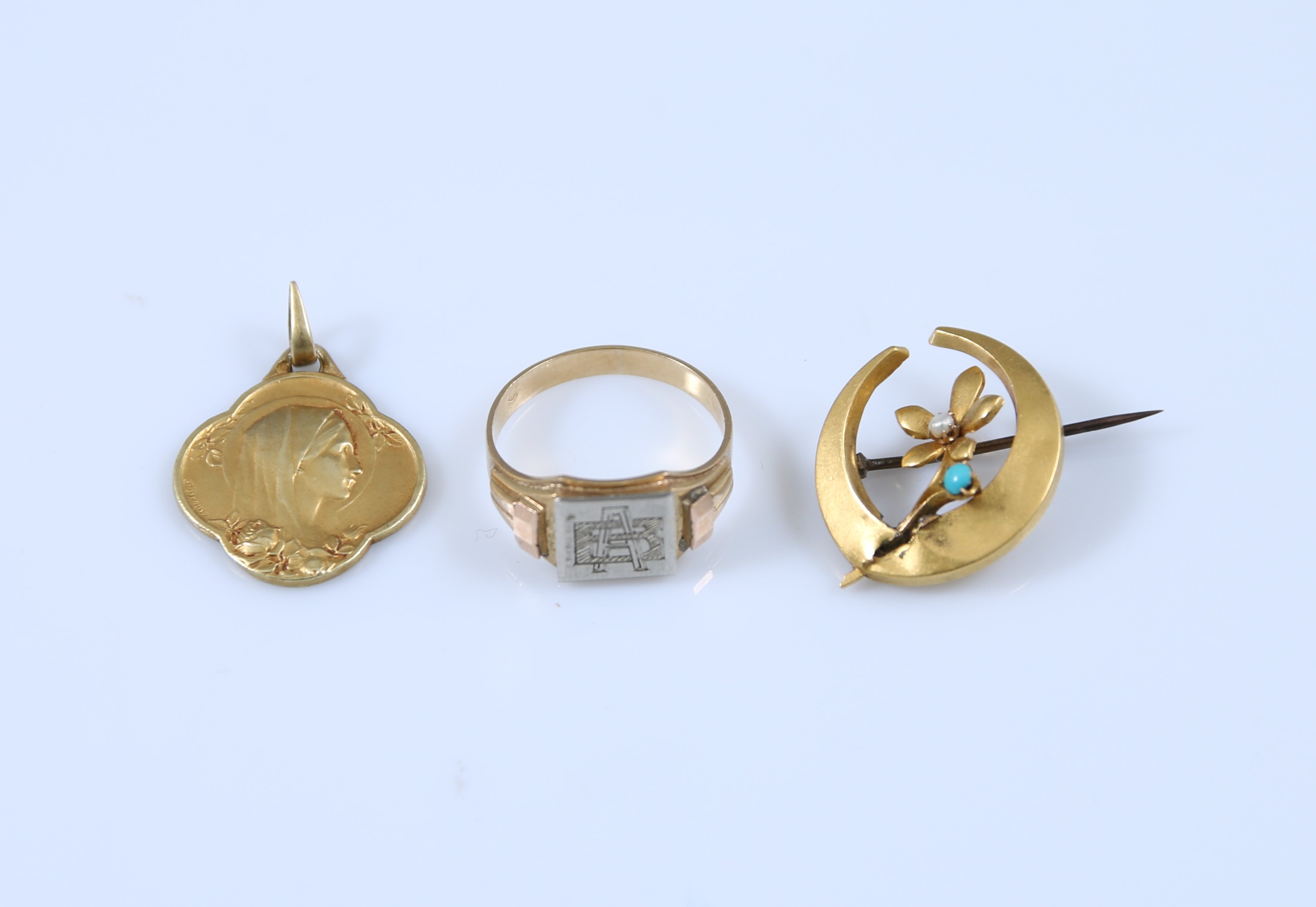 Petits bijoux comprenant: une chevalière, une médaille religieuse et broche