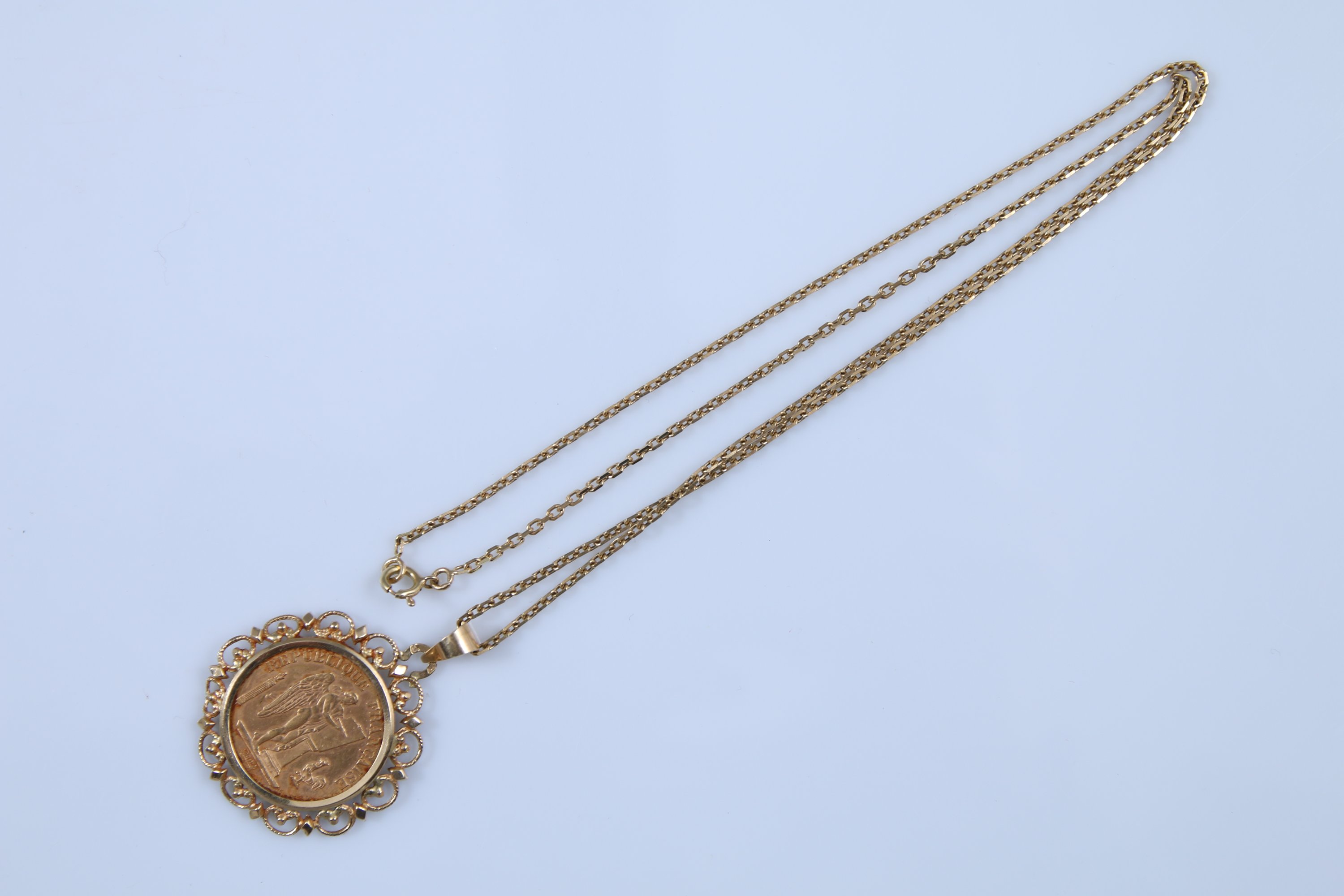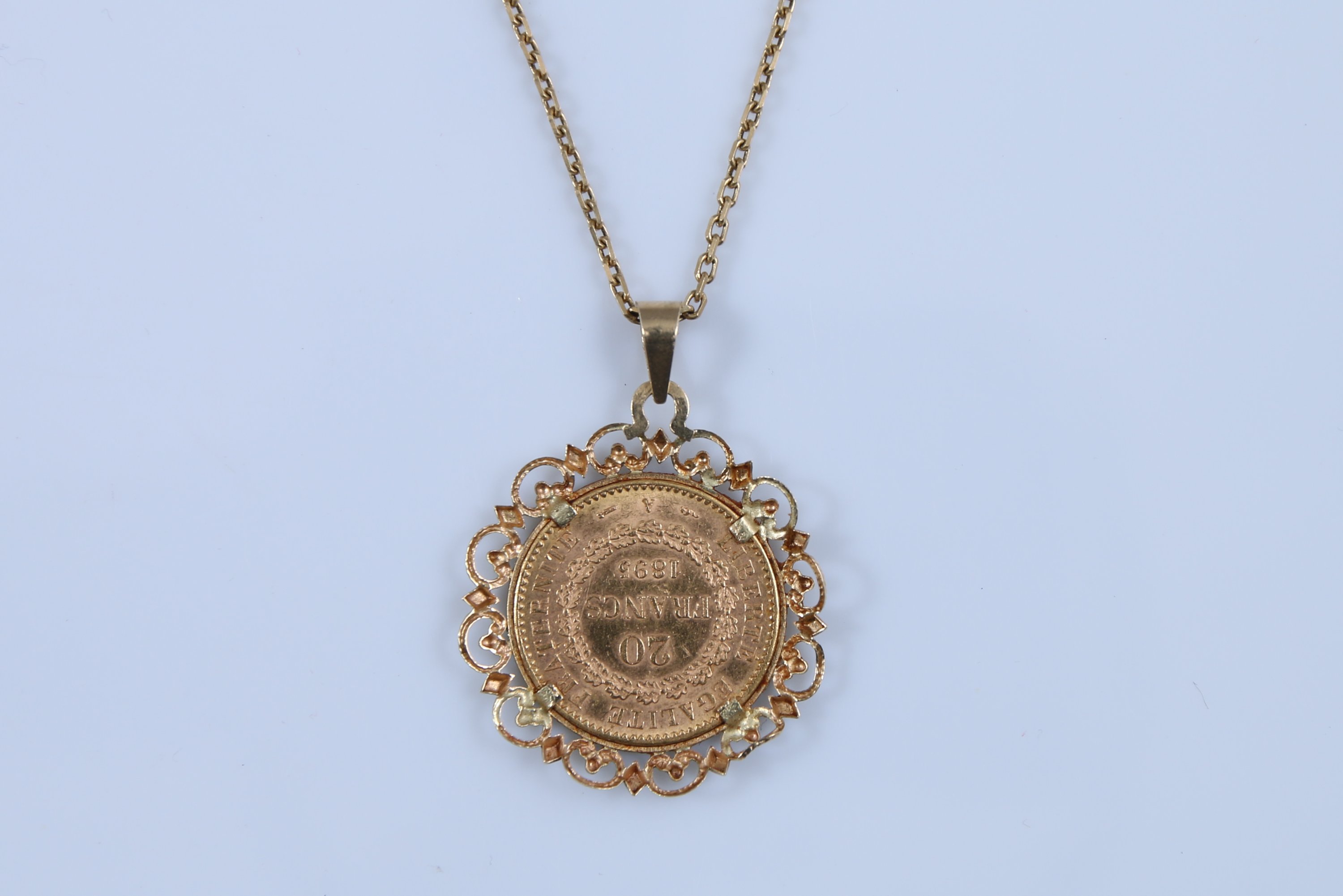 Le pendentif serti d'une pièce de 20 francs or Génie de la République, 1895, Paris.