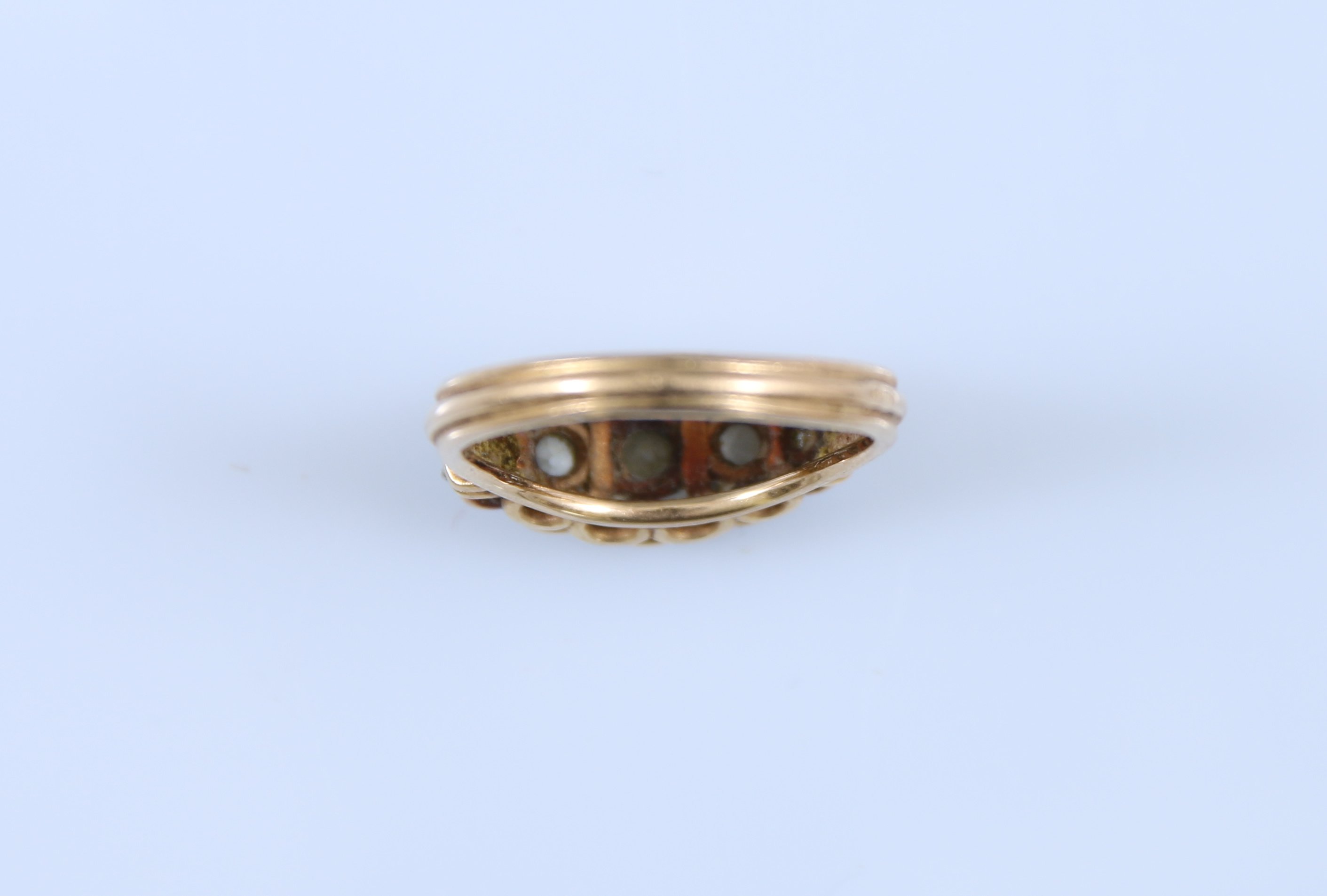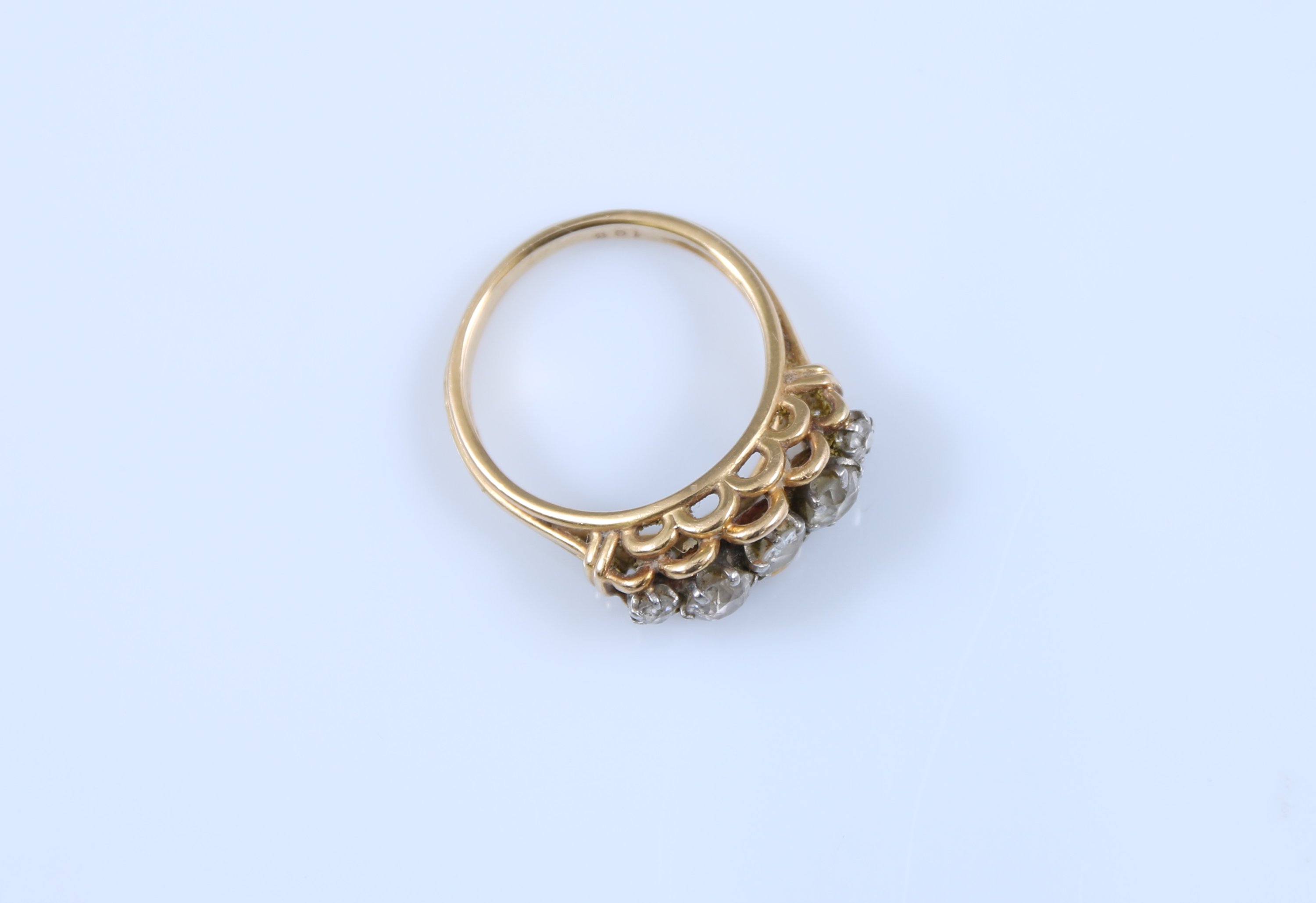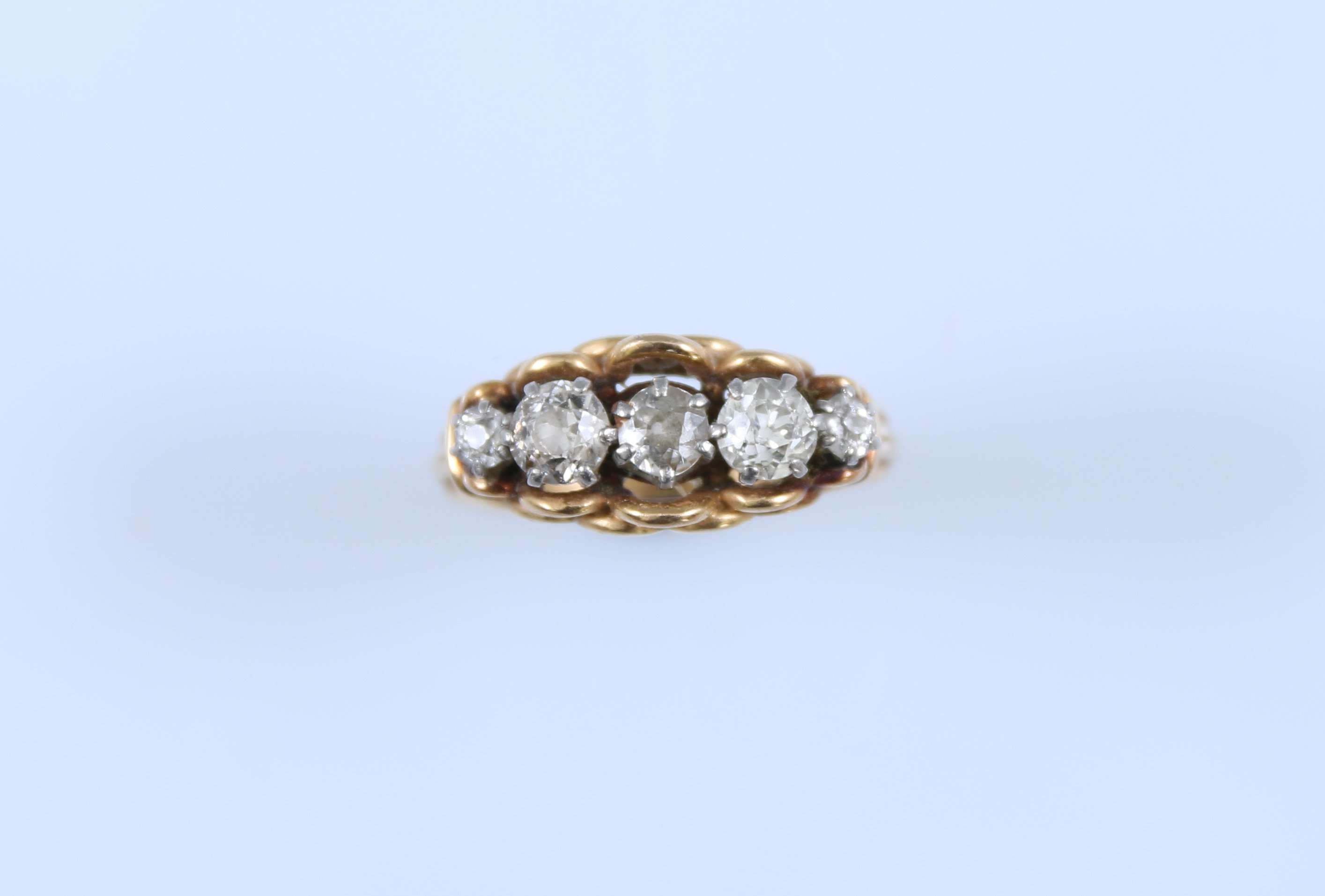 Or jaune 750 millièmes ornée de cinq diamant de taille ancienne en ligne.