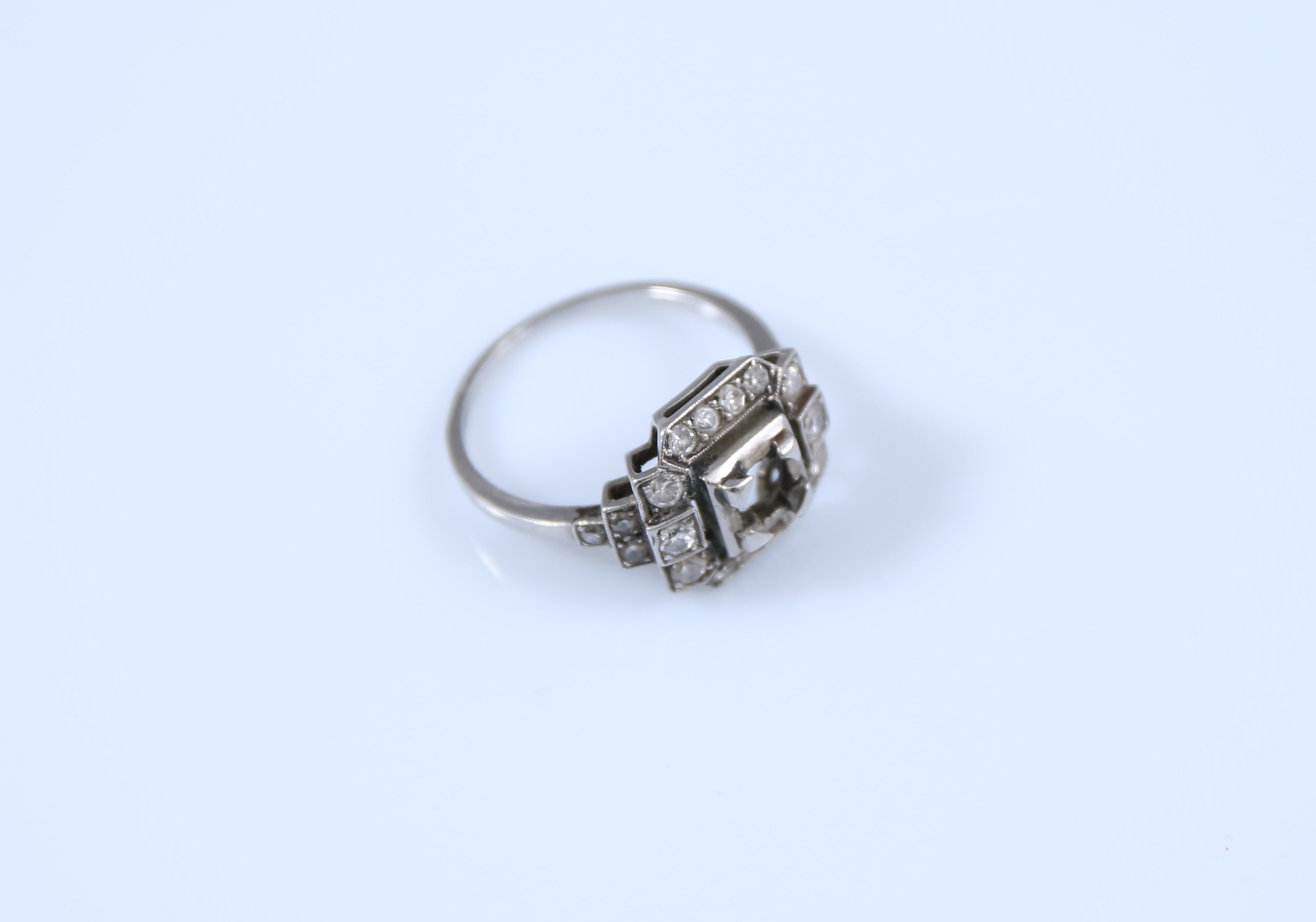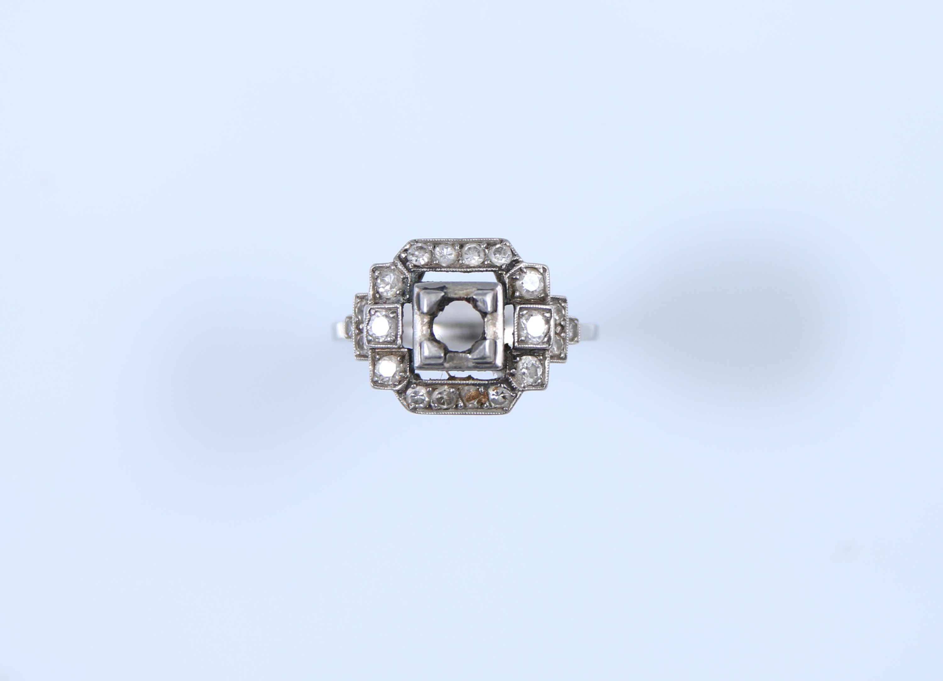 Joint: une monture de bague en platine sertie de brillants. Poids brut: 4,2 g.