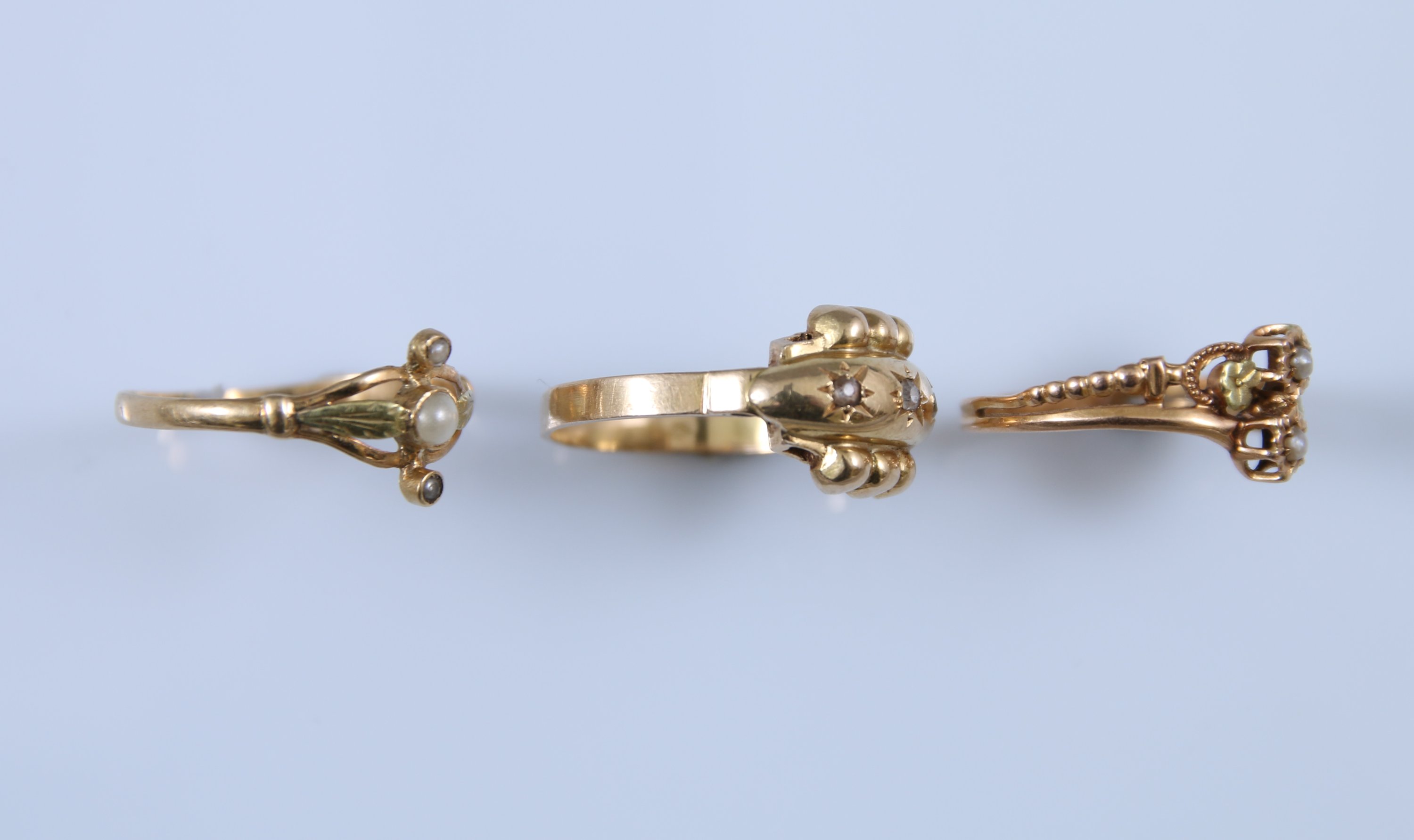 Deux sont serties de petites perles et la dernière est ornée de pierres blanches.