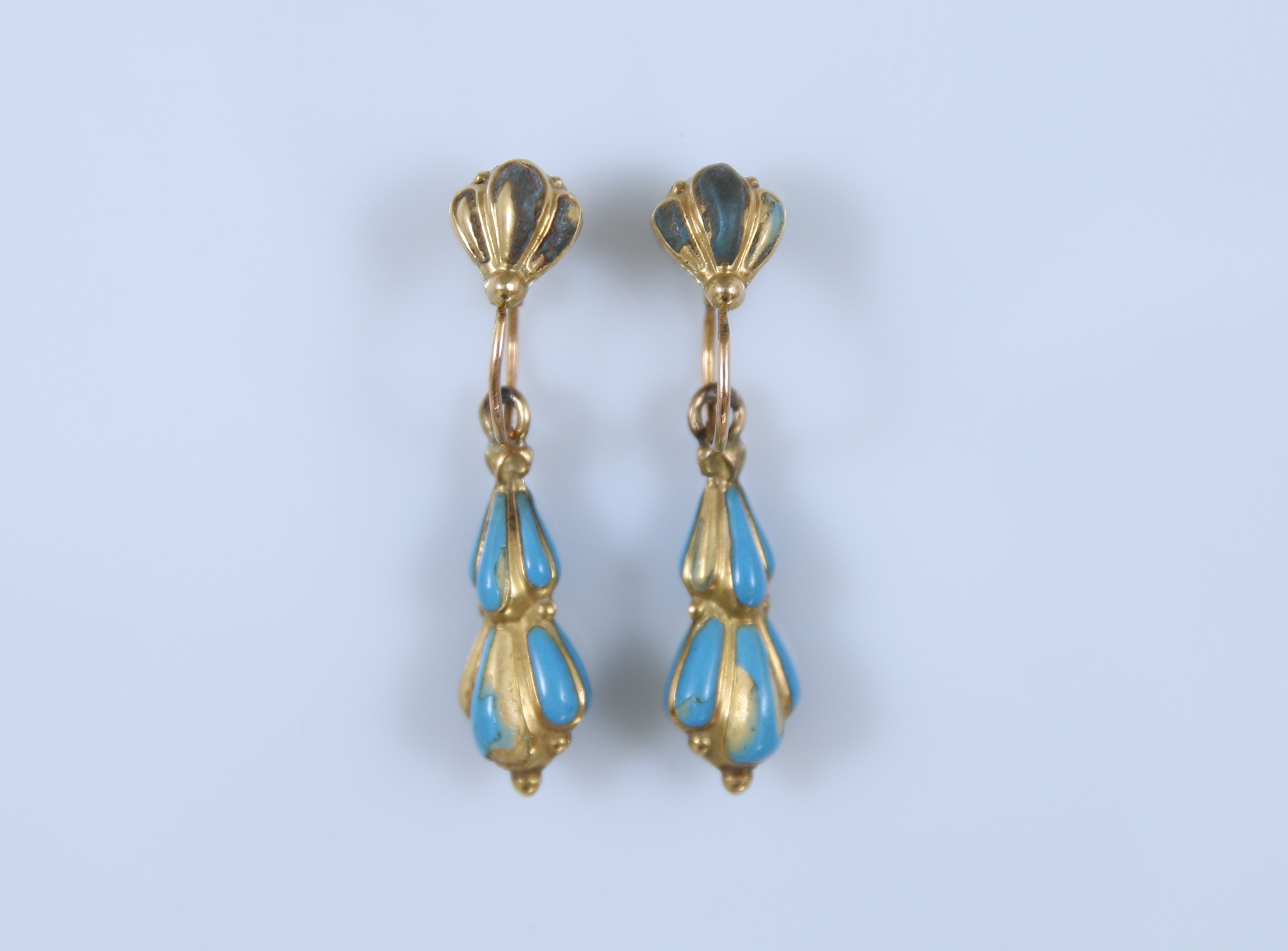 Joint: Paire de boucles d'oreilles en or jaune 750 millièmes émaillées à l'imitation de turquoise. Poids brut: 1,4 g. Haut. 3,2 cm. (manques à l'émail)