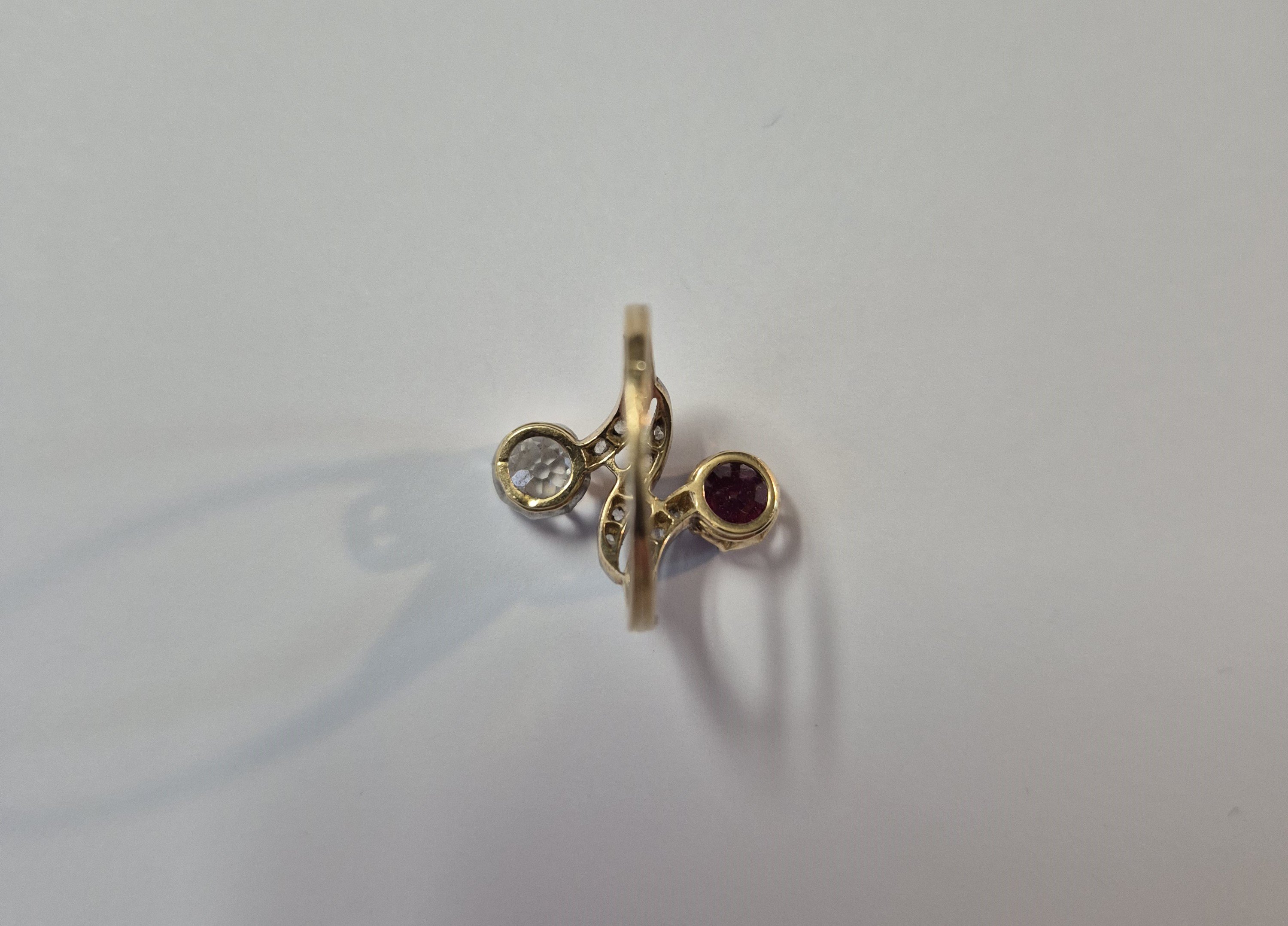 Or jaune 750 millièmes et platine 850 millièmes, ornée d'un rubis traité et d'un diamant rond demi-taille entre des lignes de diamants taillés en rose.