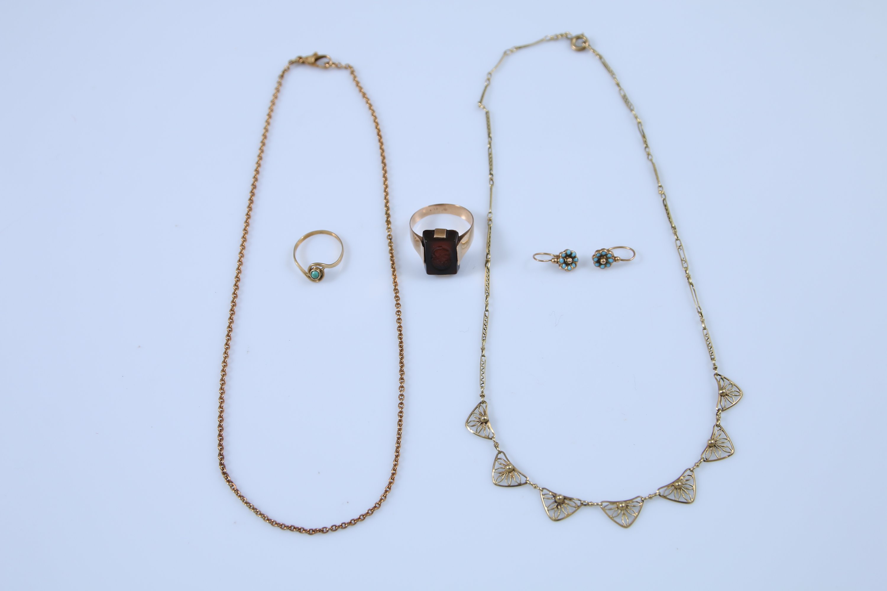 - Deux chaines, l'une à mailles forçat et l'autre à mailles filigranées et décor en chute. Long. 37,5 et 39 cm.